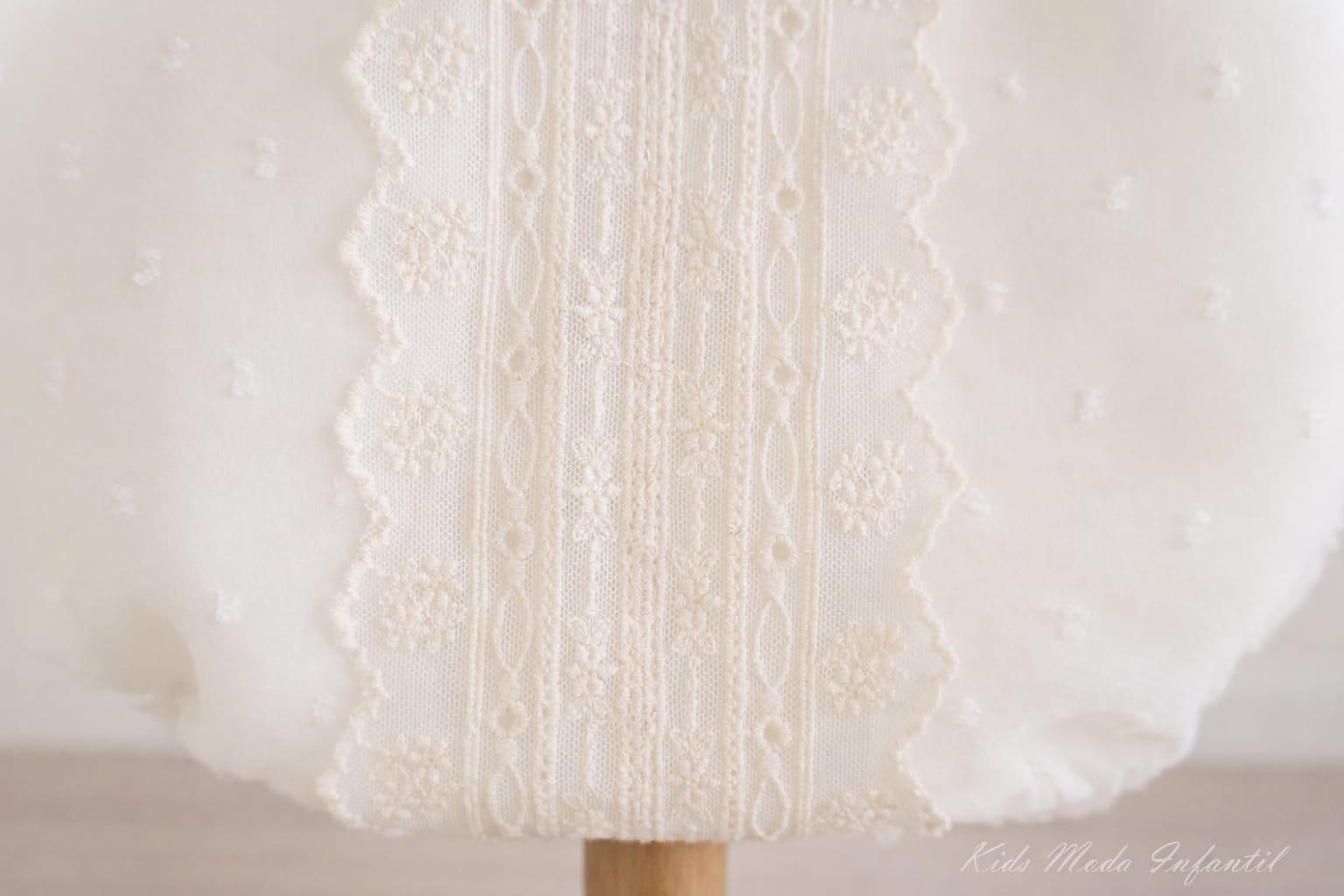 Confeccionado en tejido plumeti de altísima calidad, presenta un delantero decorado con puntillas bordadas en tono marfil, formando un precioso panel central rematado con ondas y un delicado lazo de raso que aporta un toque distinguido. Sus mangas largas ofrecen un estilo clásico y cómodo, ideal para cualquier estación del año.