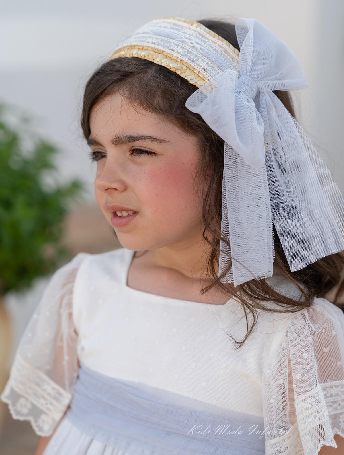 Vestido de ceremonia y arras niña en tul beige de topito, con mangas murciélago, cuello cuadrado, escote a pico y fajín de tul azul grisáceo.