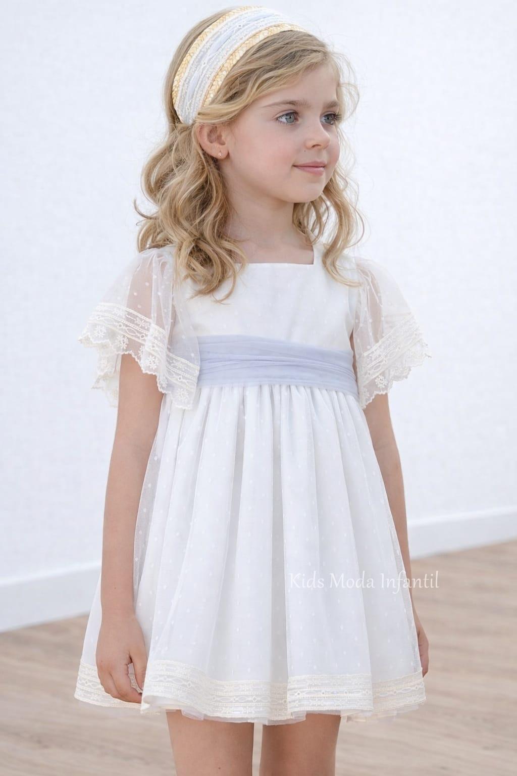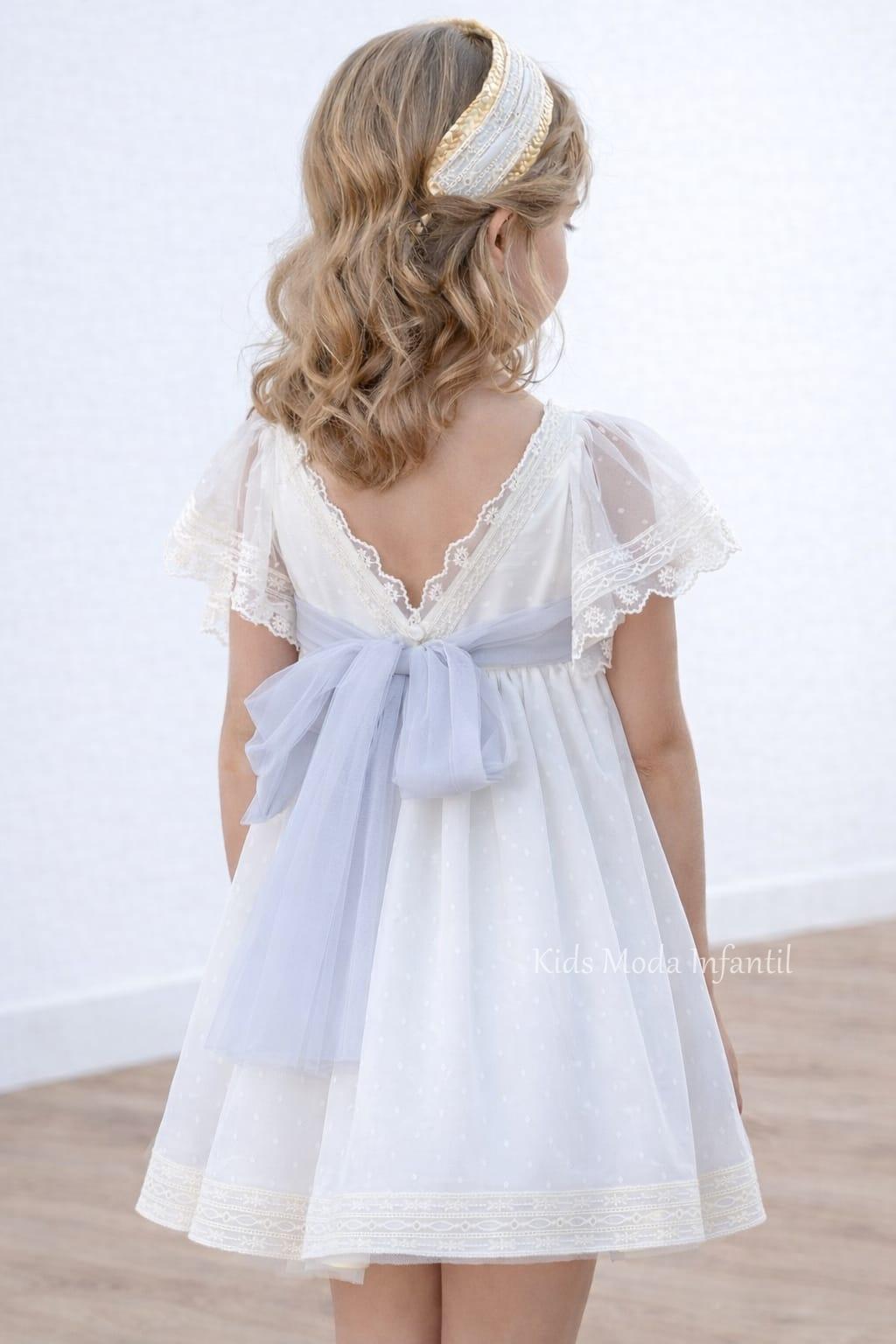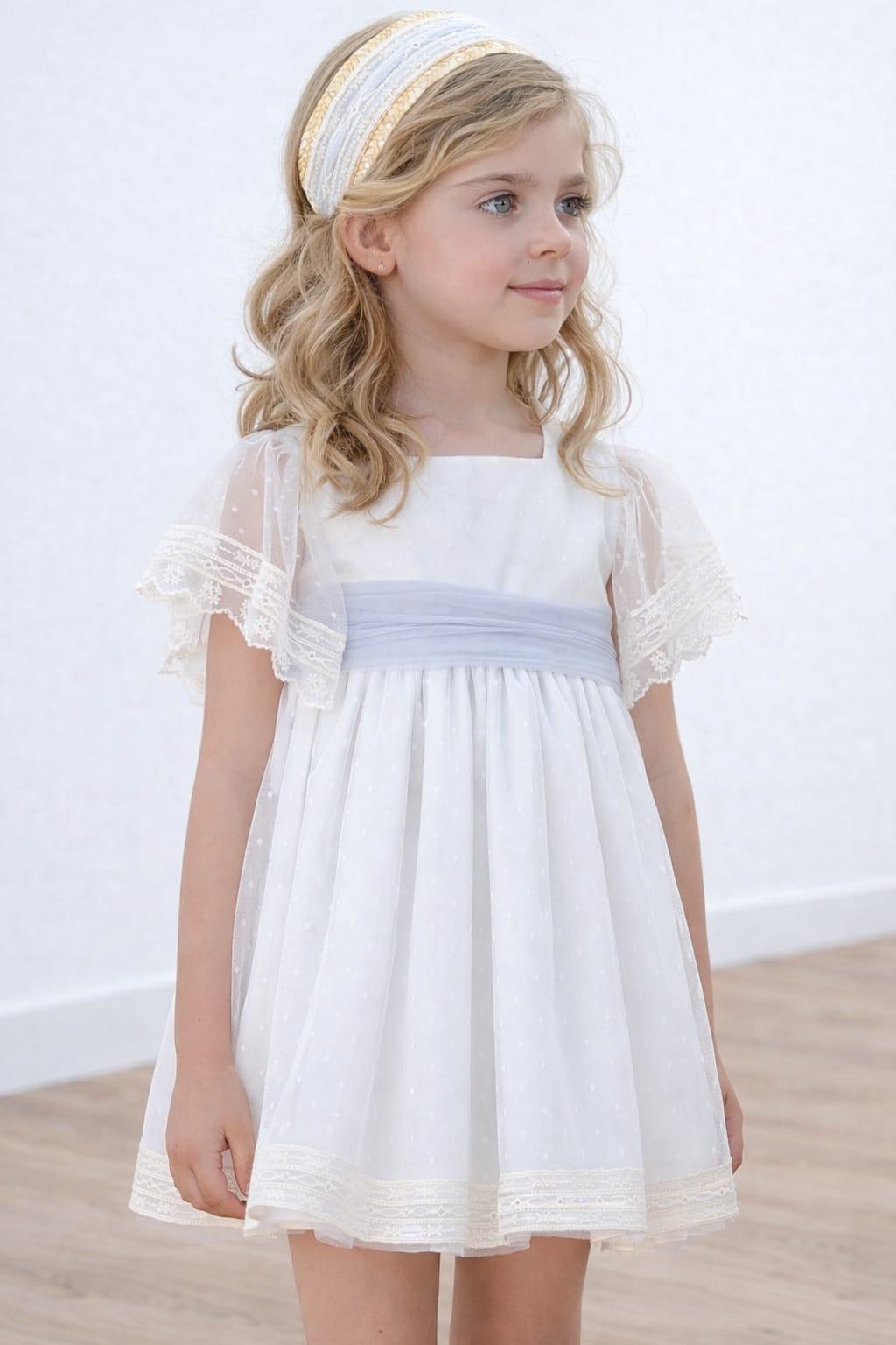 Vestido de ceremonia y arras niña en tul beige de topito, con mangas murciélago, cuello cuadrado, escote a pico y fajín de tul azul grisáceo.