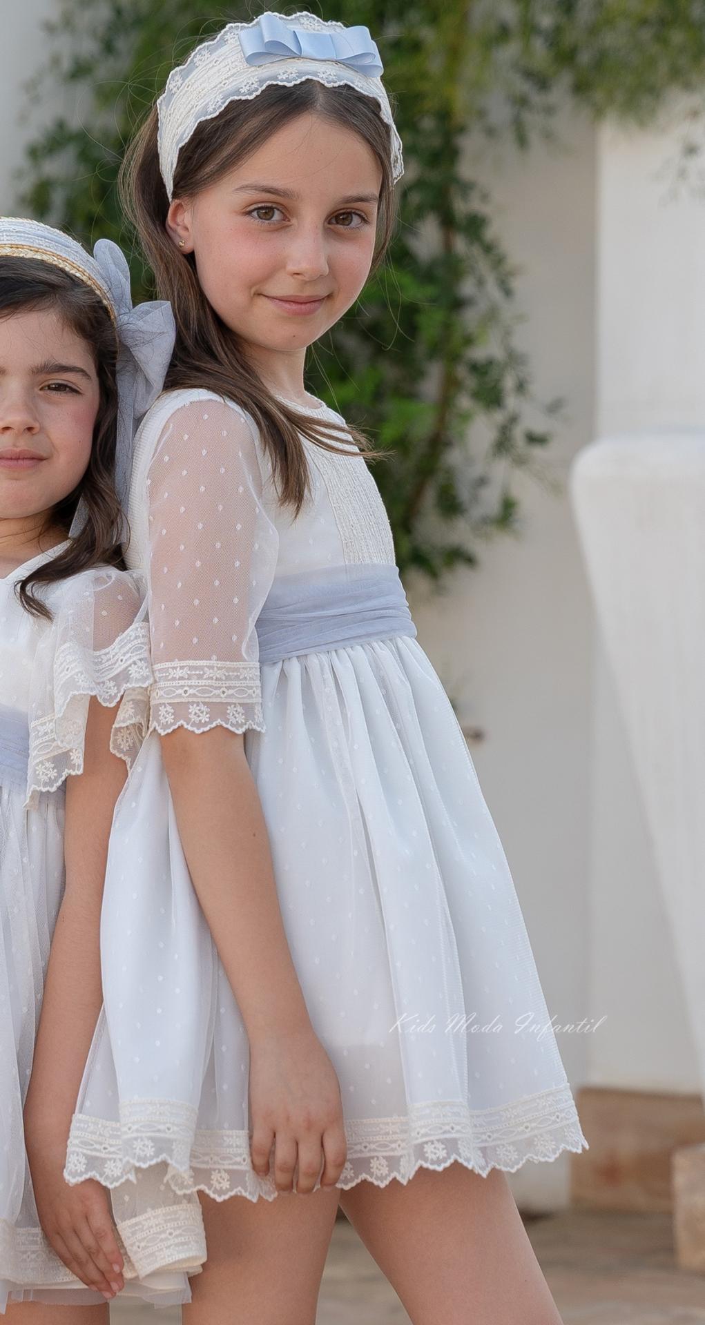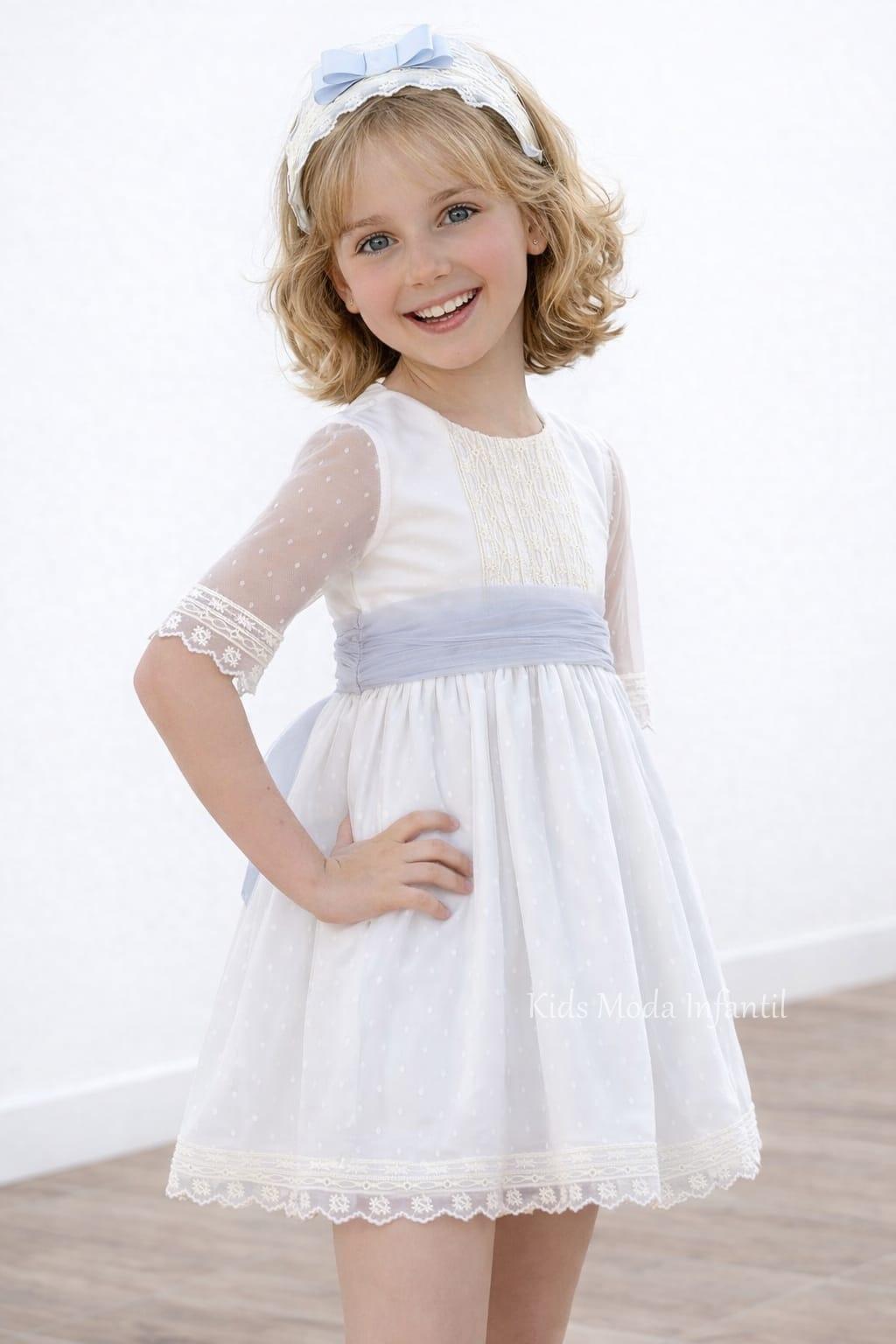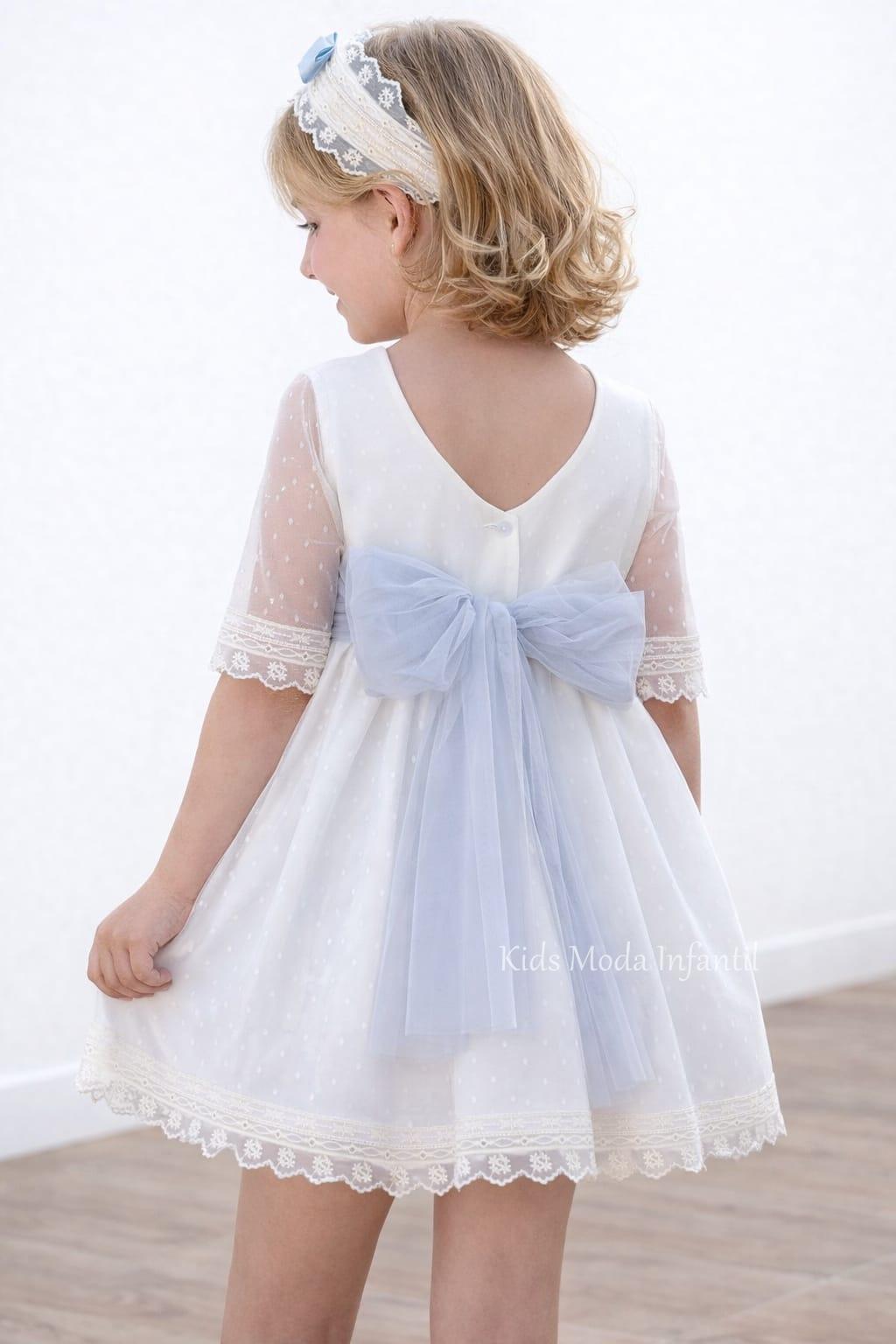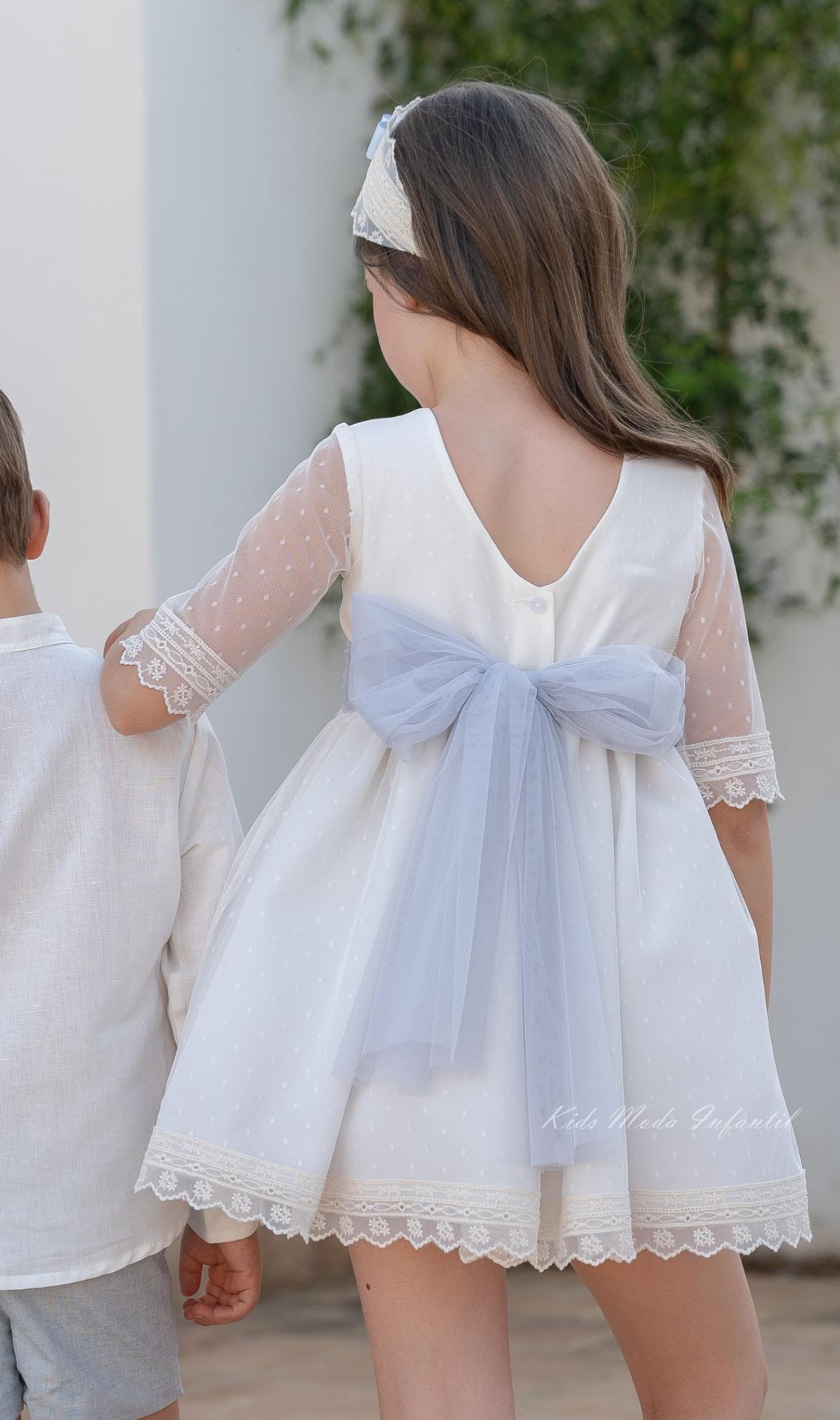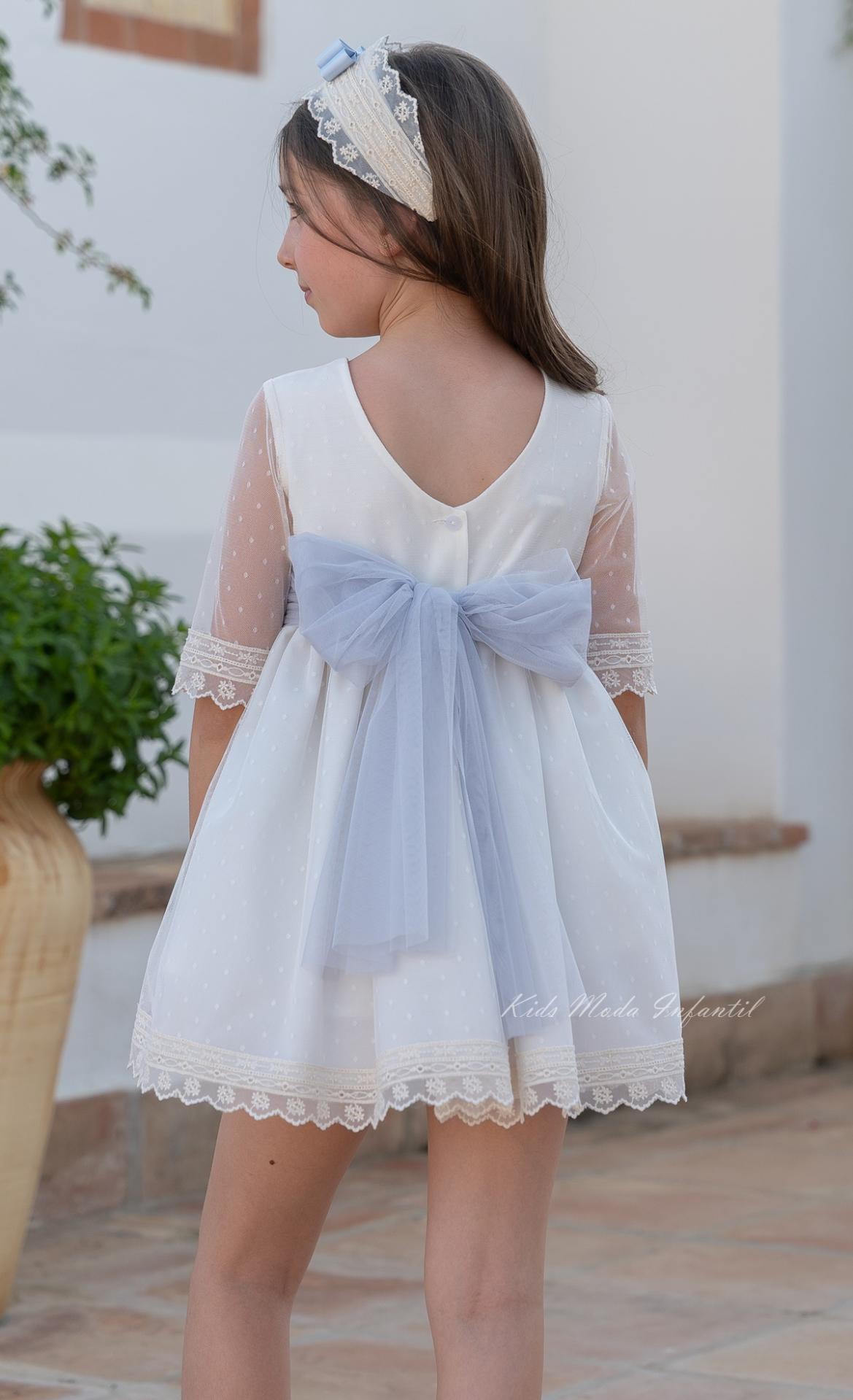 El cuerpo presenta media manga en tul de topito, rematada con puntilla a juego, y un cuello redondeado en el delantero que aporta dulzura y sencillez. En la espalda luce un precioso escote a pico, uno de los detalles más especiales del diseño, que aporta elegancia sin perder la esencia infantil.