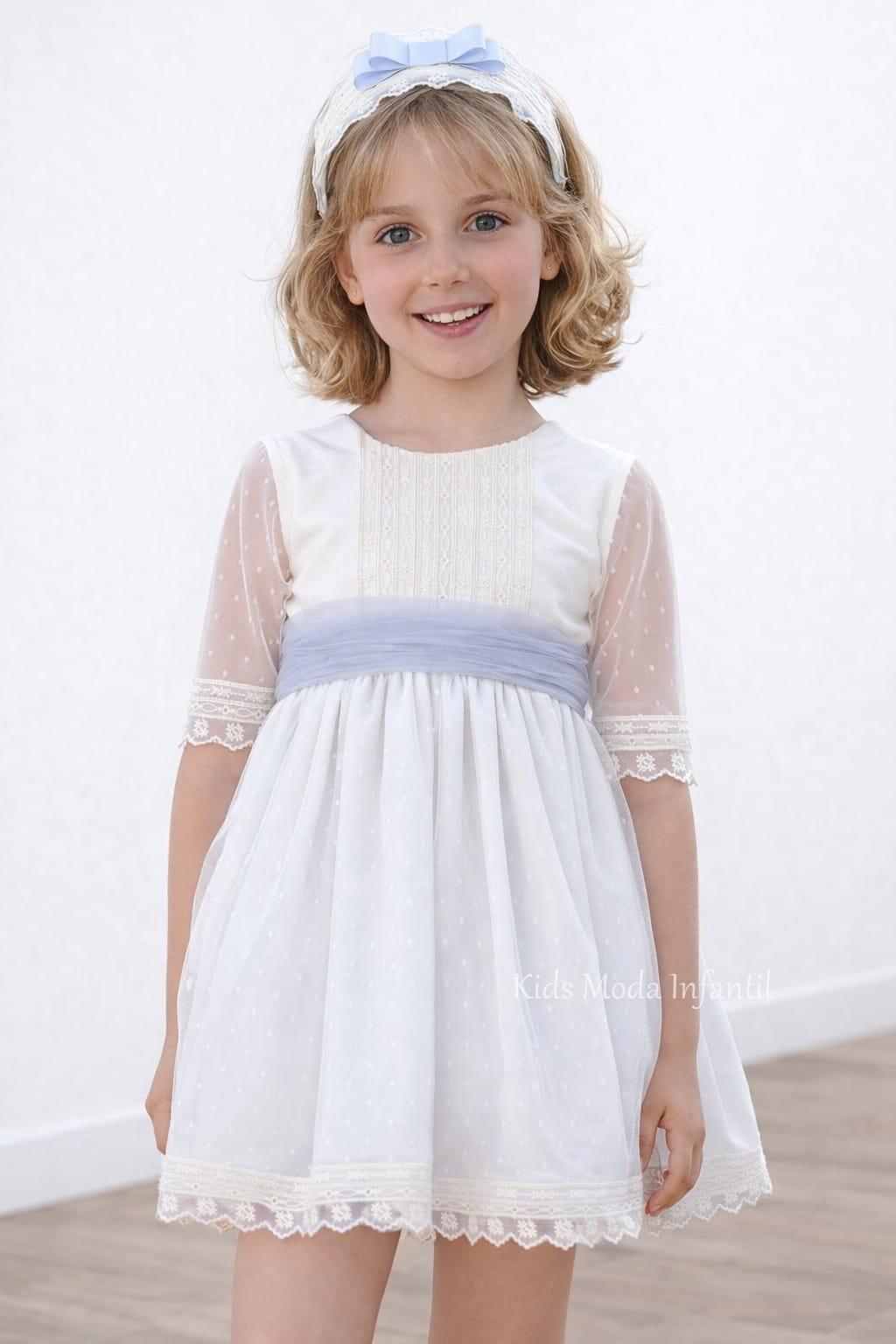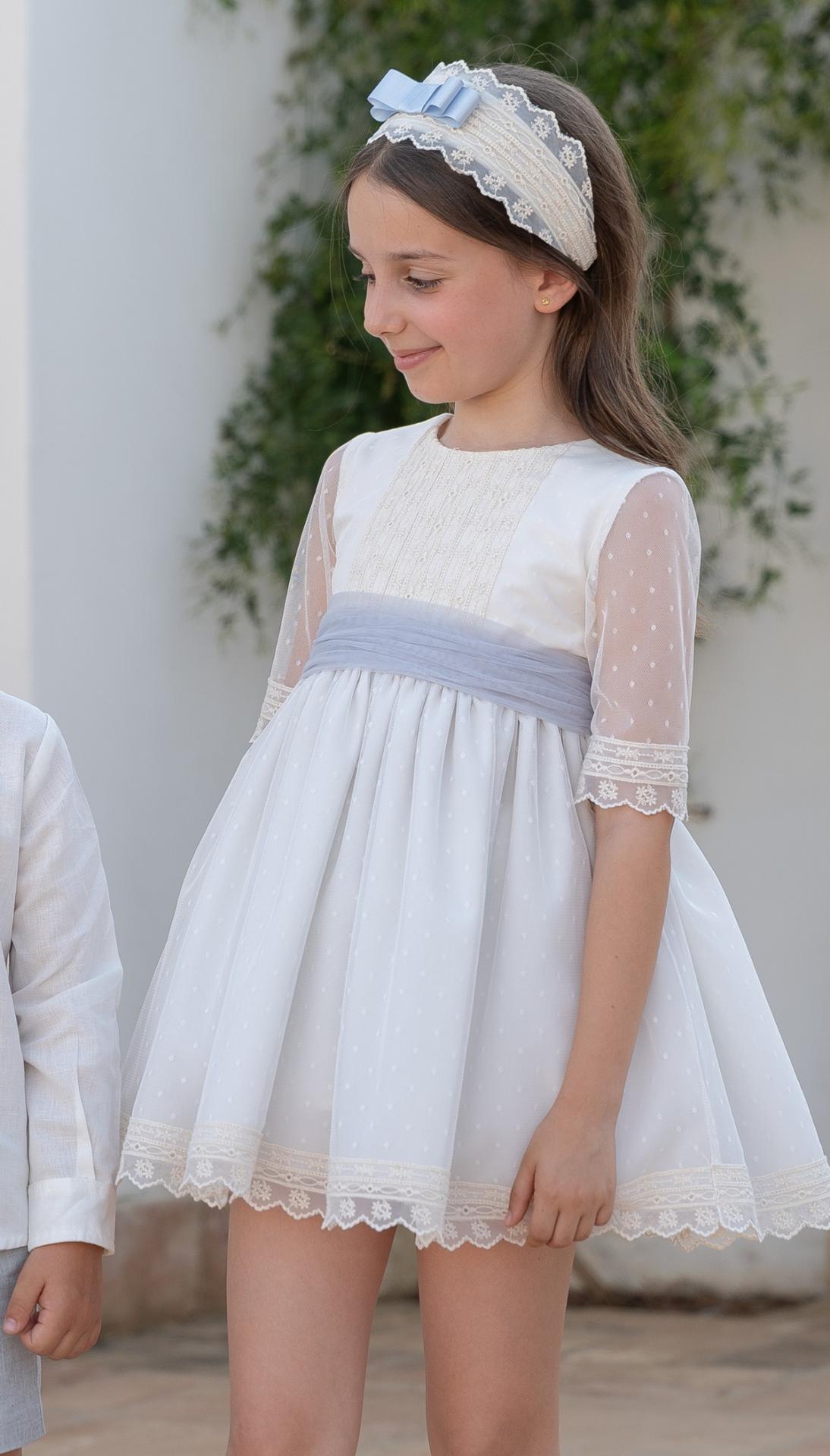 Vestido Ceremonia y Arras Niña Tul Beige Topito y Azul Grisáceo – Eva Martínez Artesanía