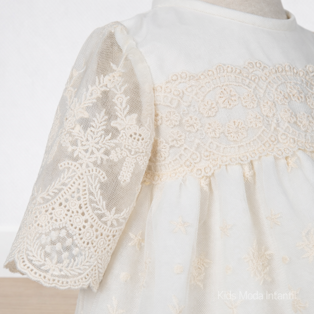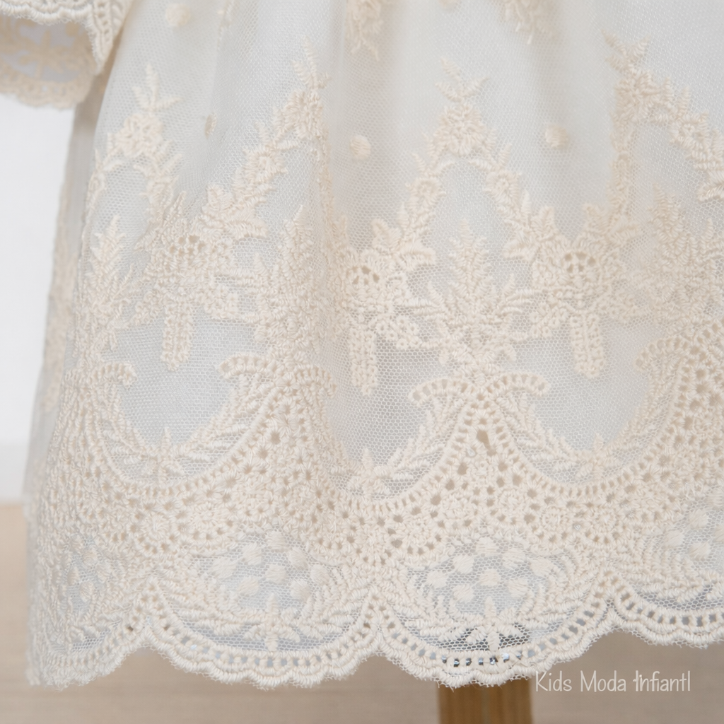 Este faldón presenta un refinado bordado floral en tono marfil, cuidadosamente distribuido en mangas, cuerpo y bajo, creando un acabado clásico y atemporal. Su diseño de corte largo aporta solemnidad y dulzura, convirtiéndolo en una opción ideal para ceremonias de bautizo, celebraciones religiosas y reportajes fotográficos.