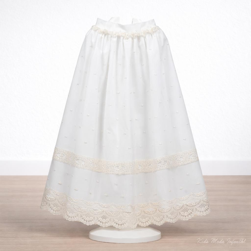 Disponible en tallas 3-6 meses y 12 meses, este faldón es ideal para quienes buscan ropa de bautizo para bebé de alta calidad, con un diseño elegante y una confección cuidada al detalle.