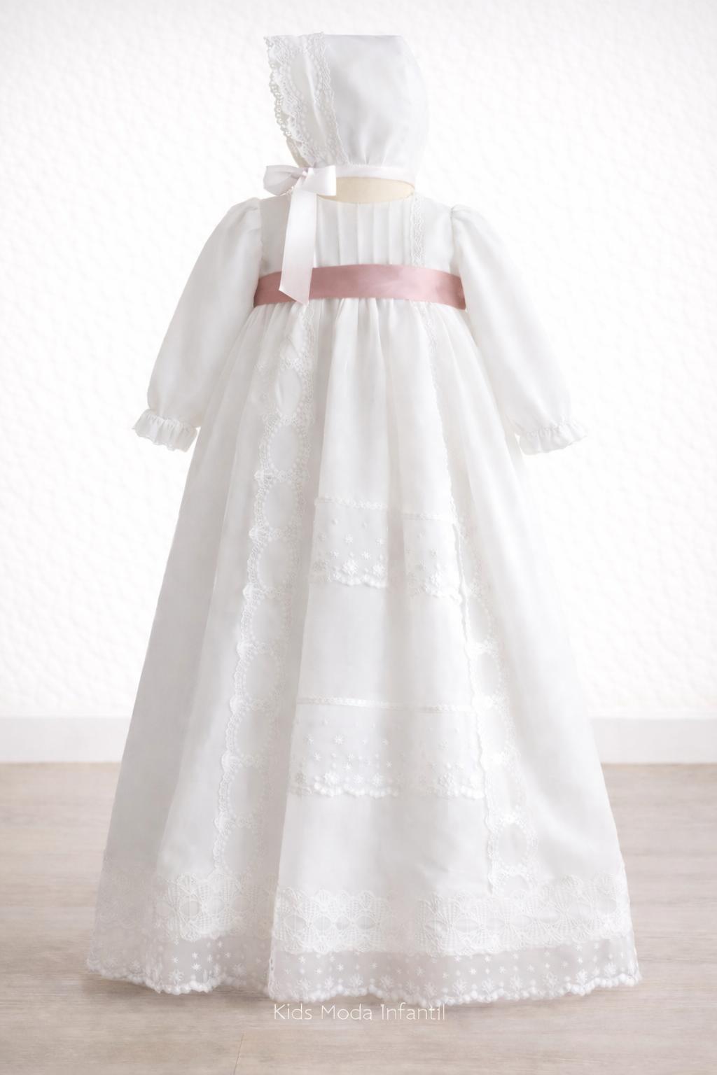 Faldón Bautizo Bebé en Gasa Blanca con Cinta Rosa Empolvado – Familia 6