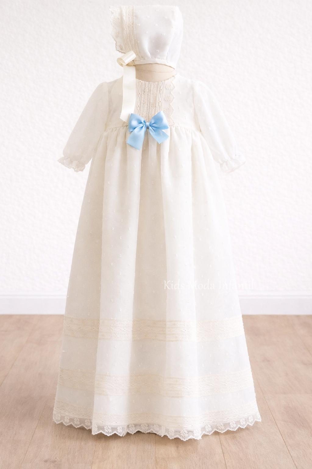 Confeccionado en delicado tejido plumeti de cristal beige, con cuello redondeado, elegante pechera de puntilla y un fino lacito en color azul celeste, que aporta un toque dulce y sereno al conjunto (posibilidad de cambiar la tonalidad, ver opciones de la prenda).