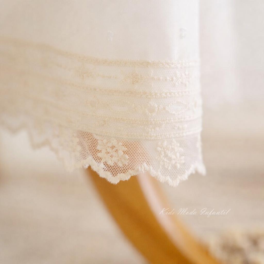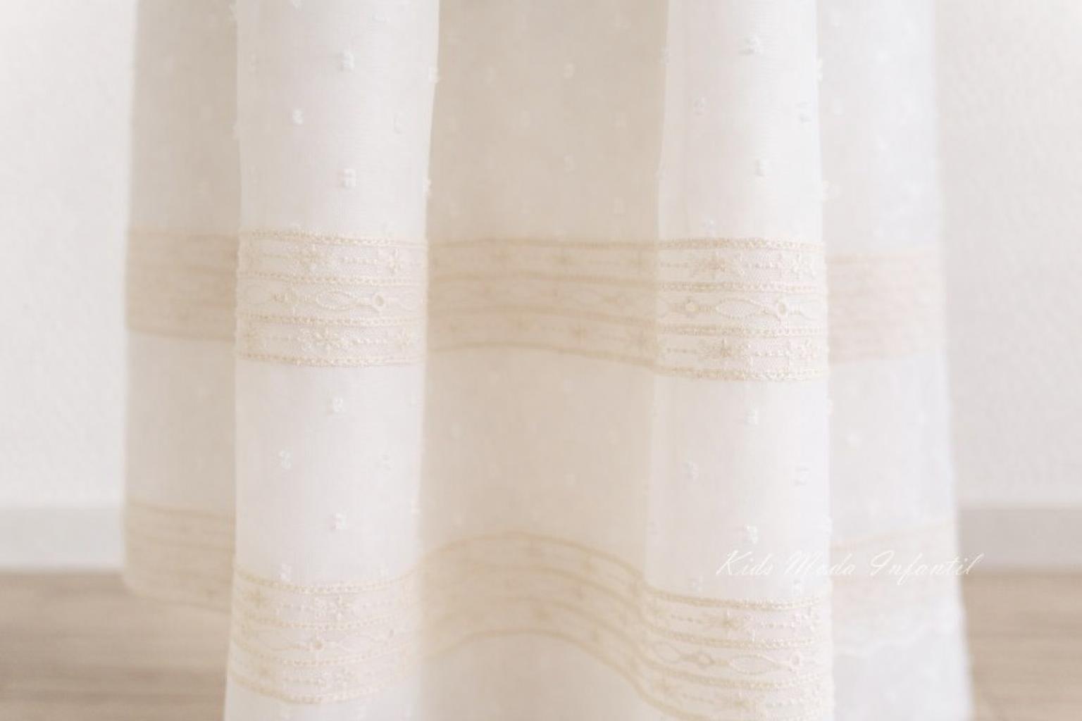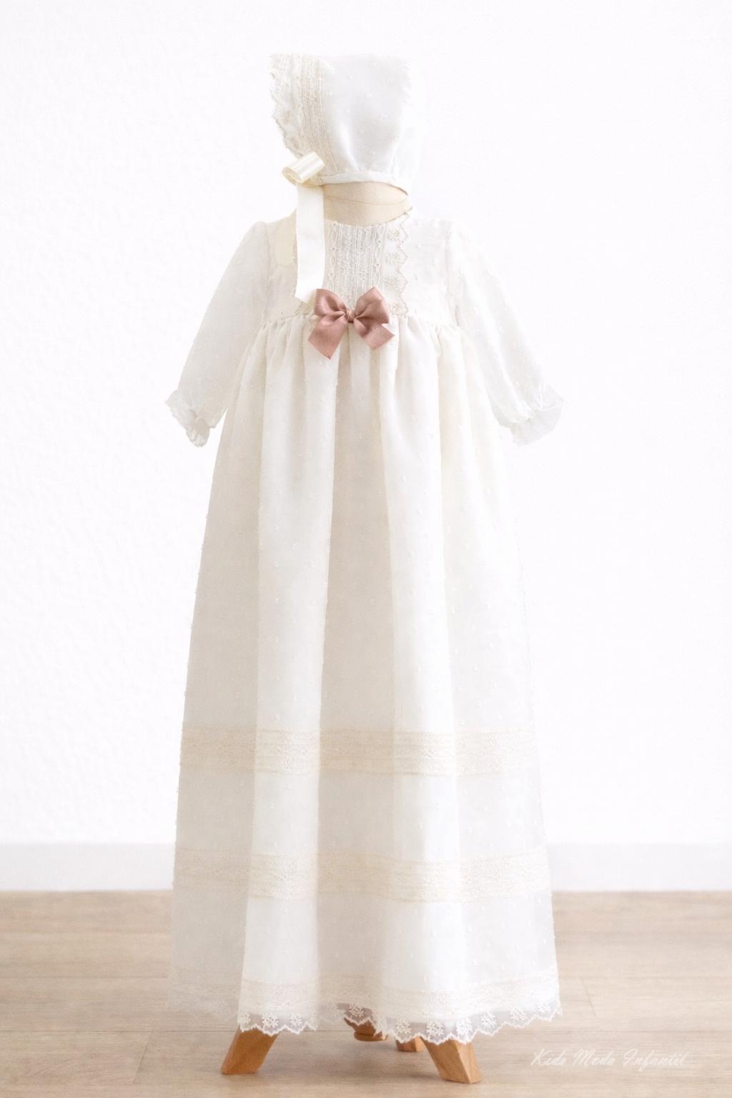 Faldón de bautizo para bebé confeccionado en plumeti de cristal beige, disponible en faldón largo o corto (seleccionable en las opciones de la prenda). Puede realizarse con manga larga, así como con opción de manga corta o sin mangas.Confeccionado en delicado tejido plumeti de cristal beige, con cuello redondeado, elegante pechera de puntilla y un fino lacito en color rosa empolvado, que aporta un toque suave, elegante y atemporal al conjunto (posibilidad de cambiar la tonalidad, ver opciones de la prenda).La espalda presenta botonadura, facilitando la colocación.