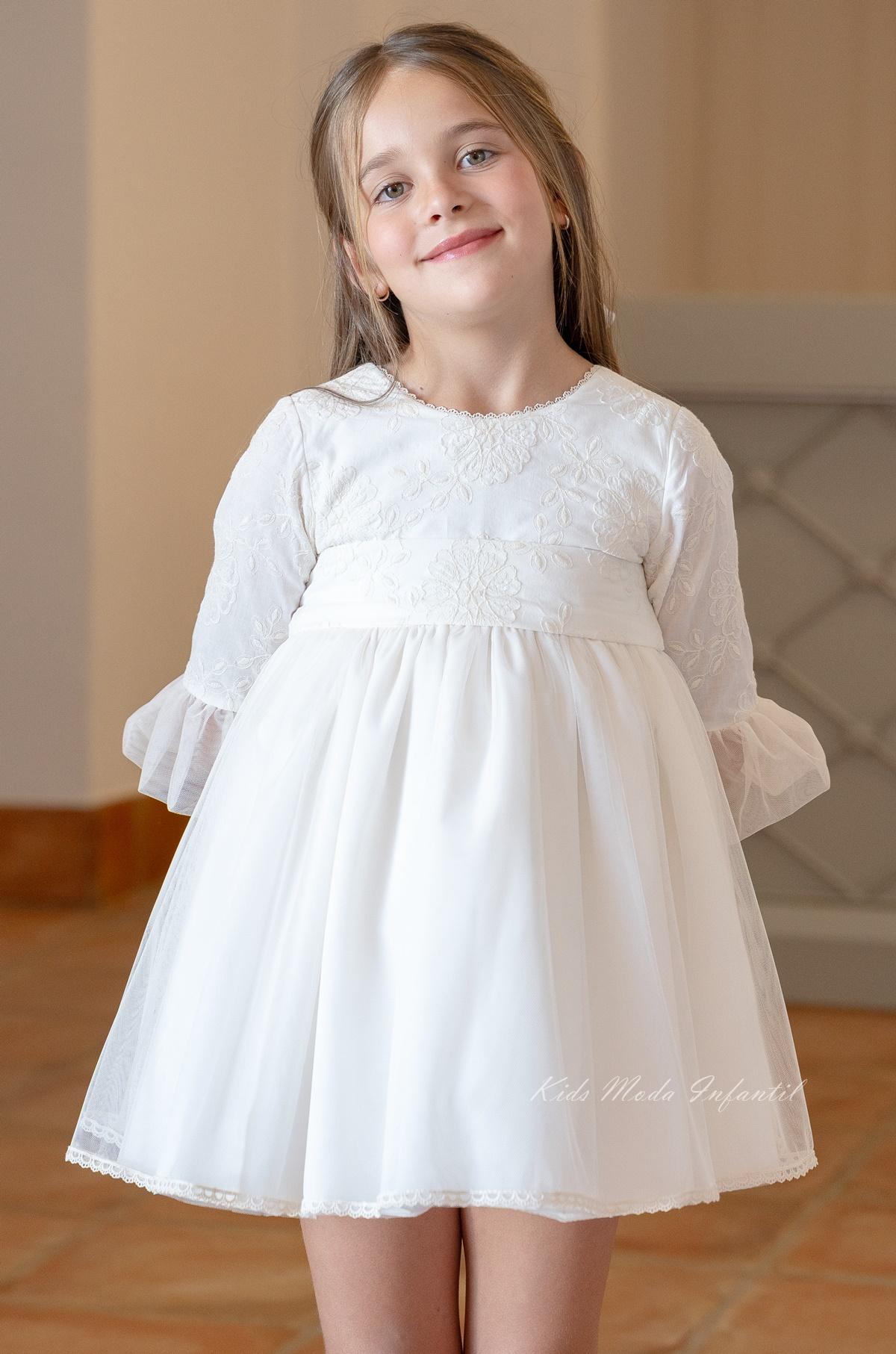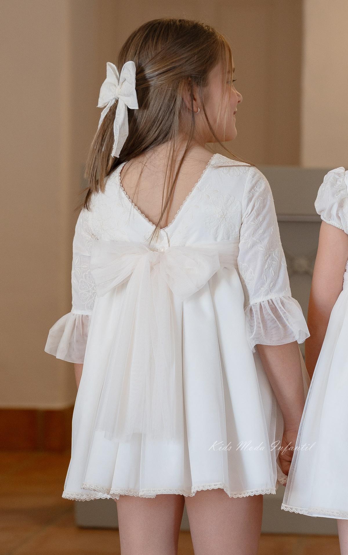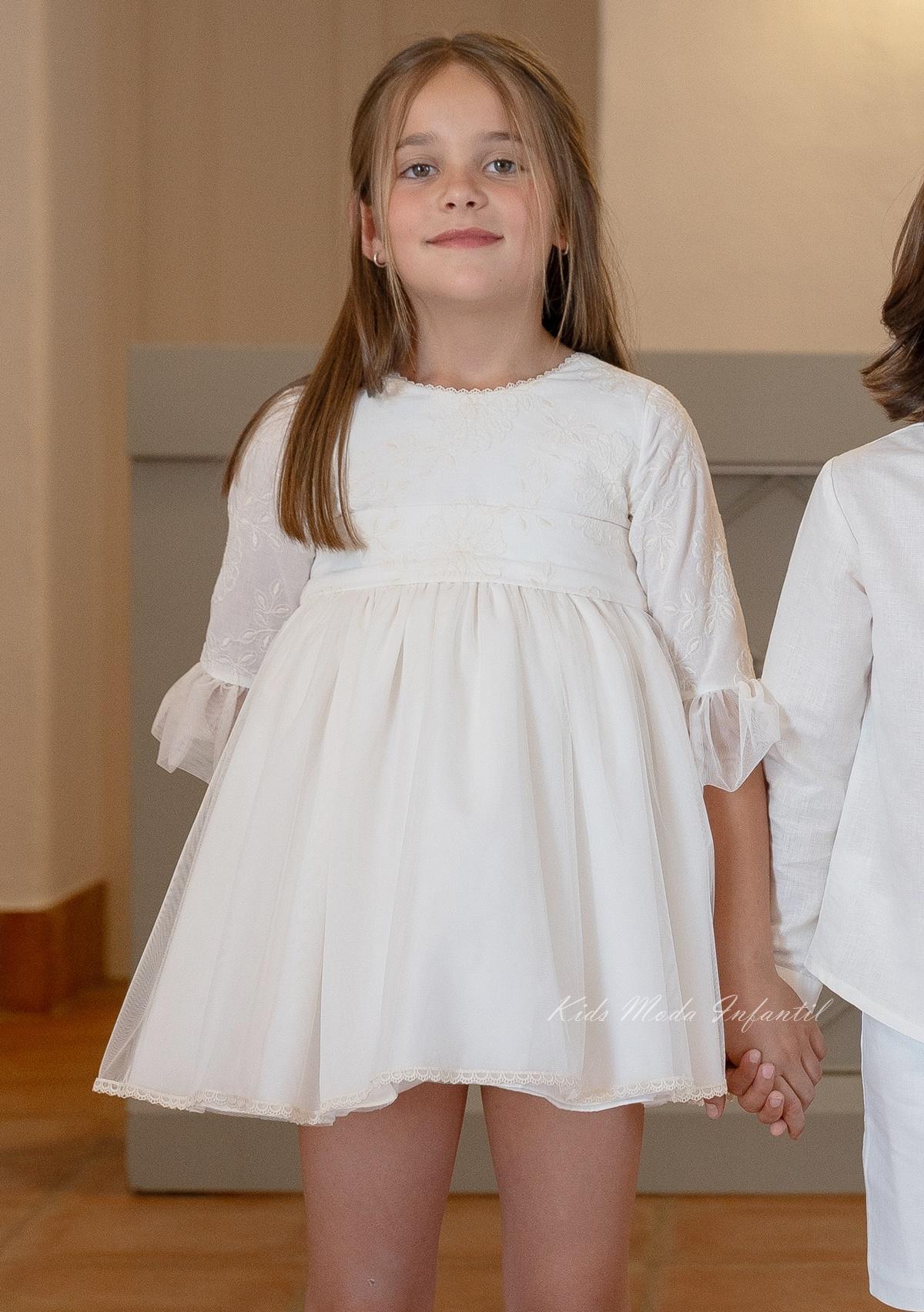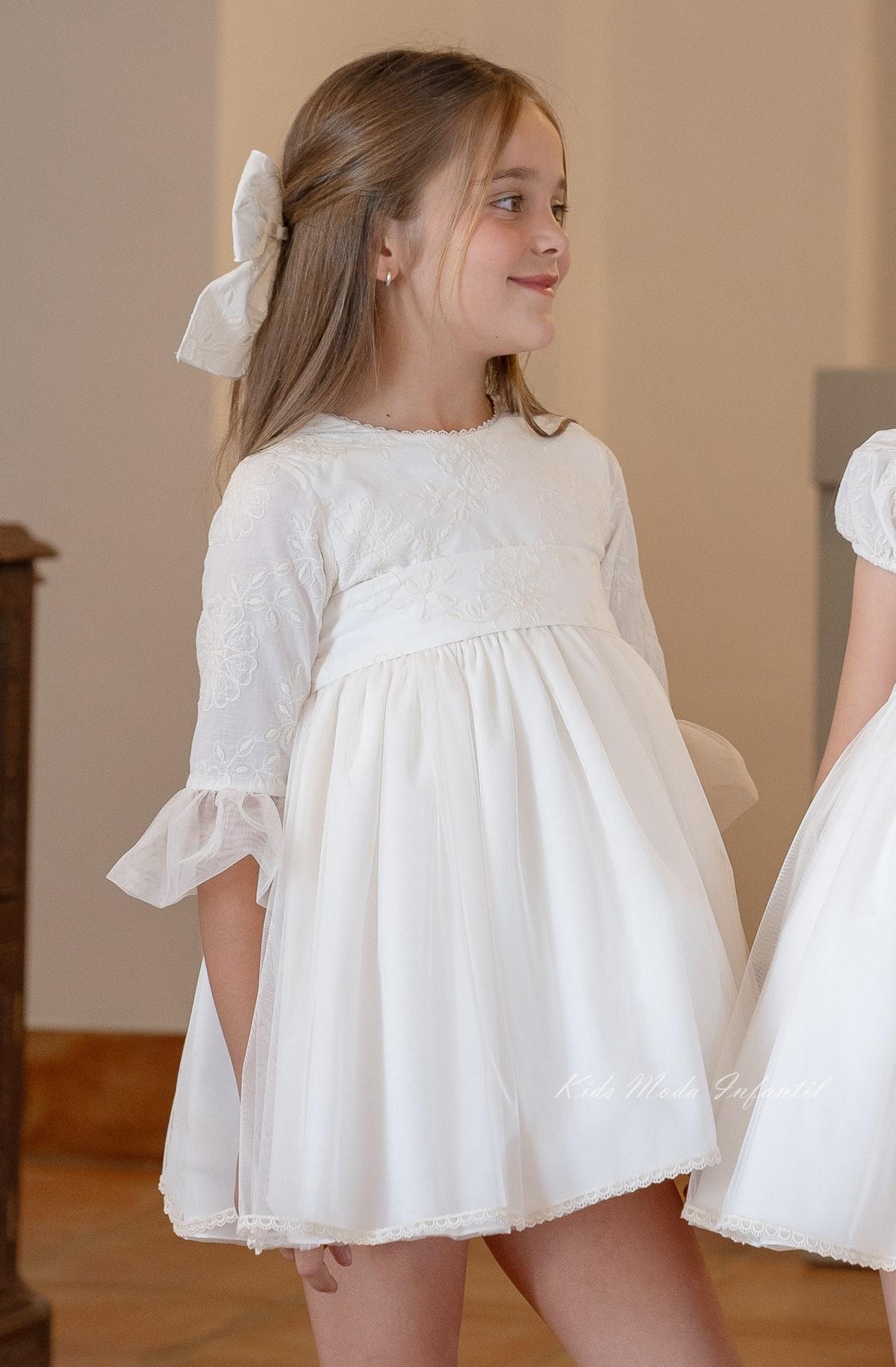 Vestido de Ceremonia Niña Blanco Roto con Bordados y Falda de Tul – Eva Martínez Artesanía