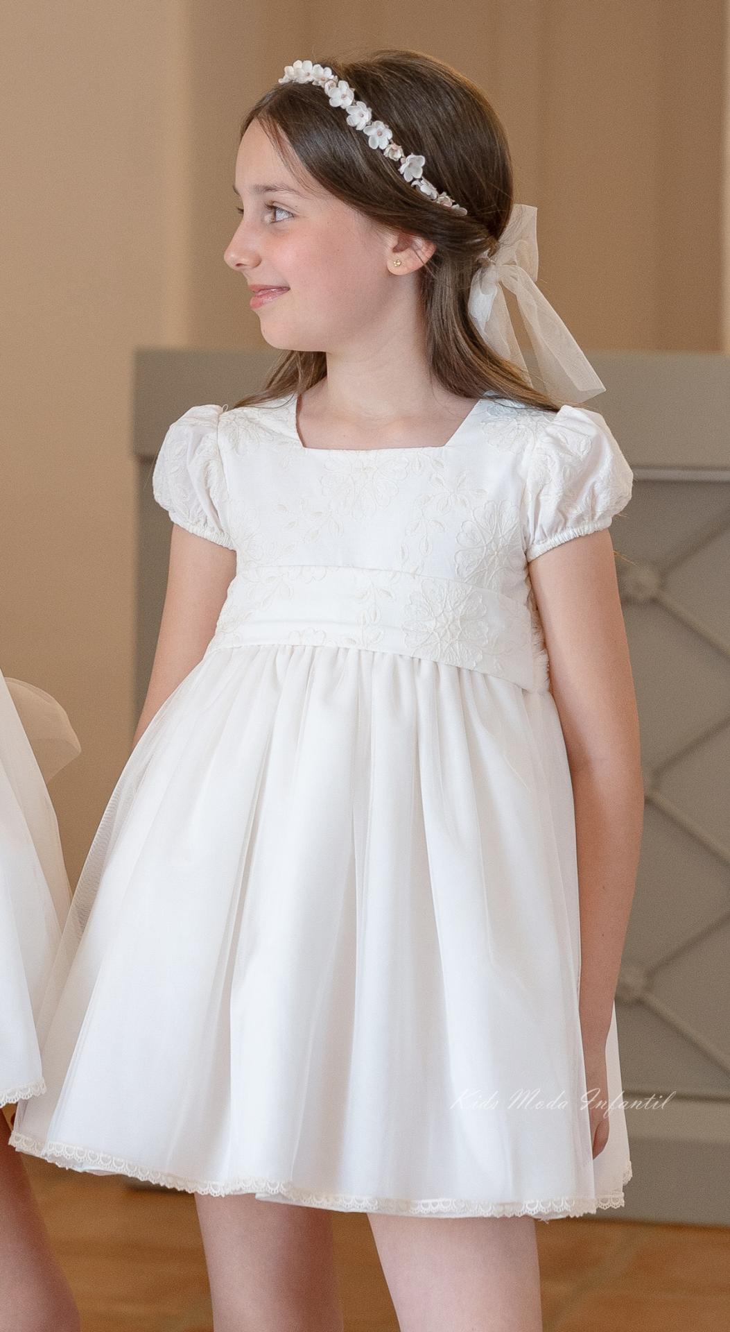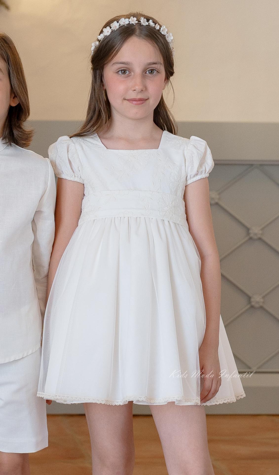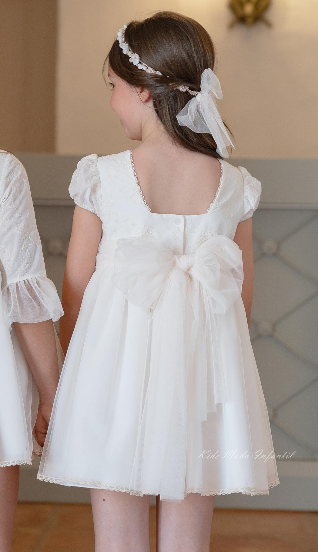 El cuerpo del vestido está elaborado en tejido bordado, aportando textura y un acabado refinado. Presenta manga corta abullonada, que añade volumen y un aire romántico al diseño, manteniendo siempre la esencia dulce y elegante propia de la moda infantil de ceremonia. El cuello cuadrado en el delantero aporta un toque clásico y sofisticado, en perfecta armonía con el conjunto.