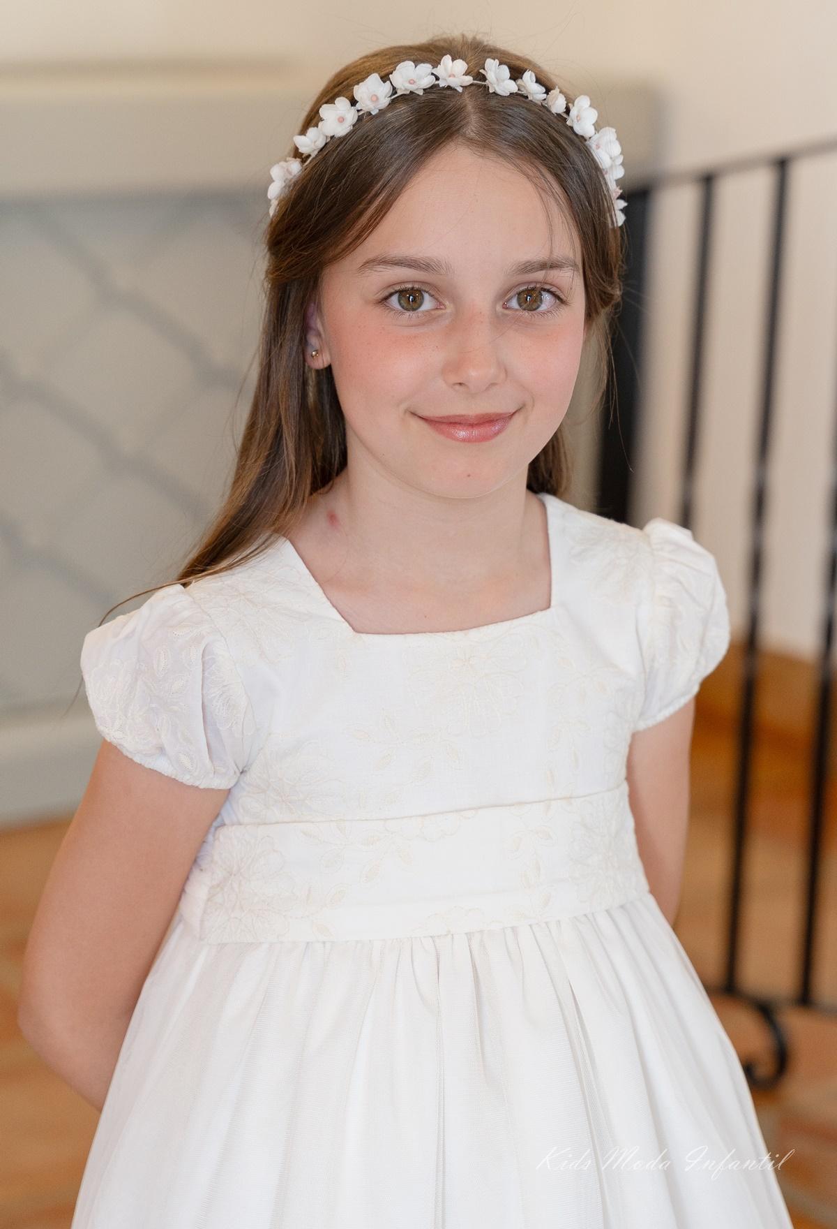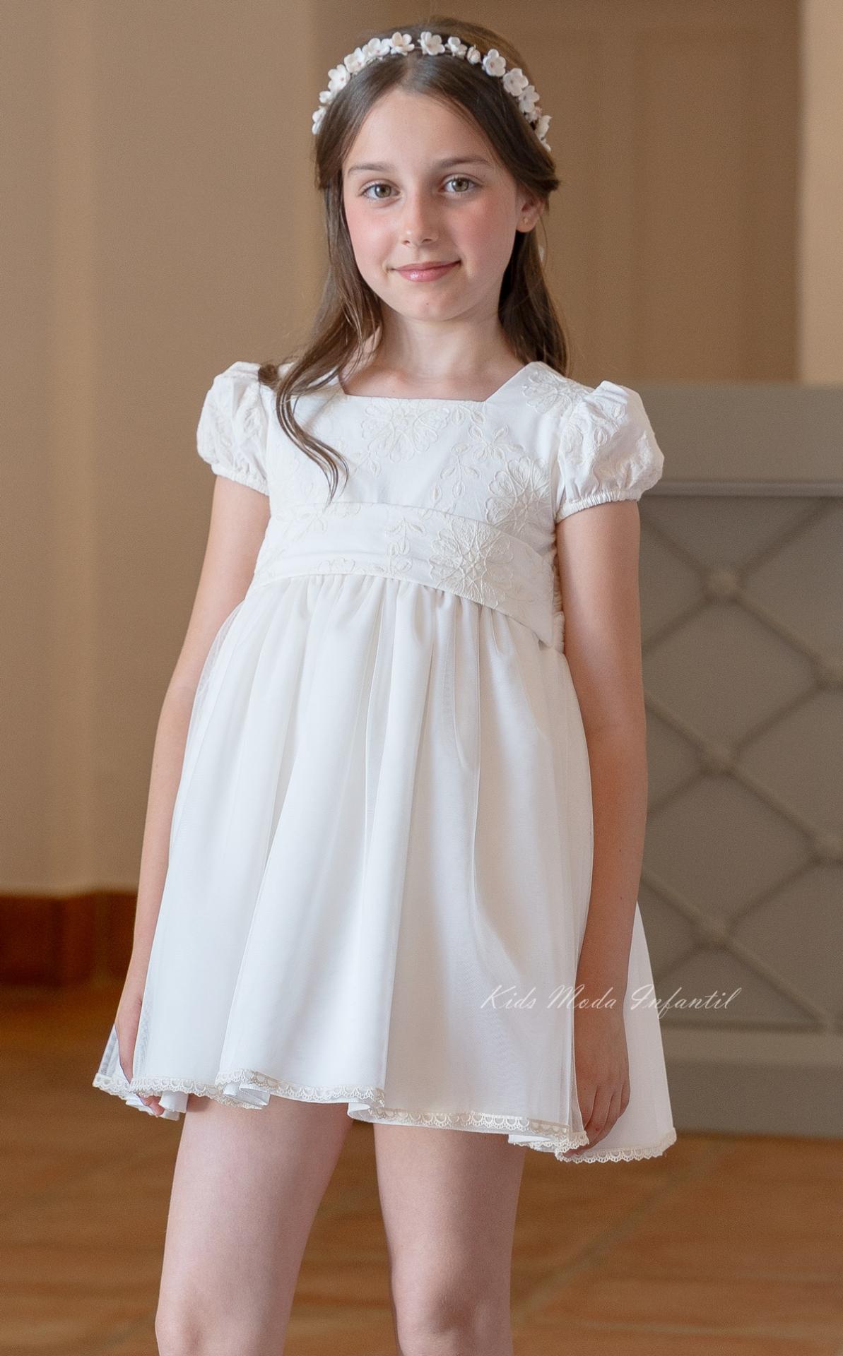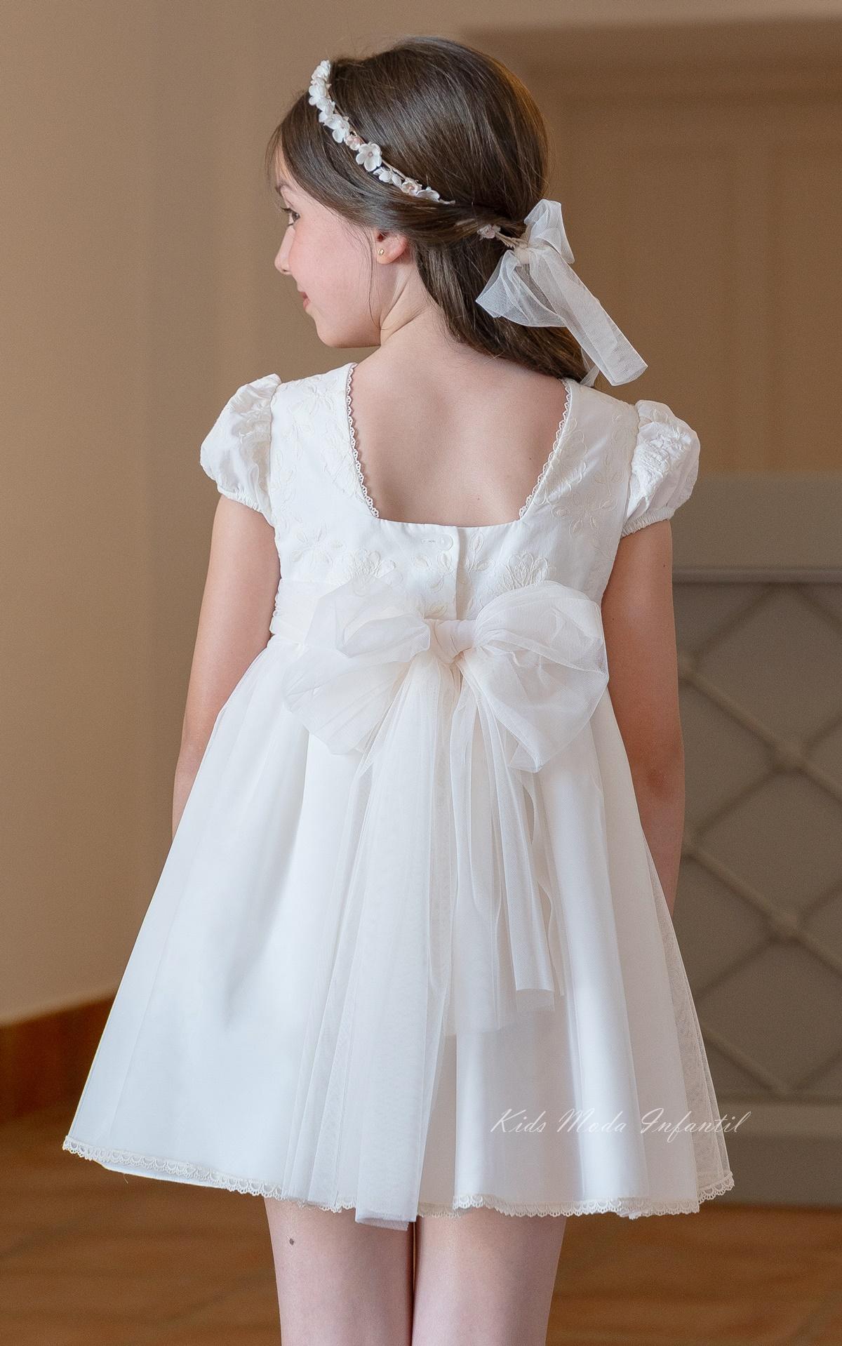 El cuerpo del vestido está elaborado en tejido bordado, aportando textura y un acabado refinado. Presenta manga corta abullonada, que añade volumen y un aire romántico al diseño, manteniendo siempre la esencia dulce y elegante propia de la moda infantil de ceremonia. El cuello cuadrado en el delantero aporta un toque clásico y sofisticado, en perfecta armonía con el conjunto.