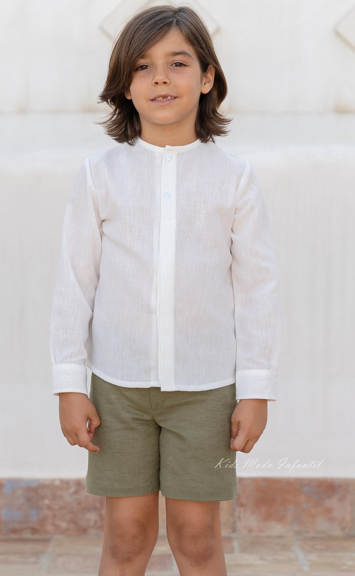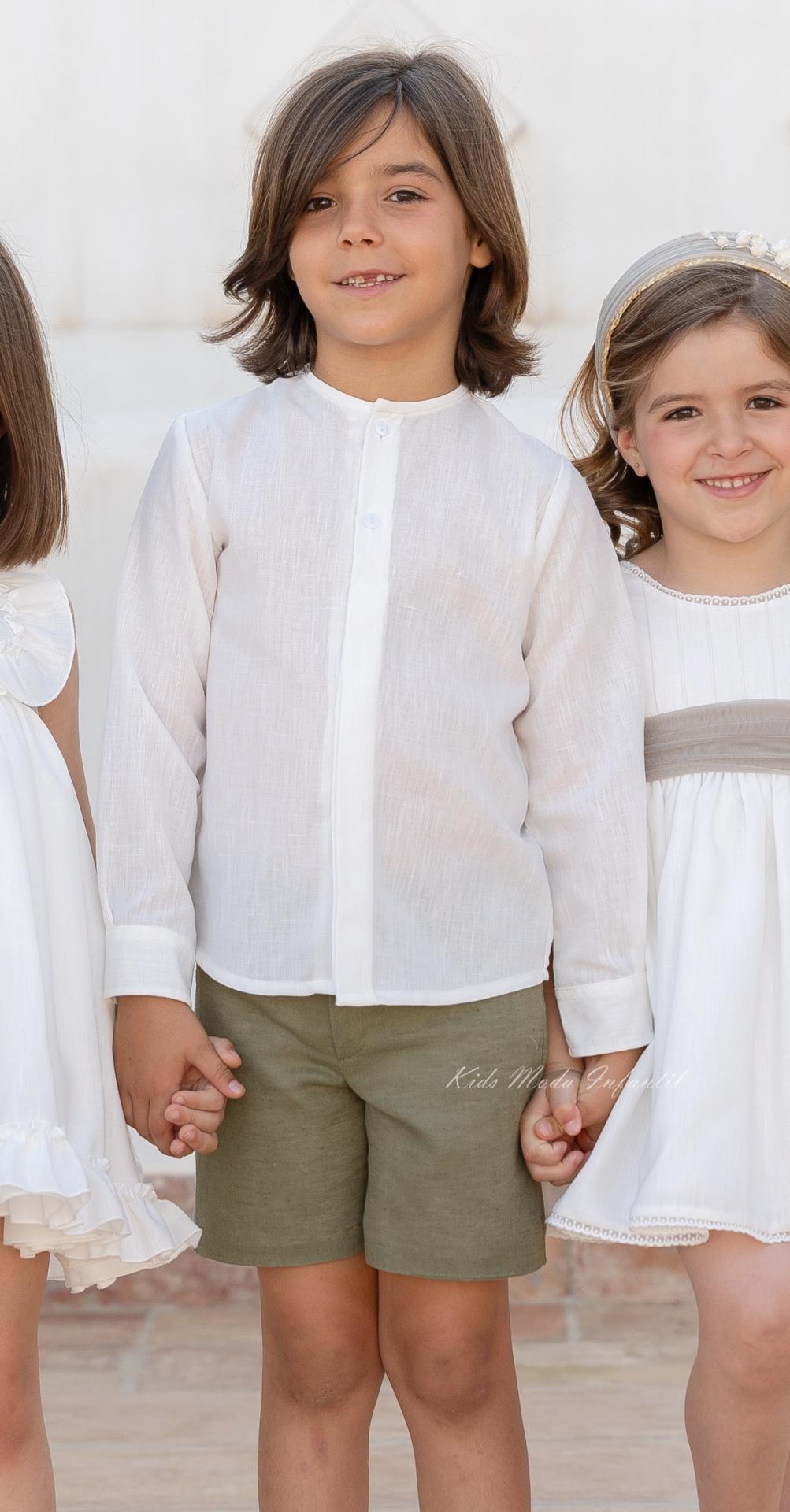 Conjunto de ceremonia y arras para niño en tejido rústico blanco roto y lino verde oliva, perteneciente a la Familia 4 de la colección Martina. Camisa de manga larga con cuello tirilla y botonadura vista, combinada con pantalón bermuda chino en lino con botón, cremallera y cintura regulable.