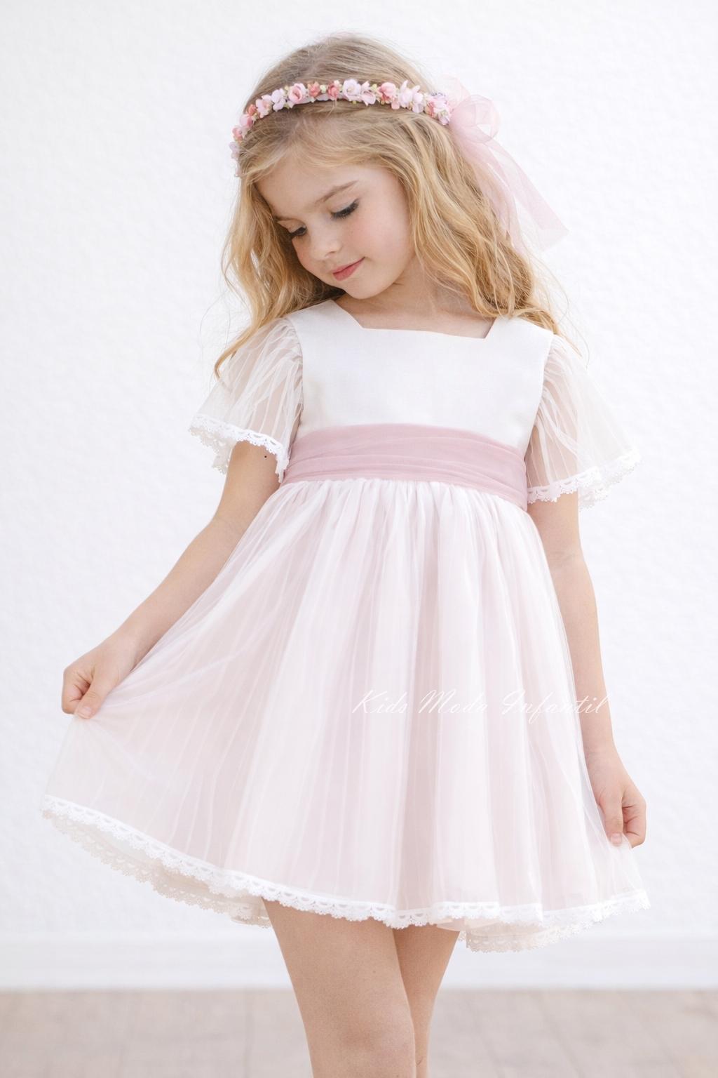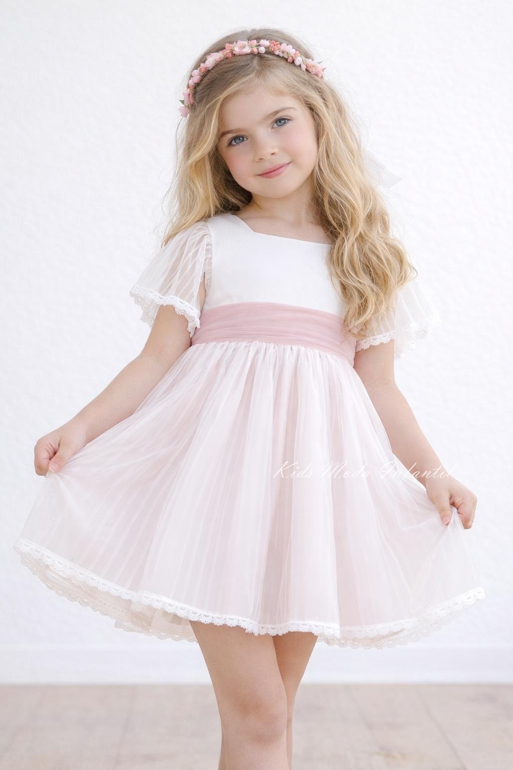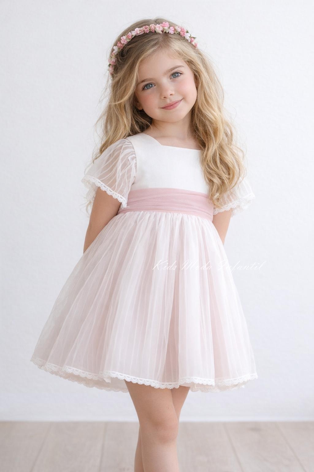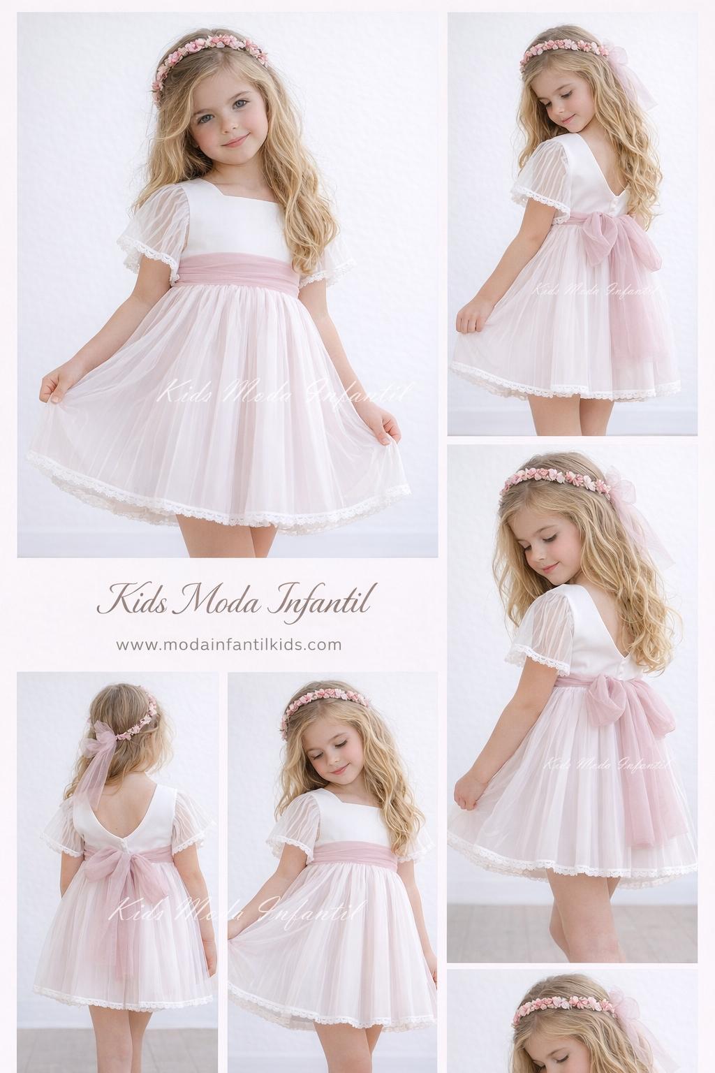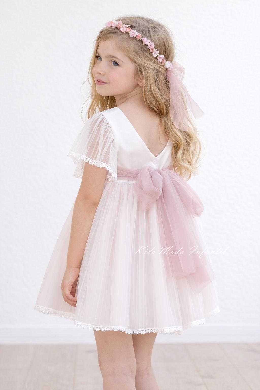 Vestido Ceremonia y Arras Niña Manga Corta de Tul Rosa Empolvado – Eva Martínez Artesanía Familia 6