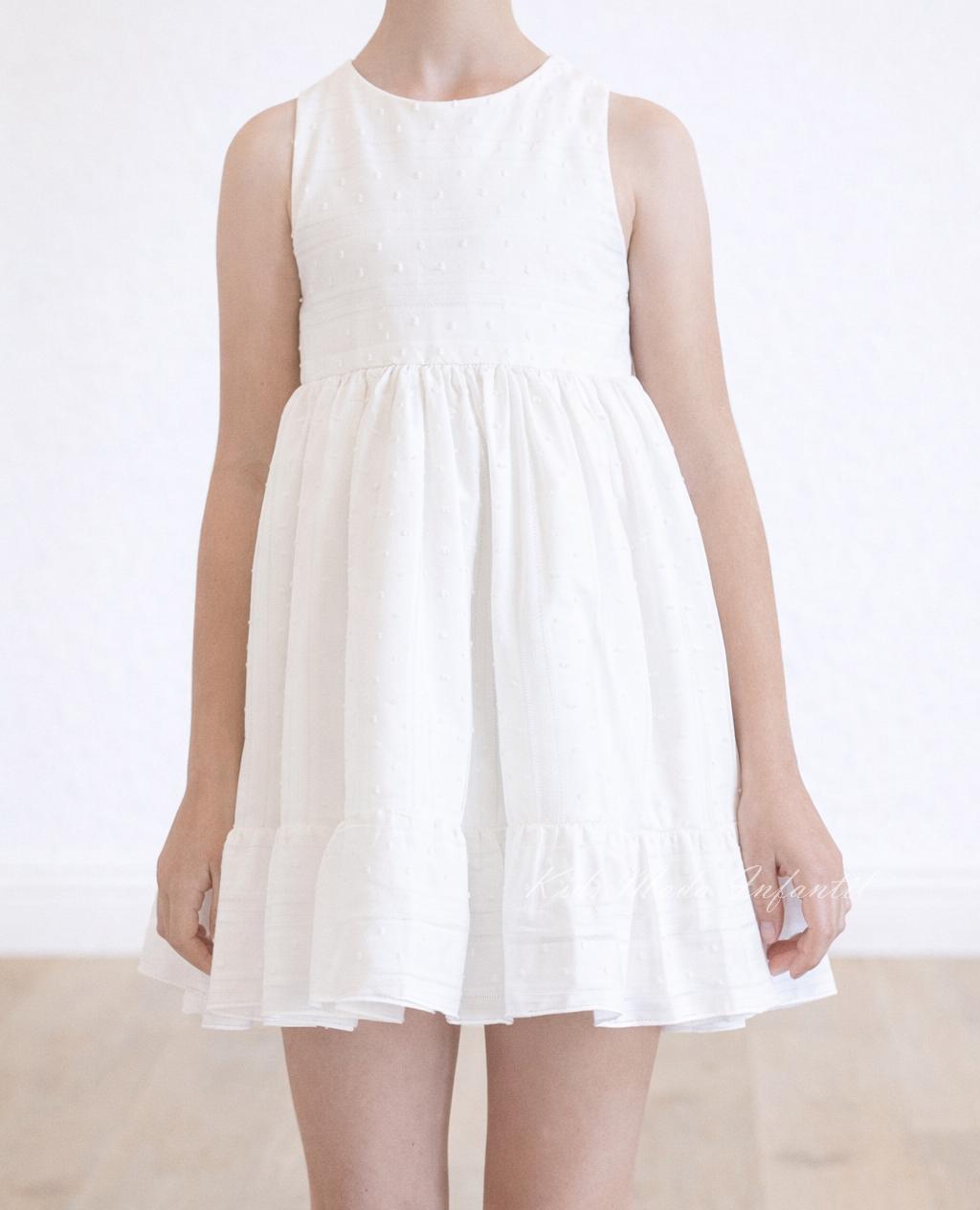 Confeccionado en un tejido ligero y suave, este vestido presenta una silueta fluida que aporta comodidad y movimiento, manteniendo una estética elegante y atemporal. Su diseño sin mangas y su falda con ligero vuelo lo convierten en una opción ideal para bodas, arras y celebraciones infantiles.