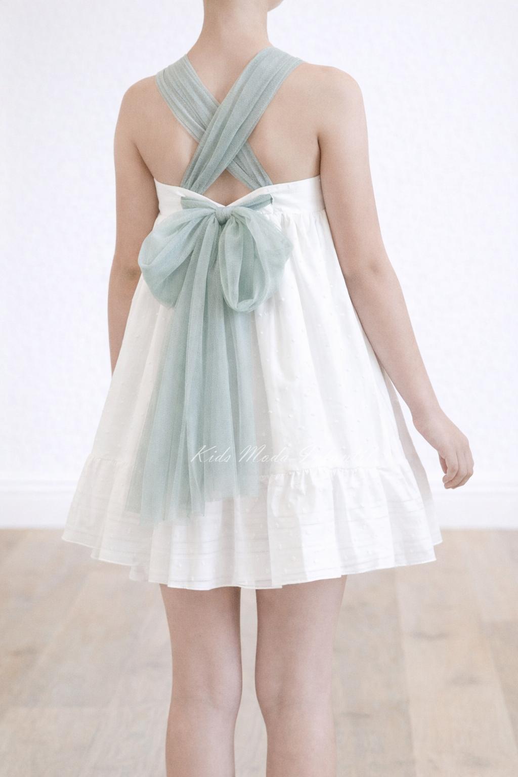 Vestido Ceremonia y Arras Niña Espalda Cruzada Tul Verde Agua – Eva Martínez Artesanía Familia 6