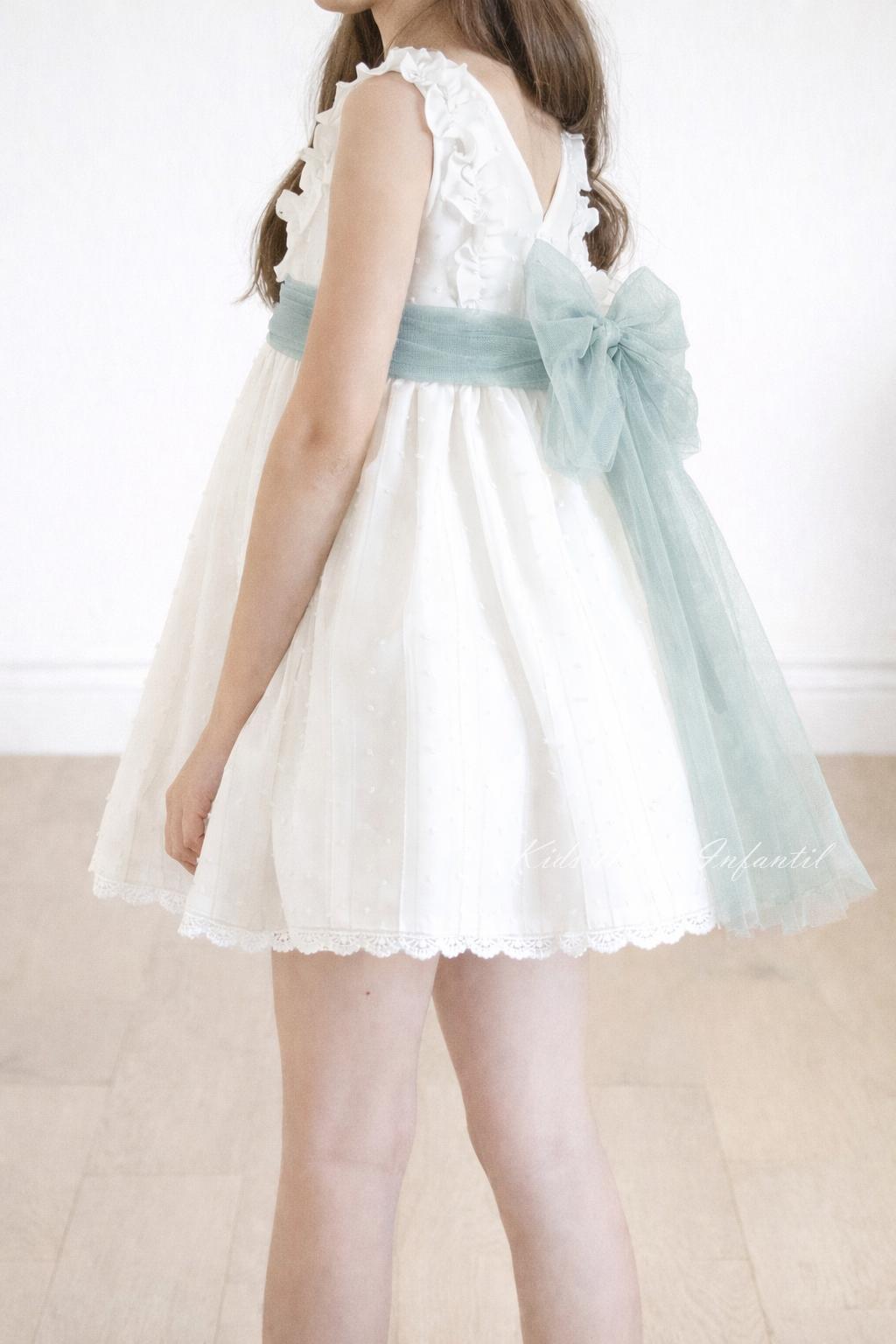 Vestido ceremonia y arras niña con fajín verde agua – Familia 6