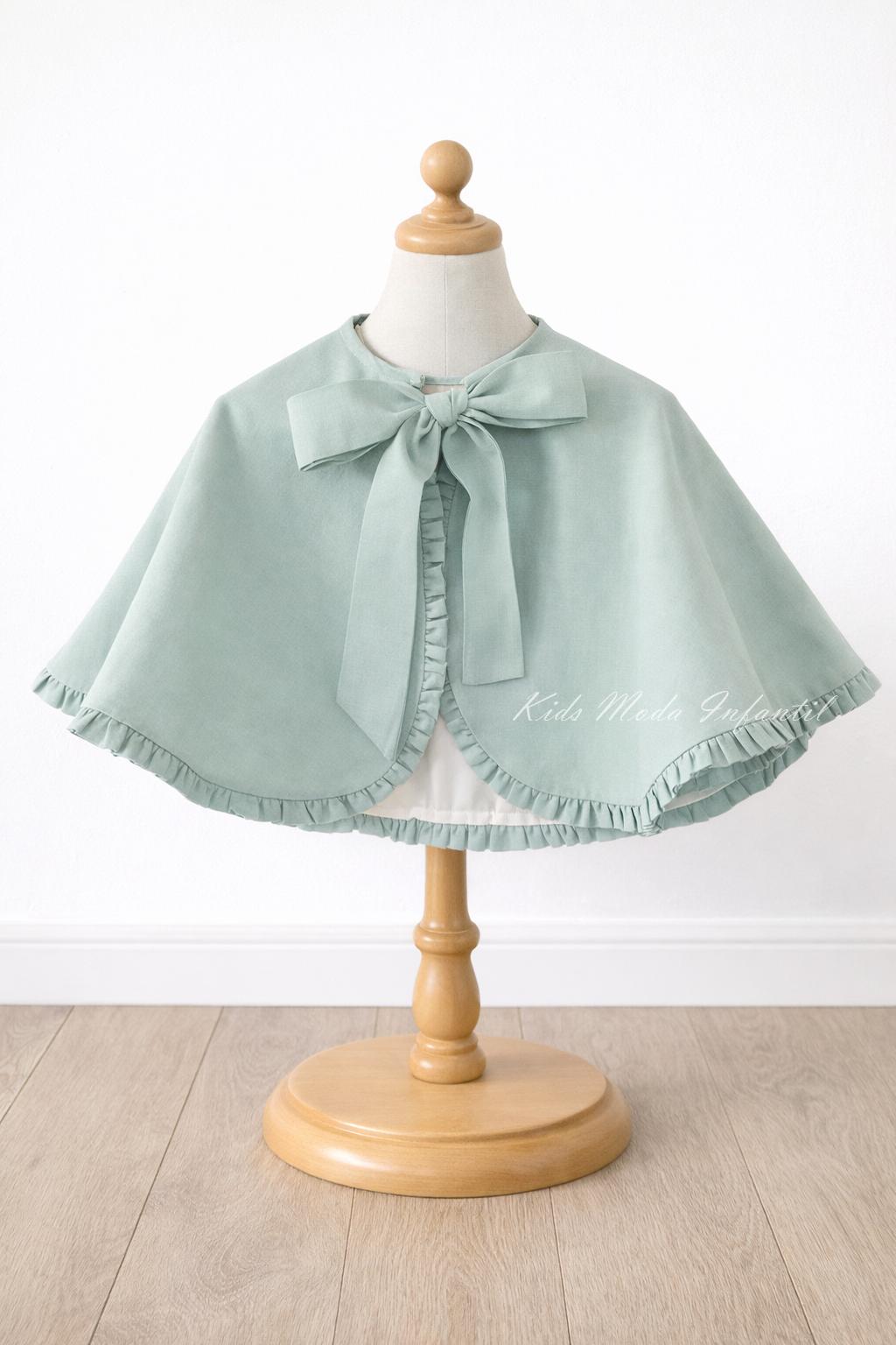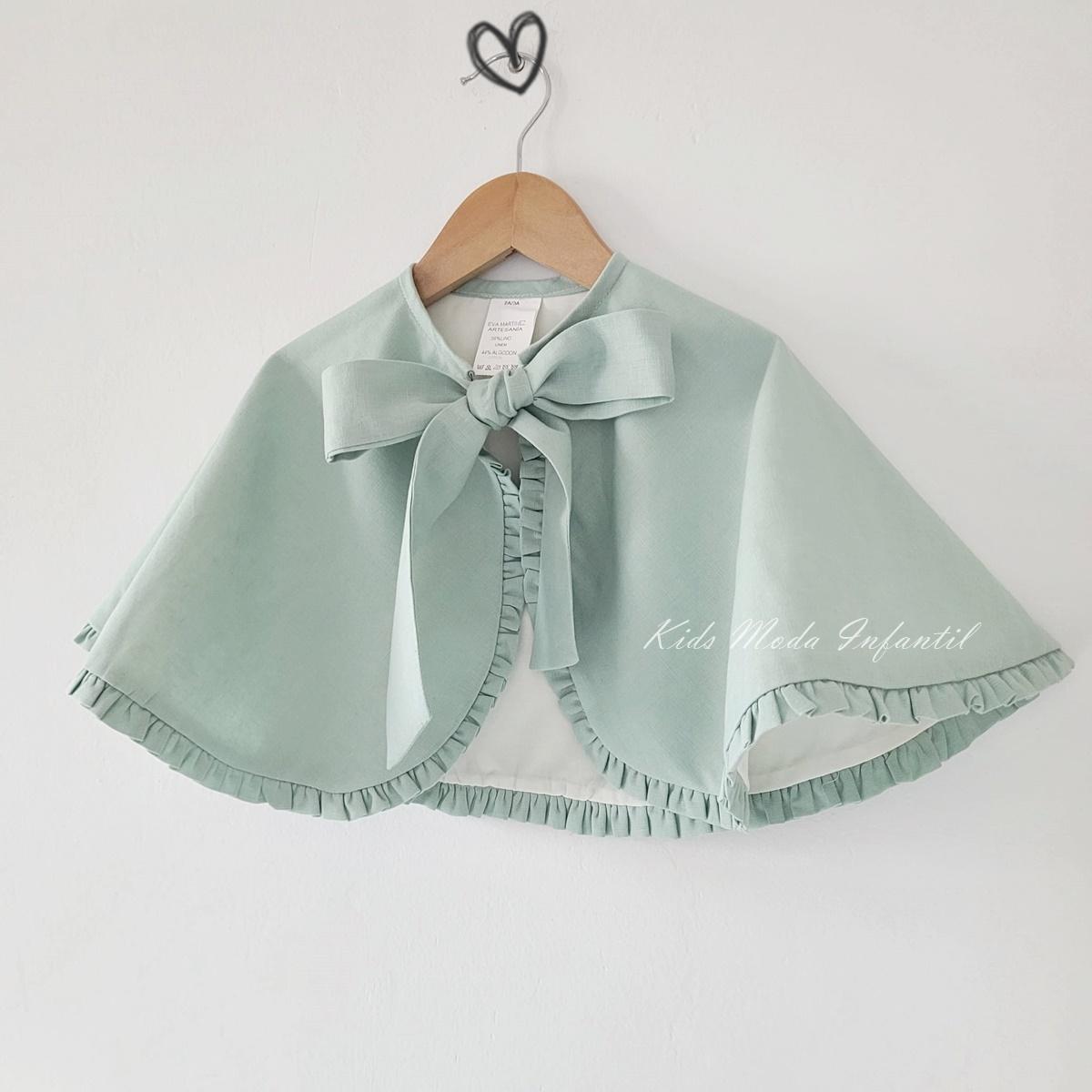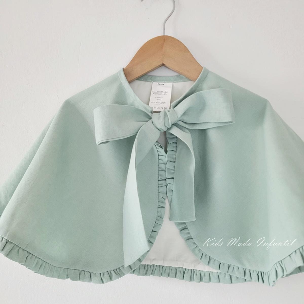 Su diseño incorpora un volante alrededor de todo el contorno, que aporta movimiento y sofisticación, y se cierra en el cuello con dos lazos, formando una bonita lazada delantera. El color verde agua, suave y actual, es ideal para combinar con vestidos de niña para arras y ceremonias, creando un conjunto armonioso y refinado.