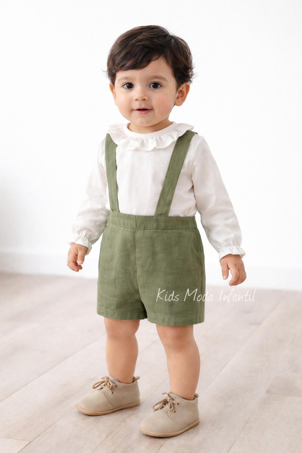 Precioso conjunto ceremonia y arras bebe y niño confeccionado en dos prendas, camisa canastilla lino blanco roto, con botonadura trasera, manga larga y cuello volante fruncido (con posibilidad de cuello bebe); combinando precioso pantalón básico con nalga recta de tirantes en tejido lino verde oliva, perfecto e ideal para combinar con los preciosos vestido ceremonia y arras niñas Eva Martínez Artesanía 40412cbg.