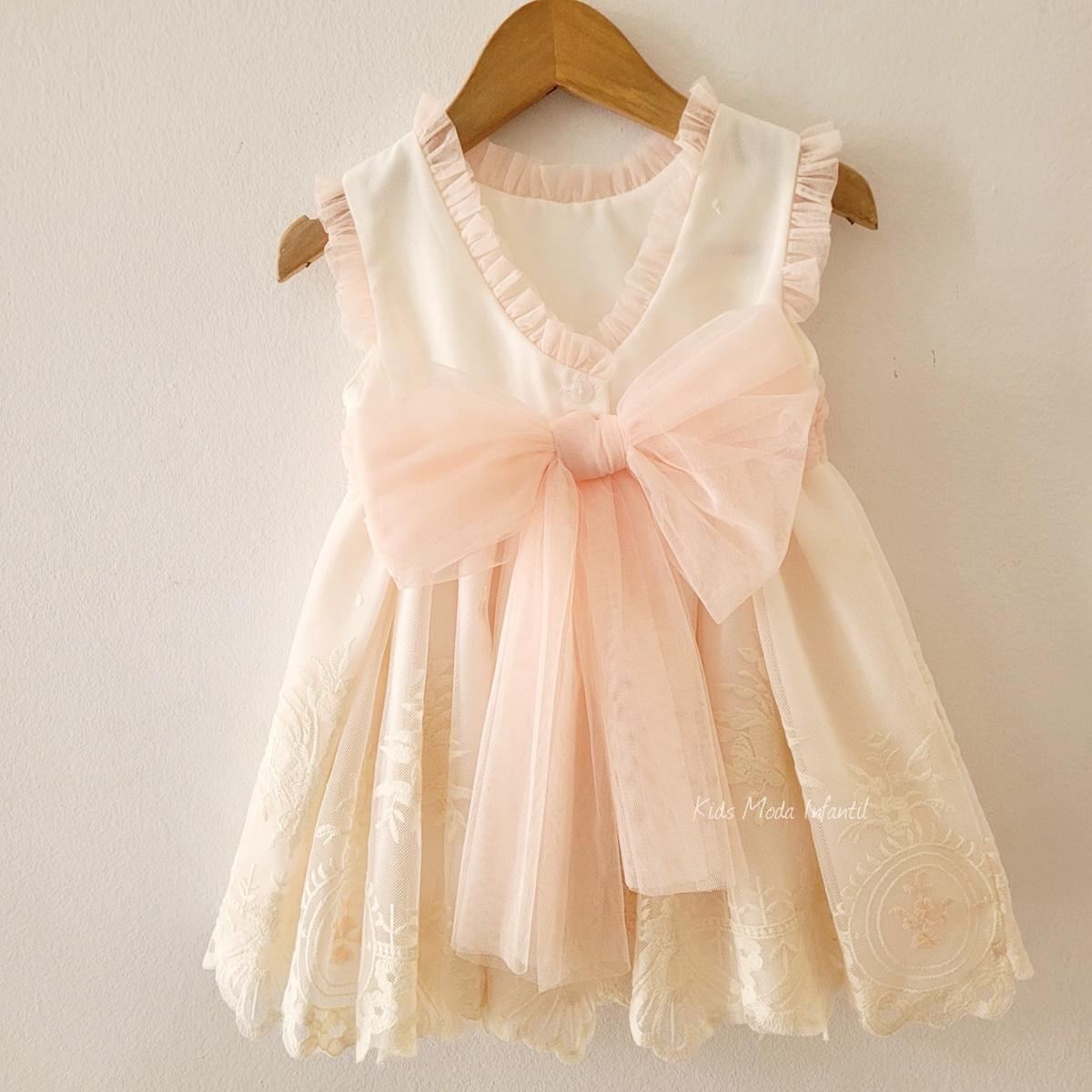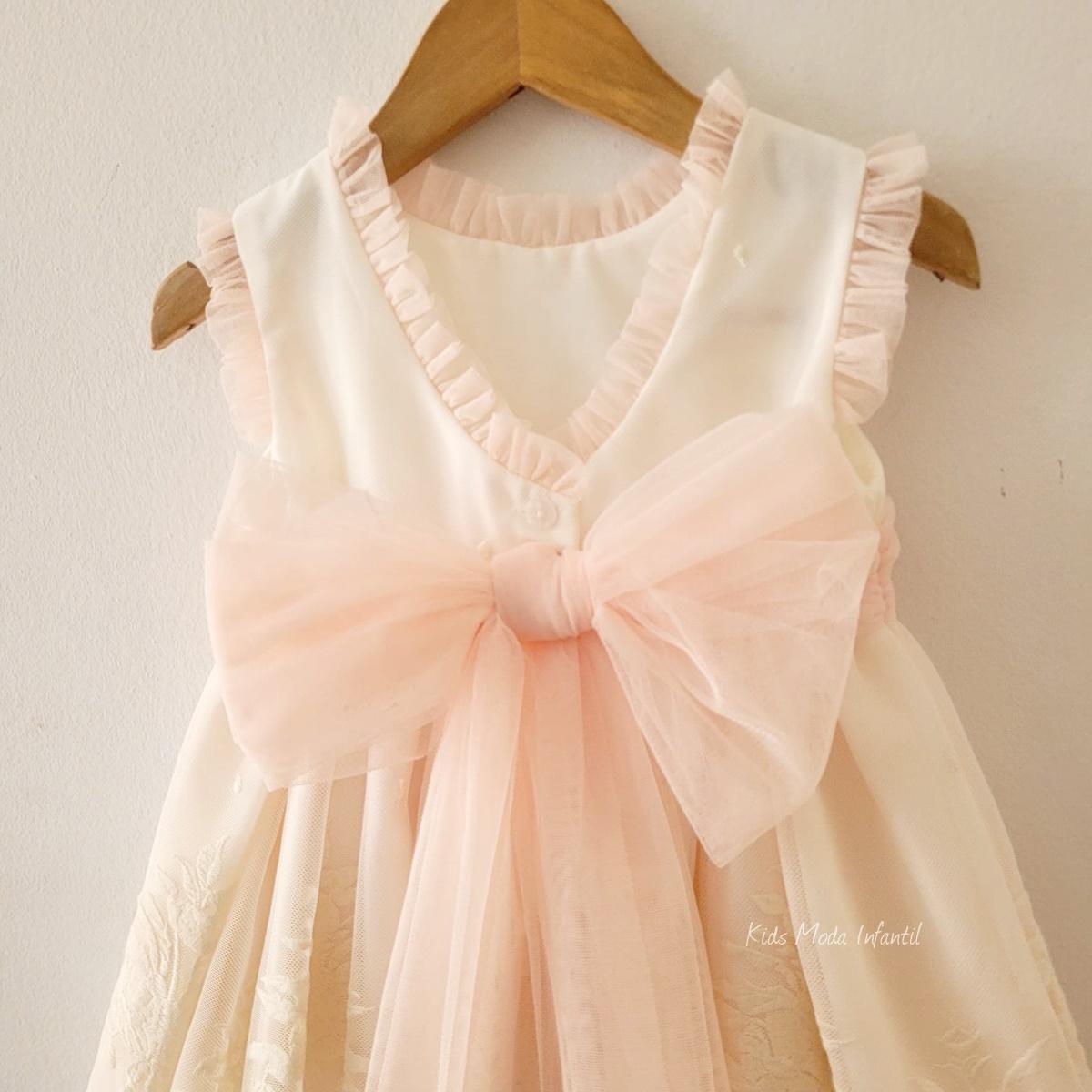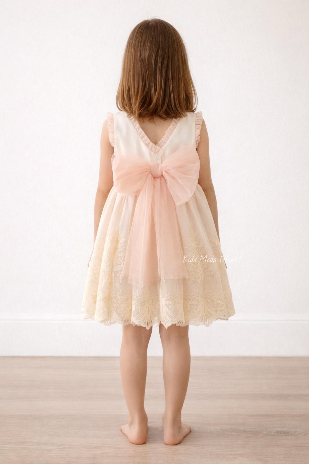 Elegante vestido ceremonia arras para niña en tul beige y melocotón, con lazo trasero y bordados delicados. Ideal para bodas y eventos especiales. Colección 2026. En Largo normal. Pertenece a la Colección Kids Moda Infantil, destacando por su estilo romántico y artesanal. Puede combinarse con los conjuntos de ceremonia y arras niño a juego, disponibles en las categorías conjuntos niño vestir y trajes ceremonia niño, perfectos para llevar a los hermanos conjuntados en celebraciones. Medidas en descripción.