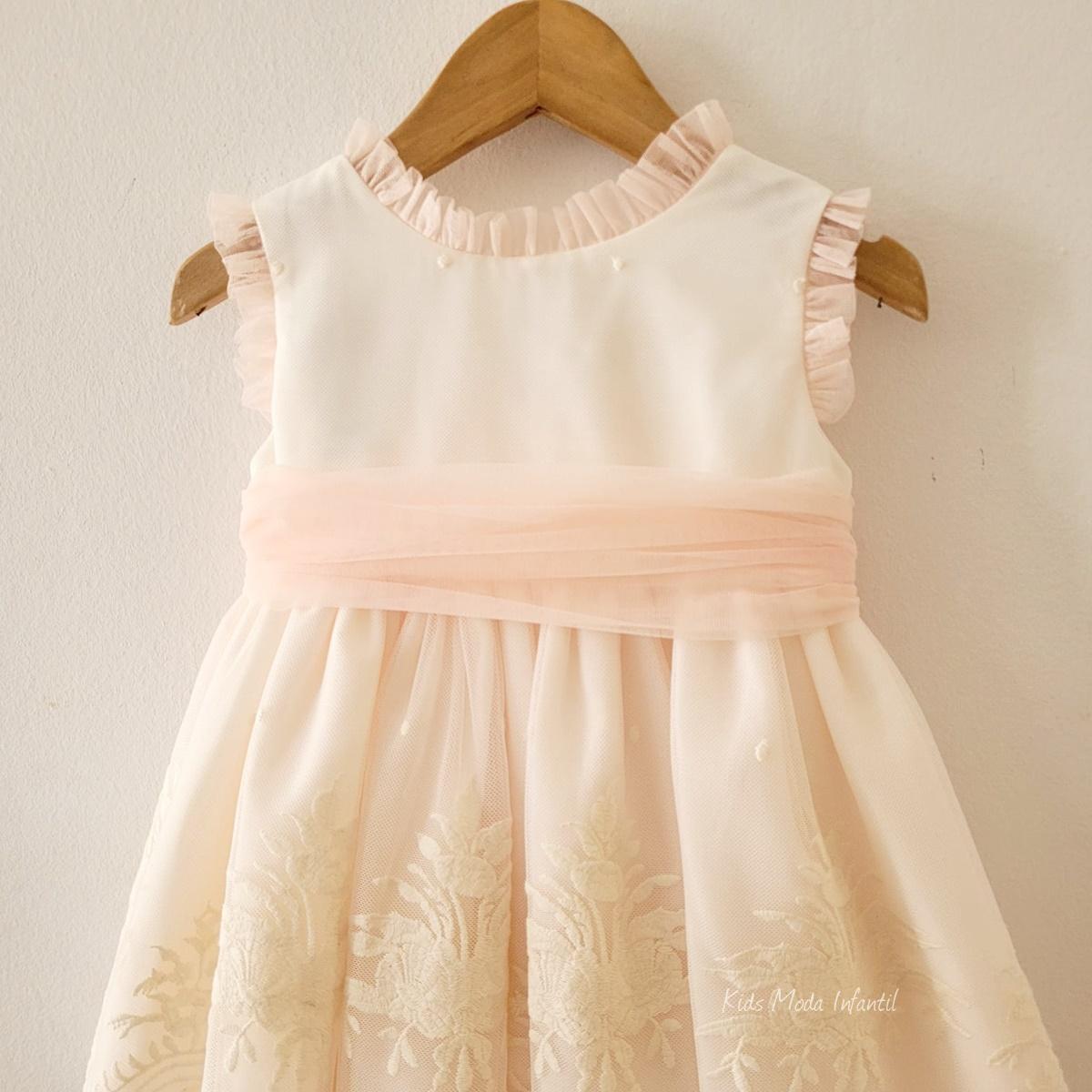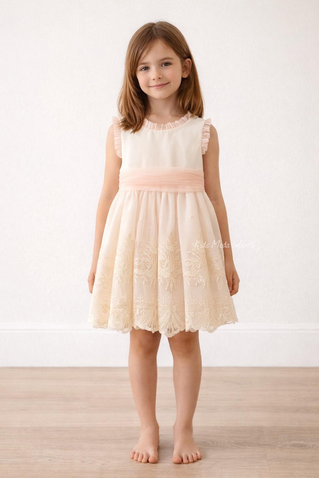 Este vestido ceremonia arras para niña de Kids Moda Infantil destaca por su diseño delicado y su elegante combinación de tonos beige y melocotón, ideal para eventos especiales. Confeccionado en tul bordado suave, ofrece una caída ligera y un acabado refinado que realza la estética infantil.