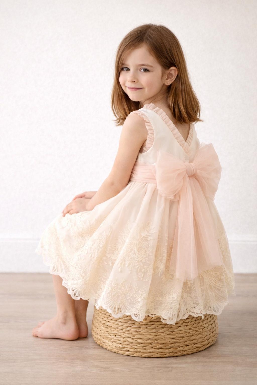 El diseño sin mangas incorpora pequeños volantes en los hombros y un favorecedor corte imperio que aporta comodidad y libertad de movimiento. El gran lazo trasero en tul melocotón se convierte en el detalle protagonista, aportando un aire romántico y sofisticado. La falda bordada con acabado festoneado añade un toque artesanal y exclusivo.