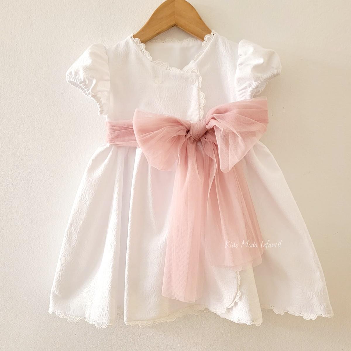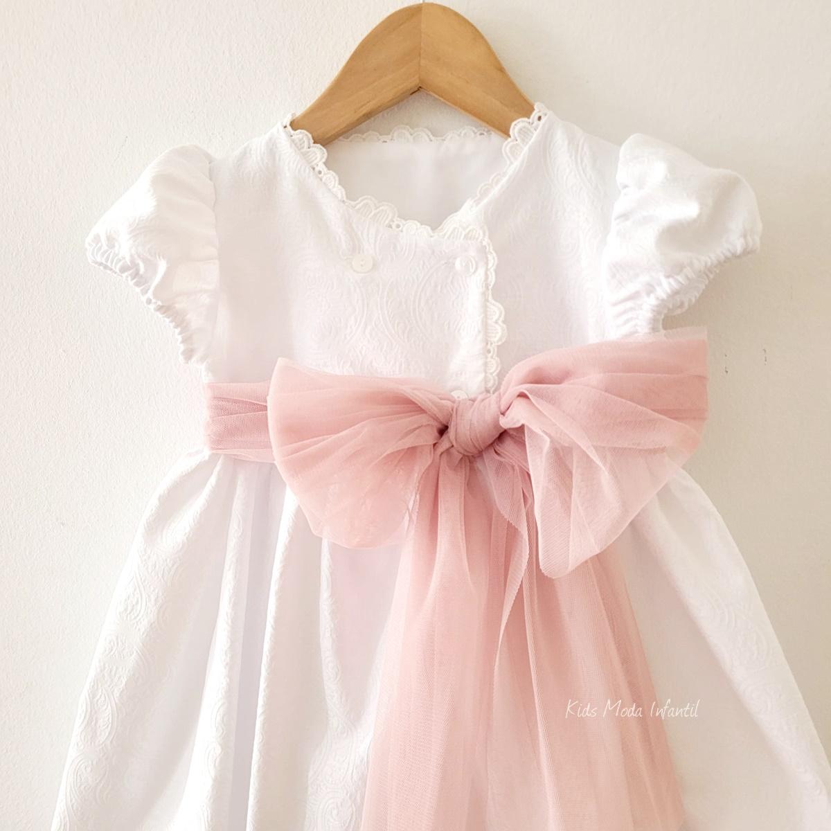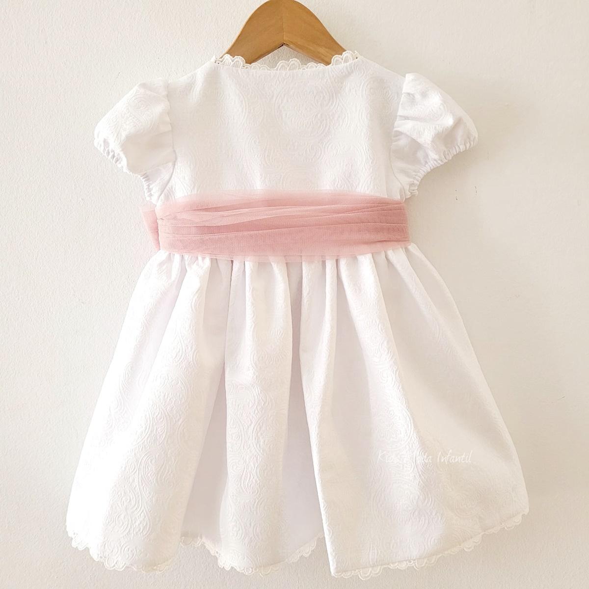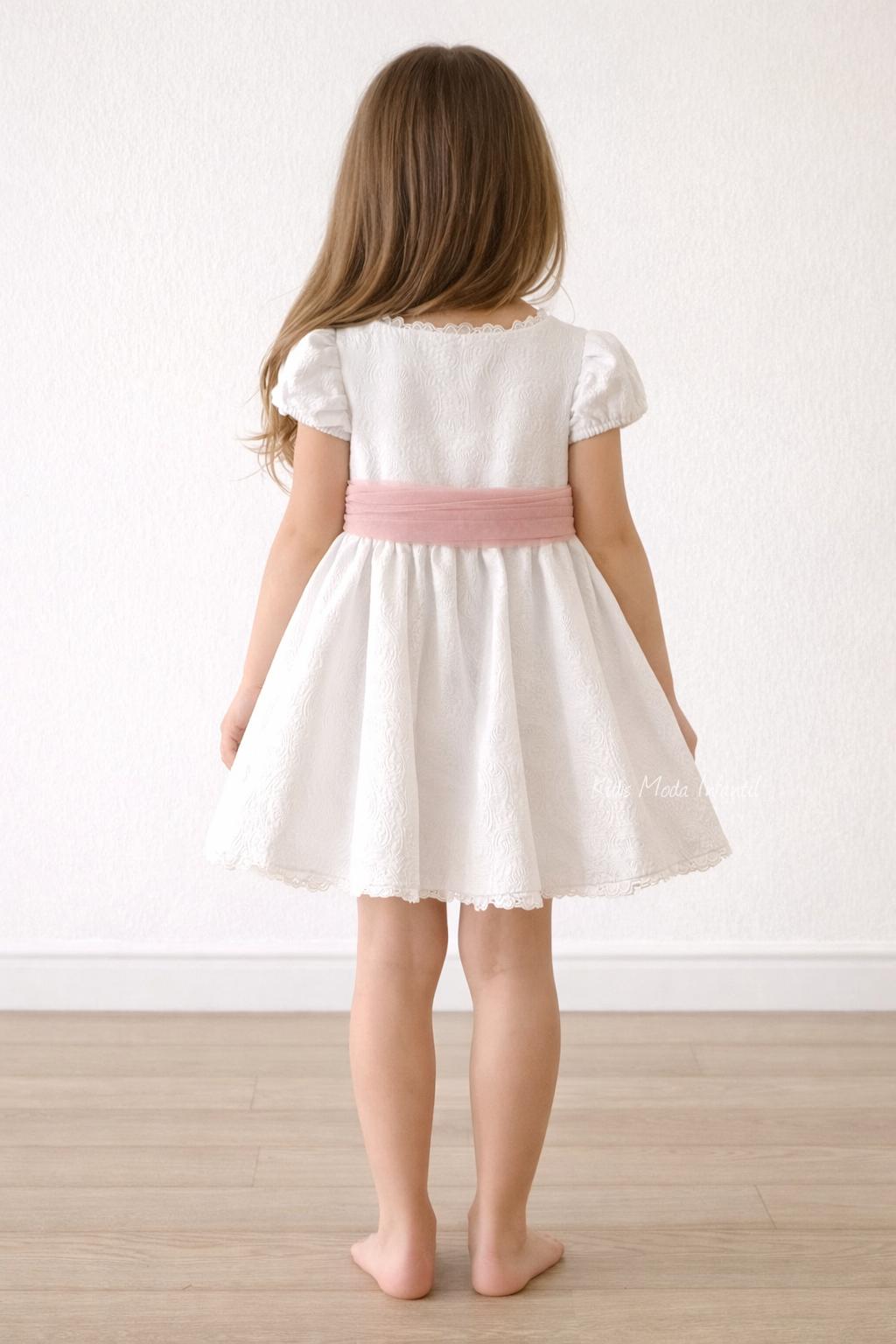 Vestido Ceremonia Arras para Niña en Jacquard Blanco con Fajín Rosa – Kids Moda Infantil