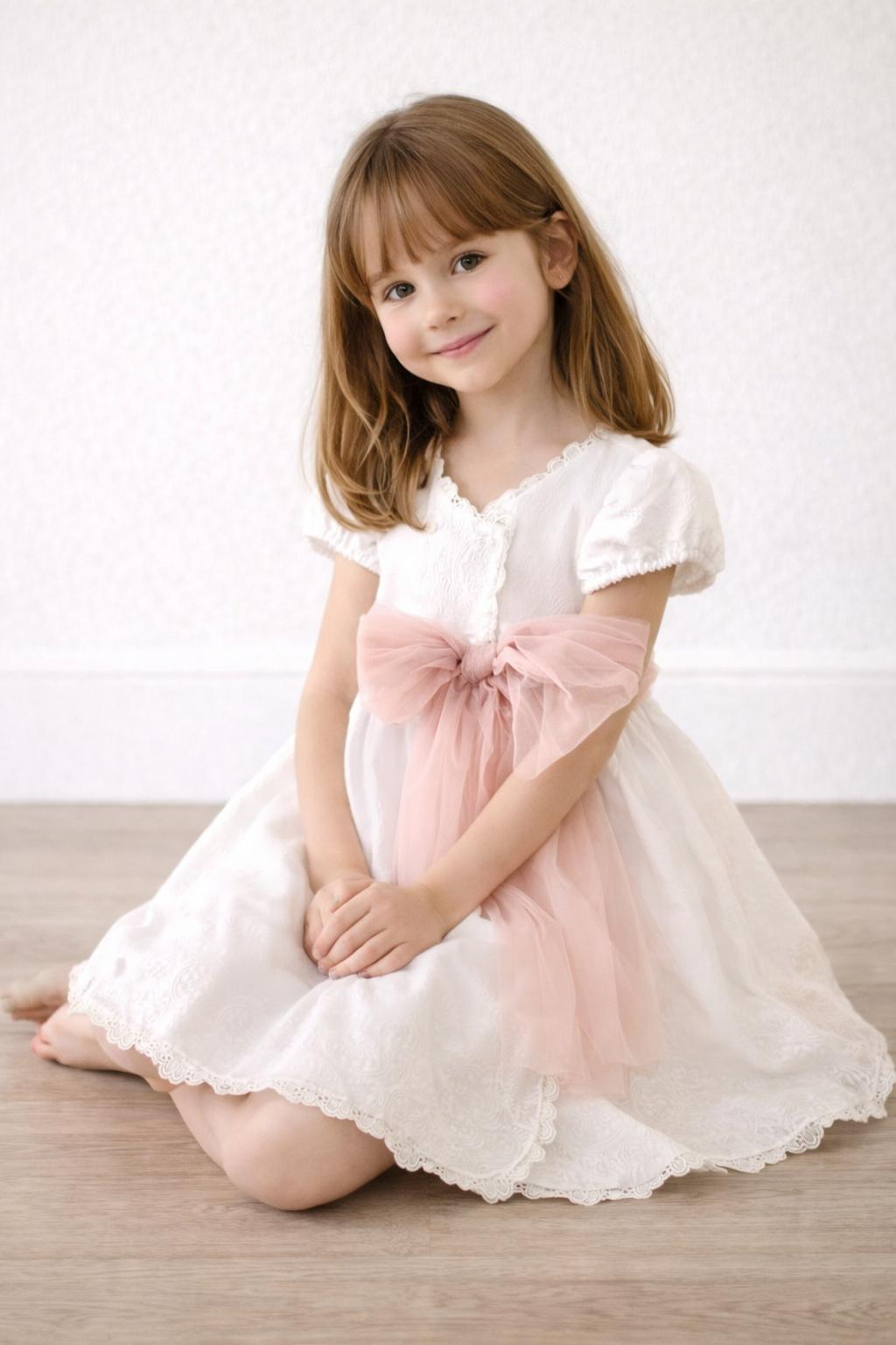 Elegante vestido ceremonia arras para niña en jacquard blanco con fajín de tul rosa empolvado. Ideal para bodas y eventos especiales. Colección 2026. En Largo cbg. Pertenece a la Colección Kids Moda Infantil, destacando por su estilo romántico y artesanal. Puede combinarse con los conjuntos de ceremonia y arras niño a juego, disponibles en las categorías conjuntos niño vestir y trajes ceremonia niño, perfectos para llevar a los hermanos conjuntados en celebraciones. Medidas en descripción.