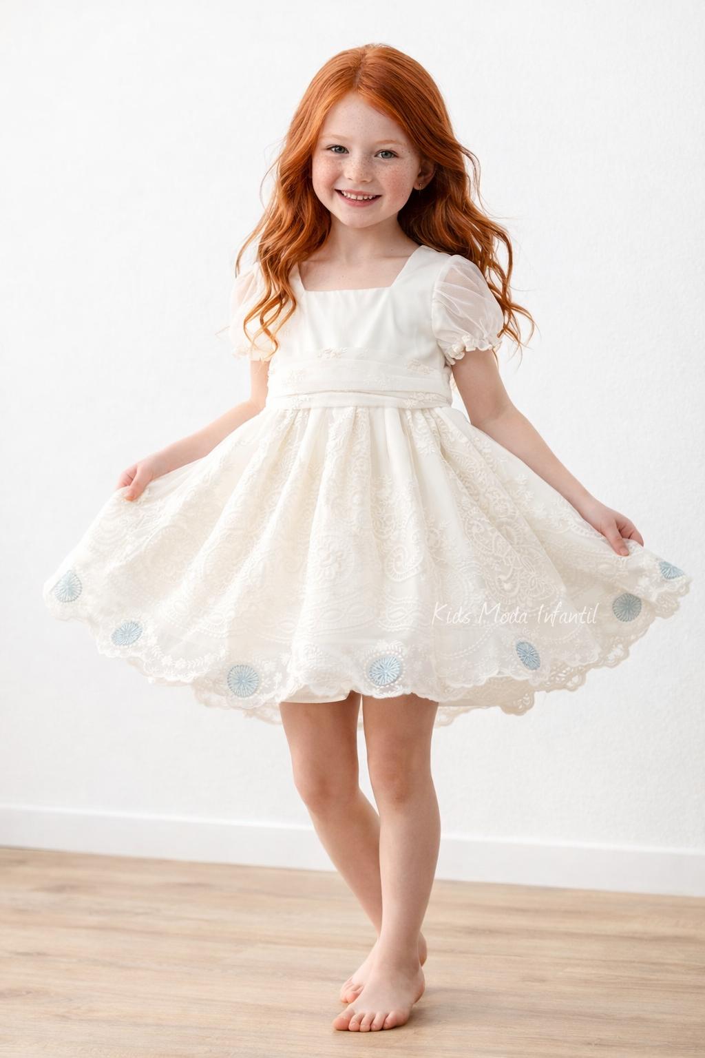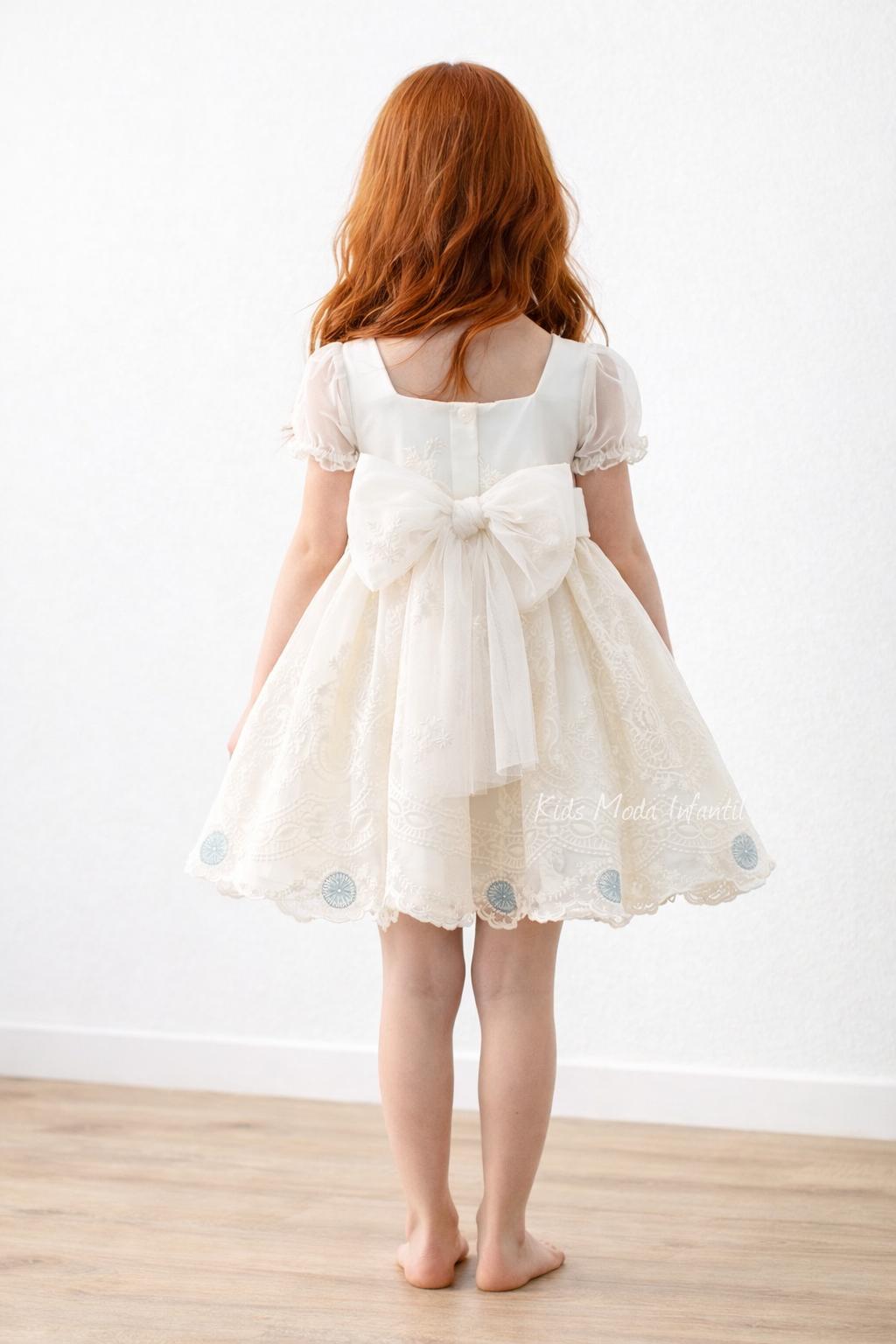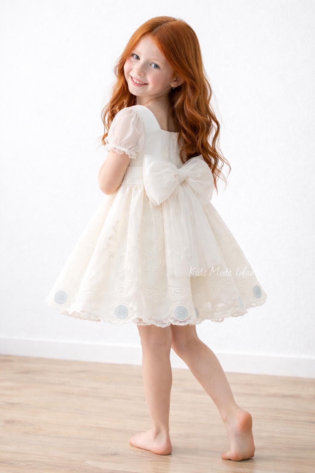 El diseño incluye mangas cortas de tul semitransparente y un favorecedor corte imperio que garantiza comodidad y libertad de movimiento. La falda con vuelo y bordado ornamental crea un efecto ligero y armonioso, realzando la silueta infantil con un estilo refinado y atemporal.