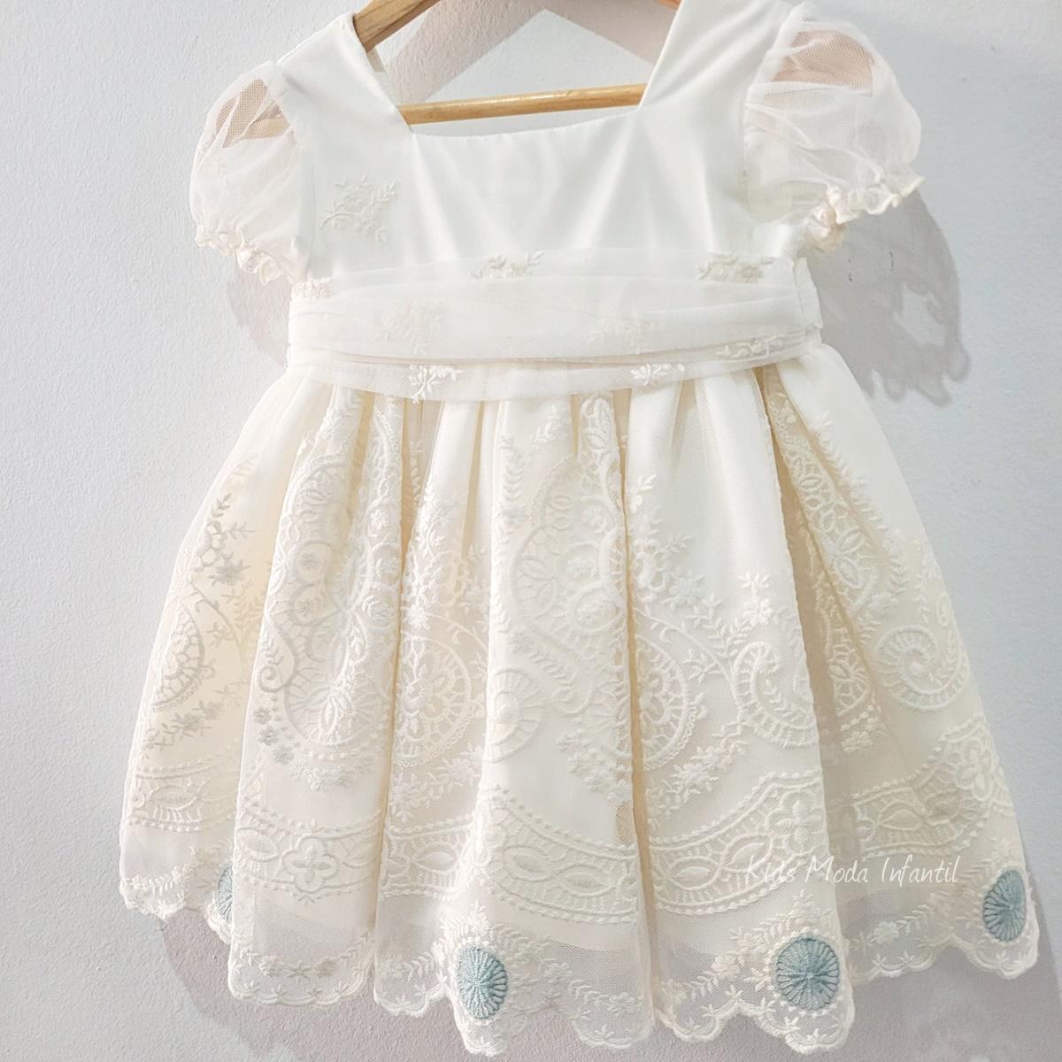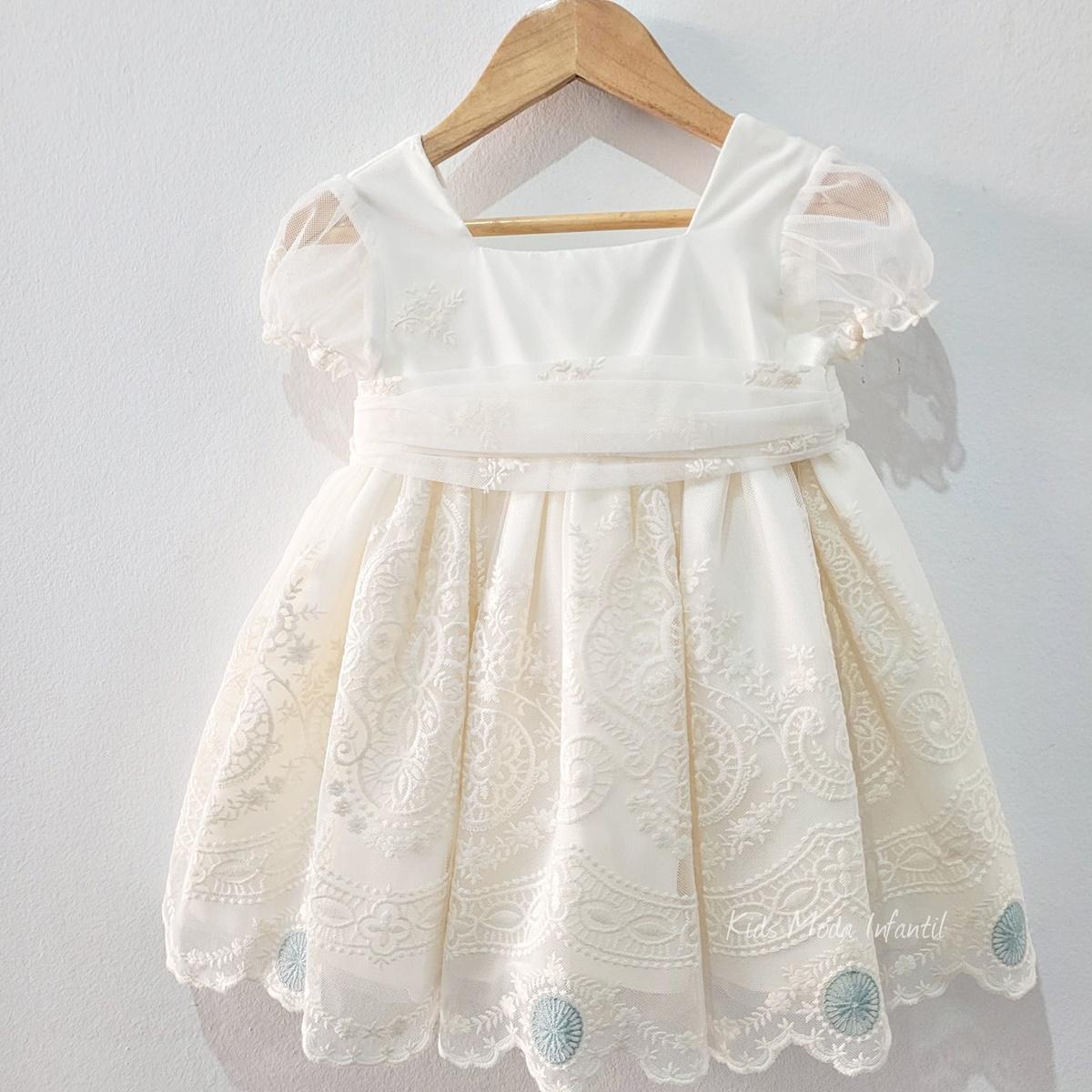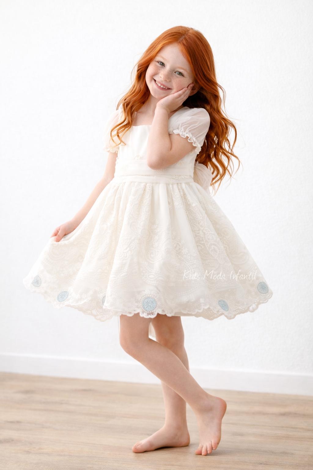 El diseño incluye mangas cortas de tul semitransparente y un favorecedor corte imperio que garantiza comodidad y libertad de movimiento. La falda con vuelo y bordado ornamental crea un efecto ligero y armonioso, realzando la silueta infantil con un estilo refinado y atemporal.