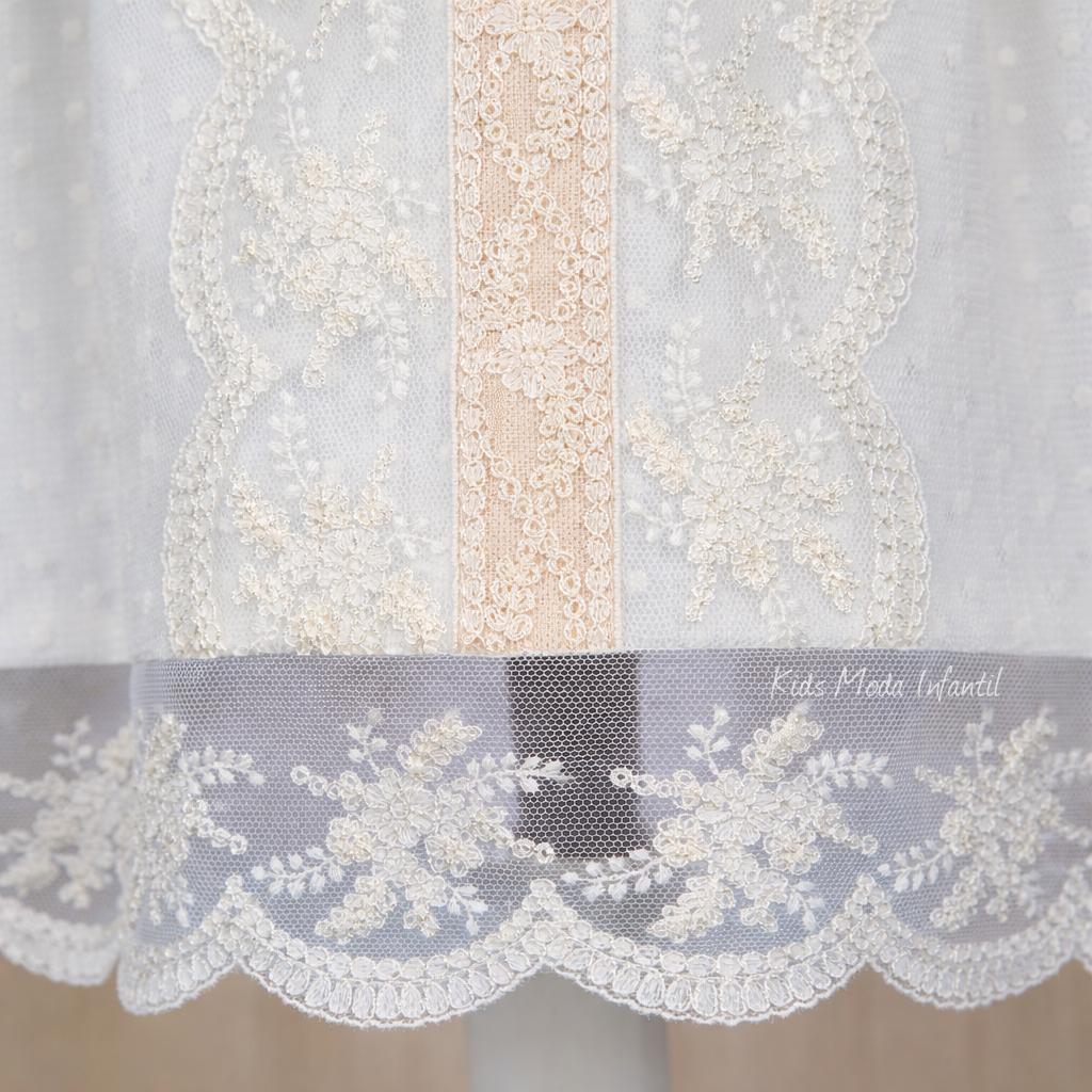 Este faldón de bautizo bebé de fabricación española está confeccionado en tul de topos en tono beige, un tejido ligero y vaporoso que aporta movimiento y una caída delicada. El diseño se completa con encajes finos cuidadosamente aplicados, aportando distinción y un acabado atemporal fiel a la tradición bautismal.