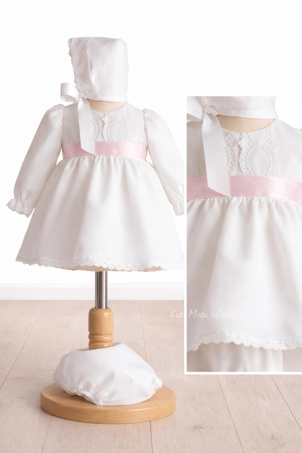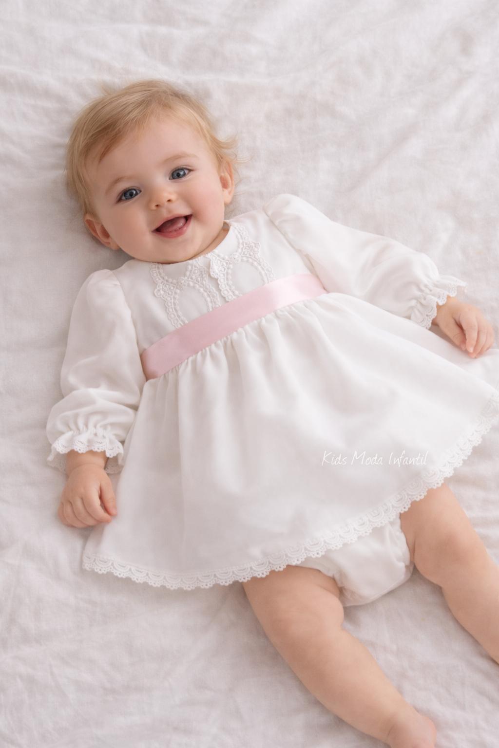 Jesusito de bautizo niña manga larga en gasa blanca con cinta rosa y braguita | Eva Martínez Artesanía – Familia 6
