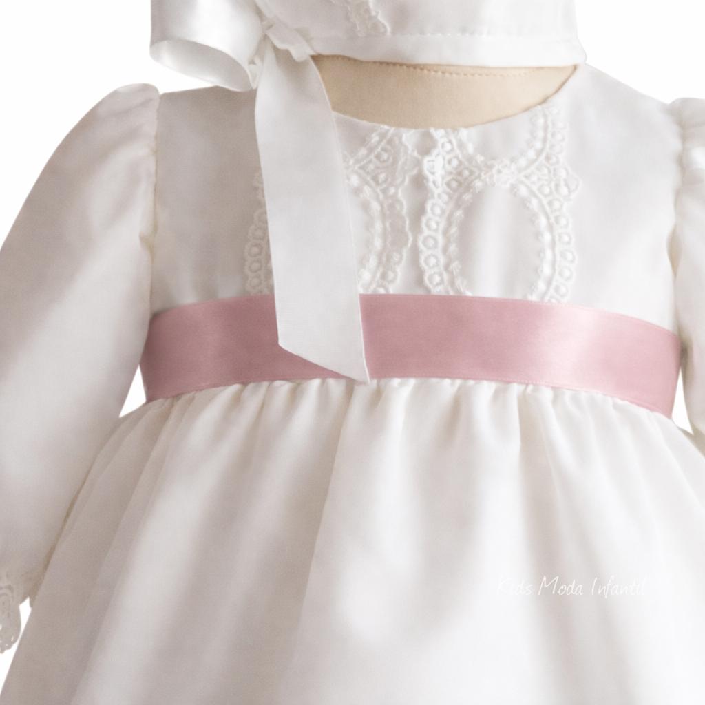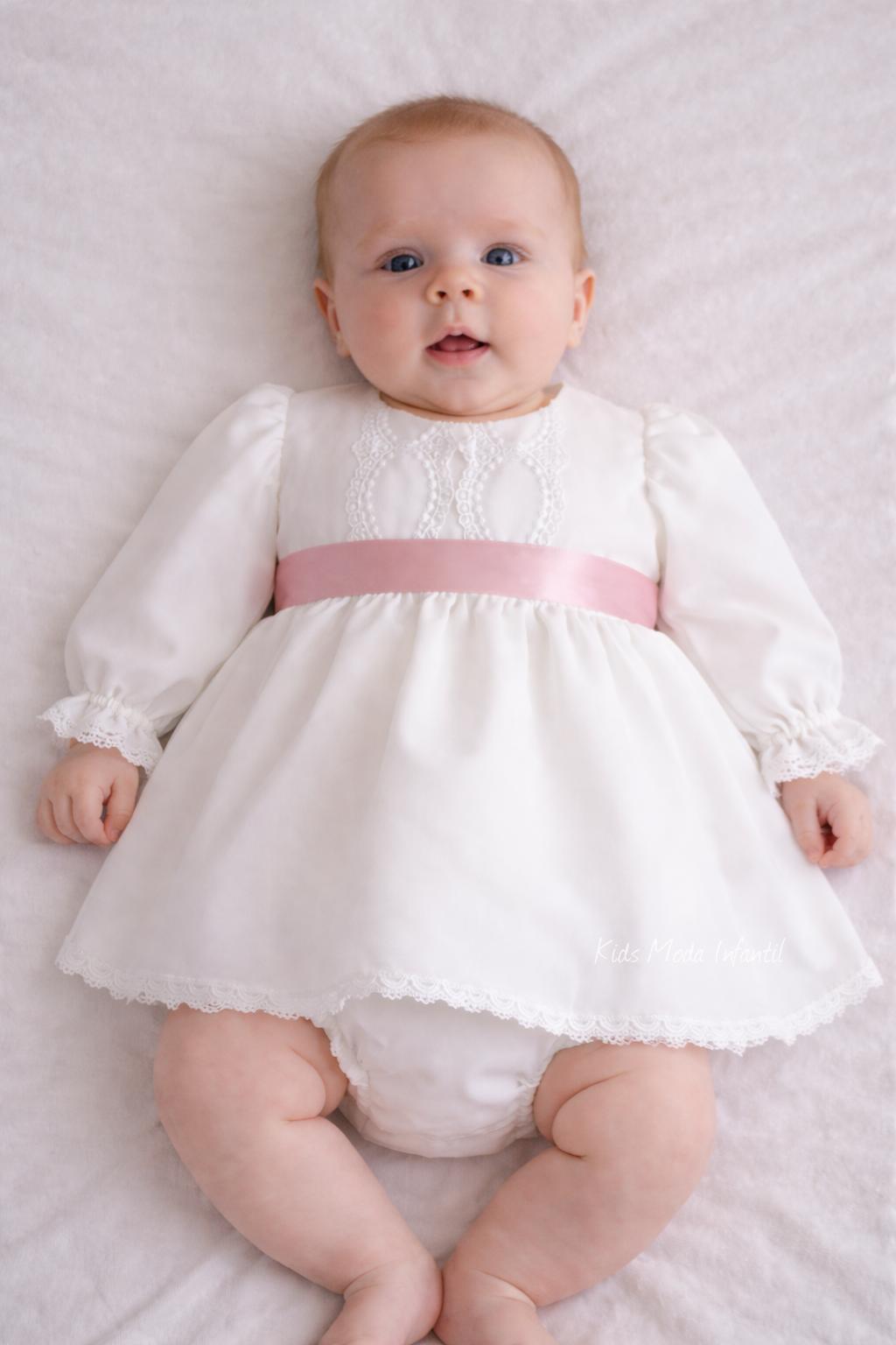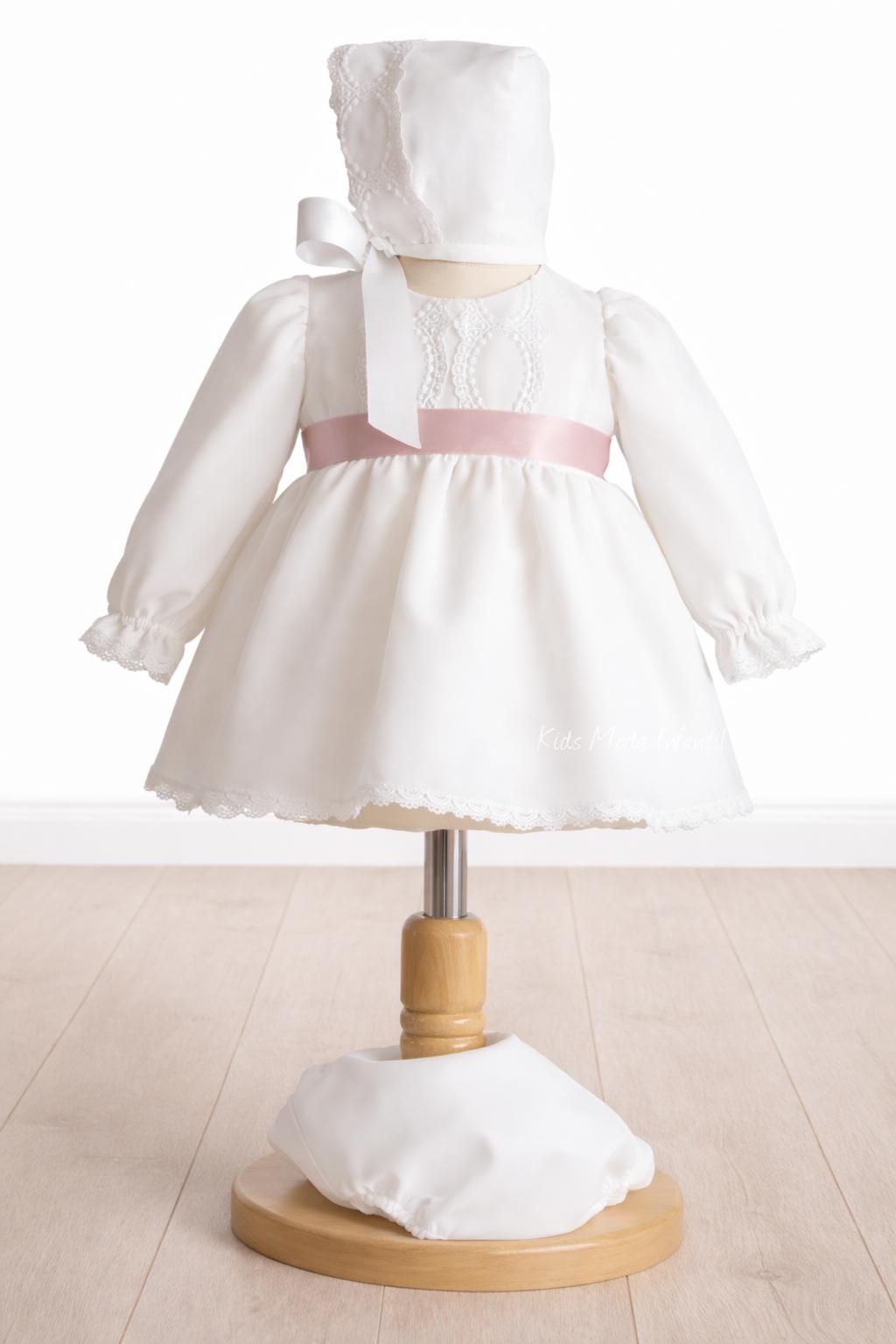 Jesusito de bautizo para niña de manga larga en gasa blanca con raso rosa empolvado | Eva Martínez Artesanía – Familia 6