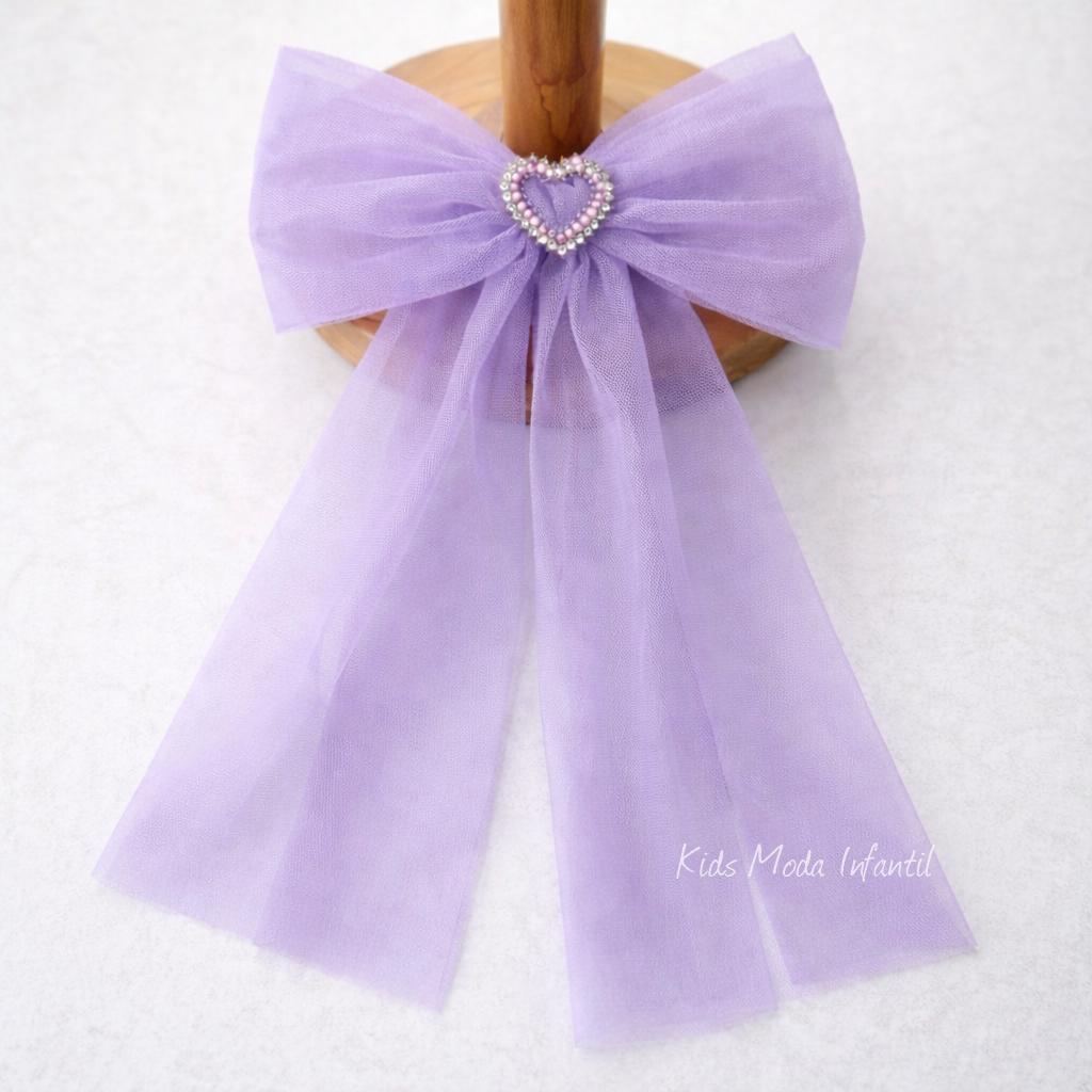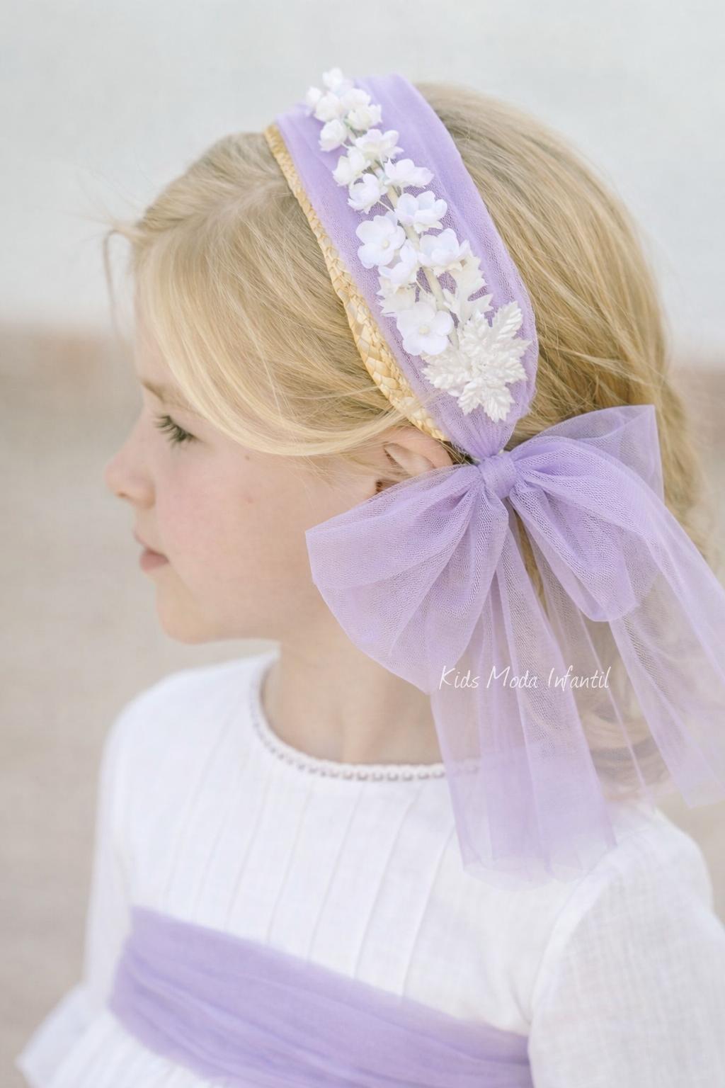 El conjunto se completa con un fajín de tul en tono lila, que ciñe la cintura y aporta un contraste suave y sofisticado al blanco roto del vestido. En la parte posterior, el fajín se convierte en una lazada amplia y vaporosa, uno de los elementos distintivos de la Familia 4 de la Colección Martina, aportando movimiento, ligereza y un toque romántico al diseño.
