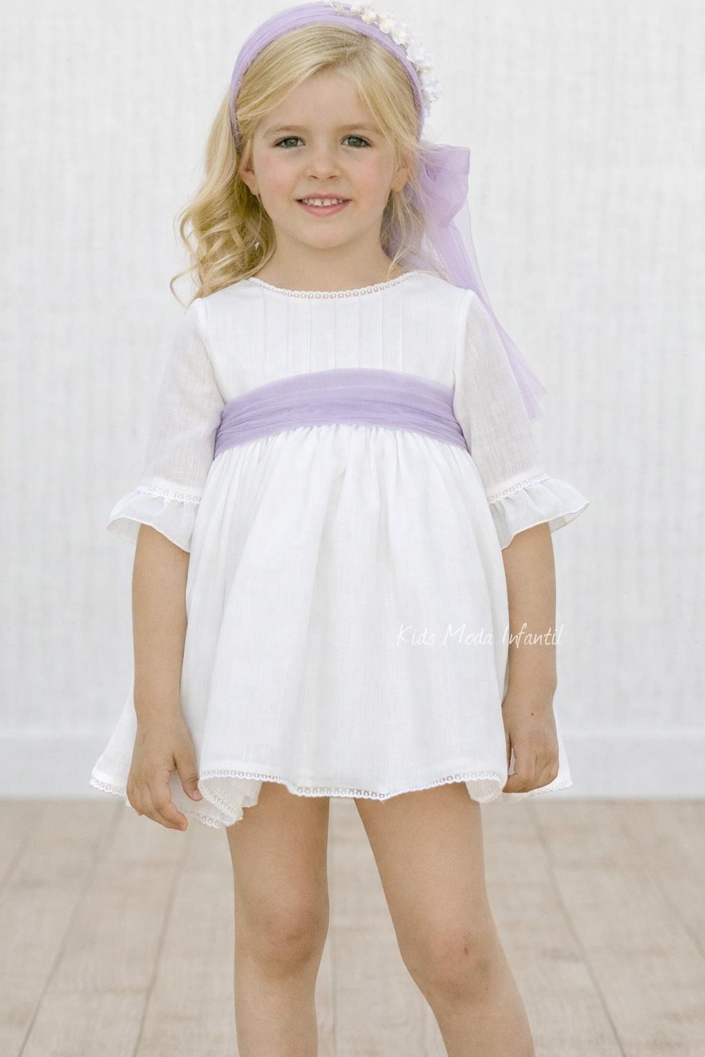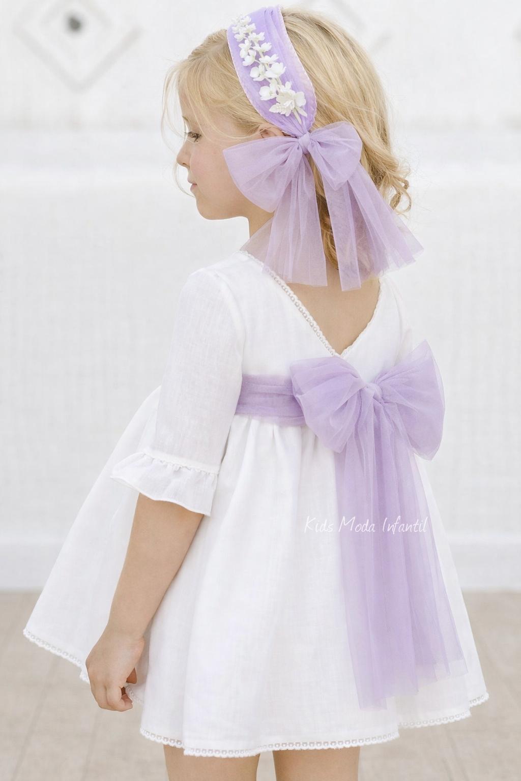 Vestido de ceremonia y arras para niña en blanco roto con fajín de tul lila | Eva Martínez Artesanía