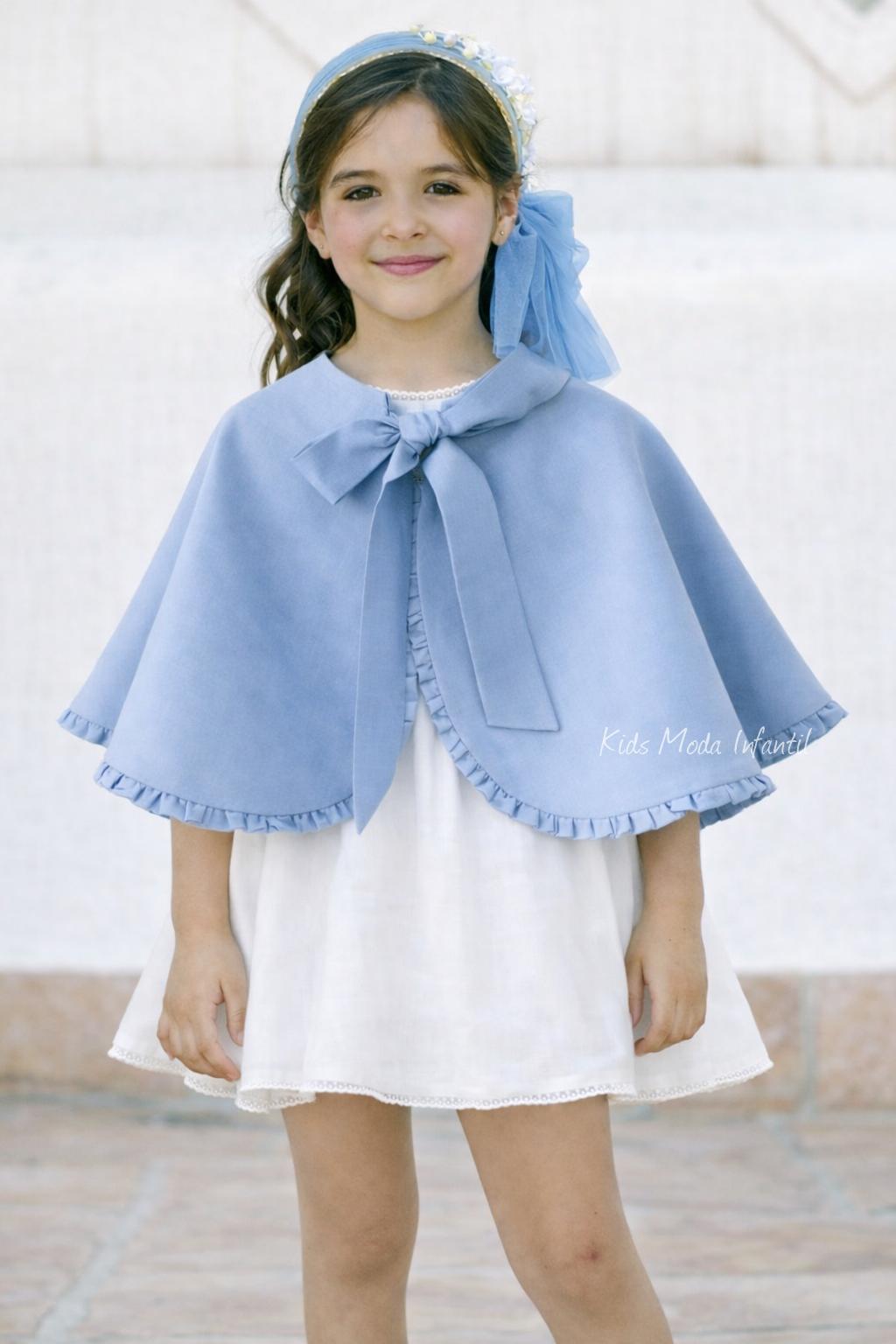 El cuerpo del vestido está realizado en un tejido rústico de tacto suave y natural, que aporta ligereza y una caída armoniosa, asegurando comodidad durante toda la celebración. Presenta manga francesa acabada en un delicado volante, un detalle que aporta dulzura y un aire romántico, muy representativo de la moda infantil de ceremonia.