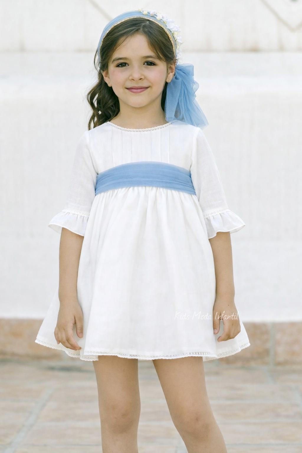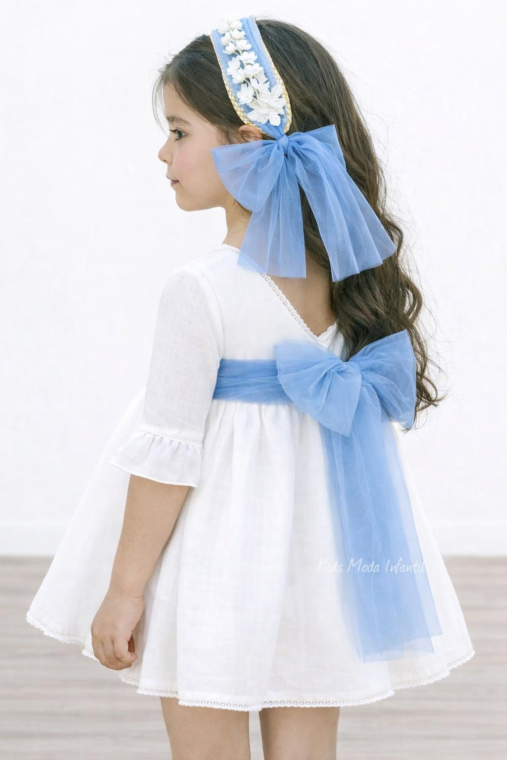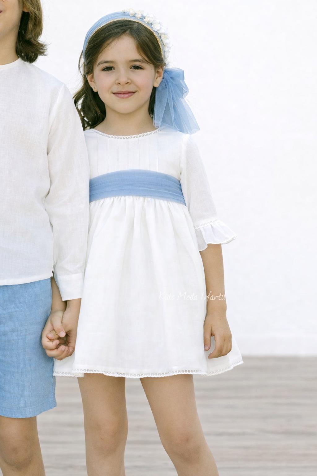 Vestido de ceremonia y arras para niña en tono blanco roto con fajín de tul azul celeste | Eva Martínez Artesanía
