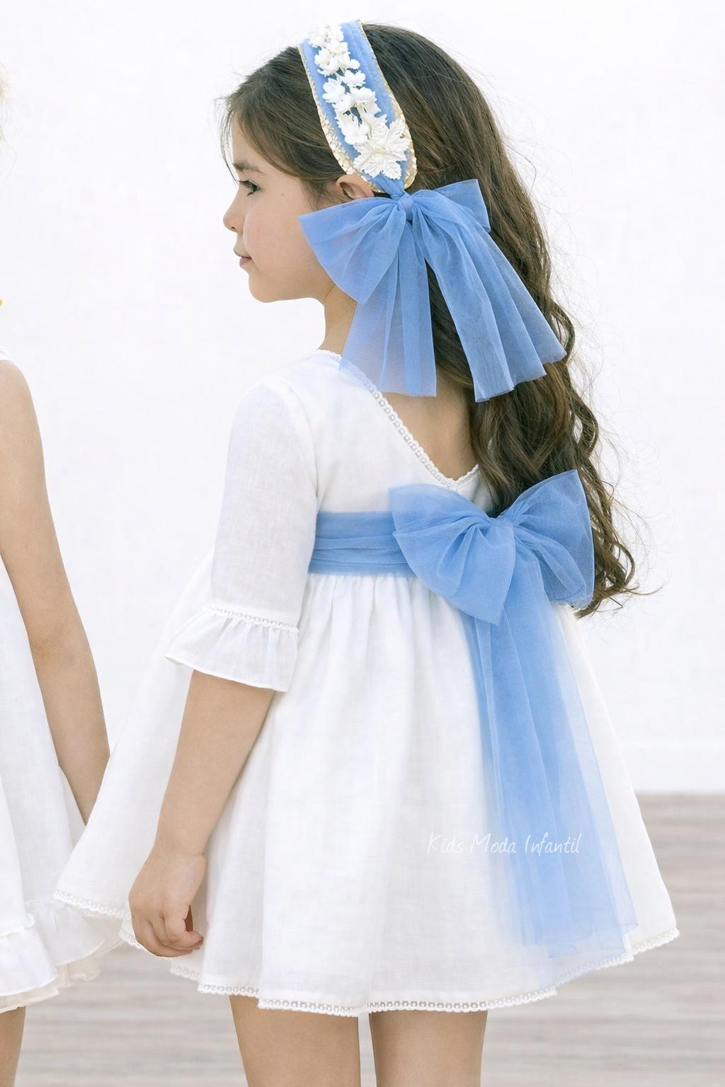 La cintura se define con un fajín de tul en color azul celeste, un tono fresco y luminoso que crea un contraste suave y armonioso con el blanco roto del vestido. En la espalda, el fajín da lugar a una lazada amplia y vaporosa, uno de los elementos más característicos de la Familia 4 de la Colección Martina, aportando movimiento y un acabado romántico al conjunto.