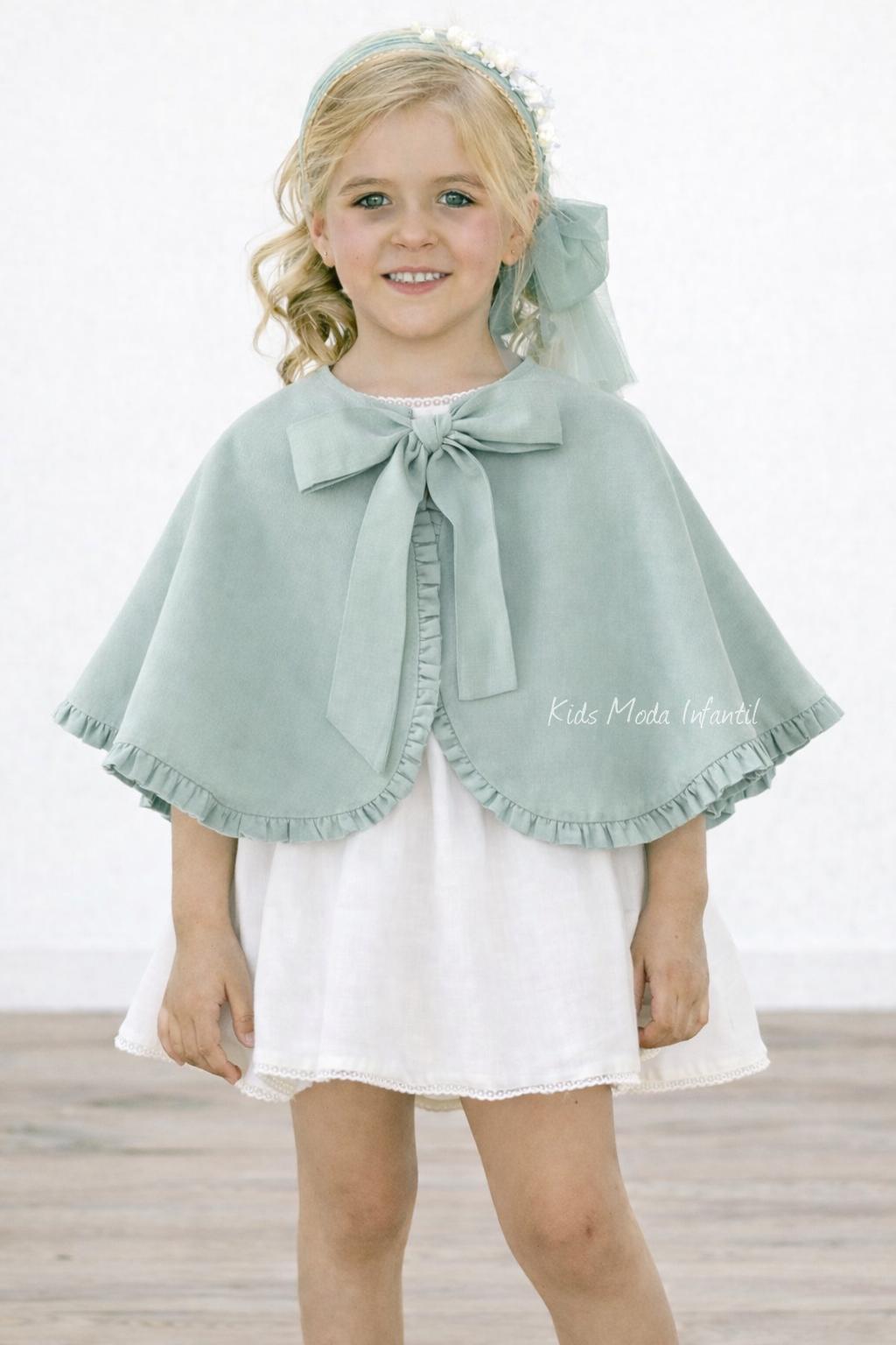 El cuerpo del vestido está elaborado en un tejido rústico de textura suave y agradable al tacto, que aporta ligereza y una caída fluida, garantizando comodidad durante toda la celebración. Incorpora manga francesa con un fino volante en el remate, un detalle sutil que aporta dulzura y un aire romántico, característico de la moda infantil de ceremonia.