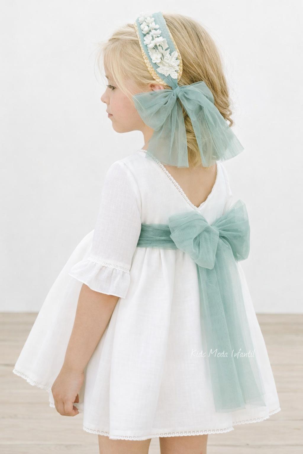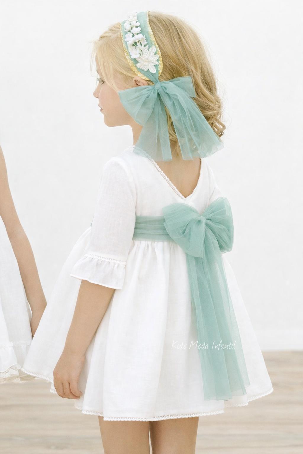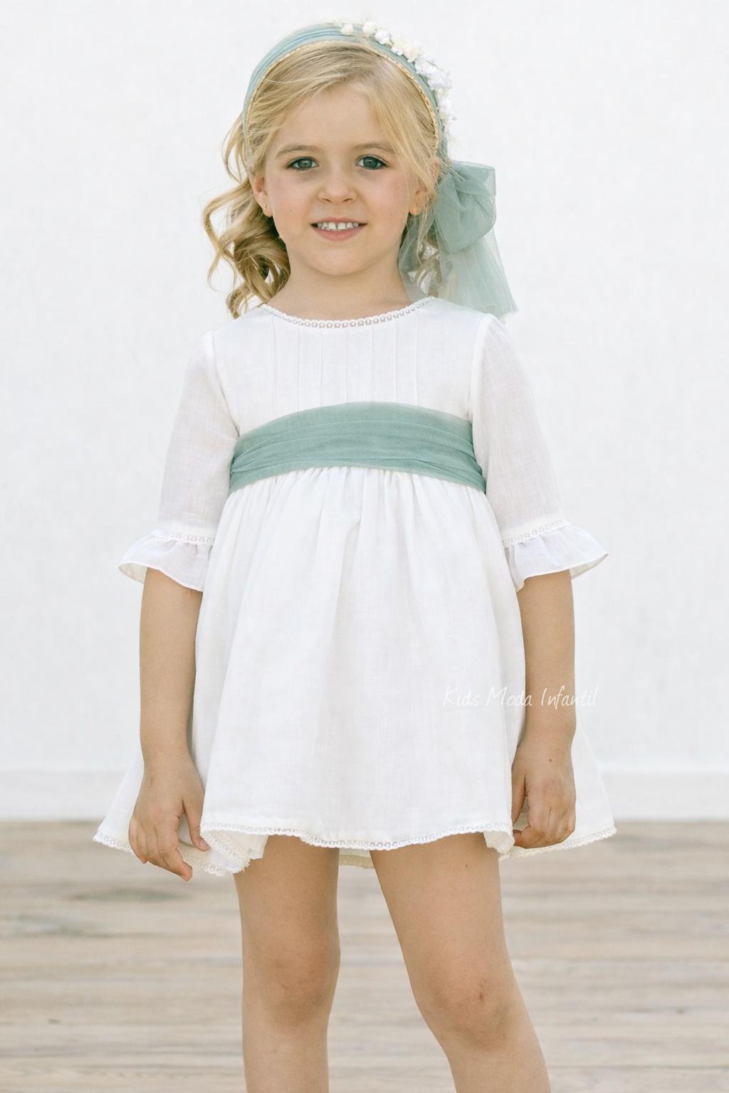 Vestido infantil de ceremonia y arras confeccionado en tejido rústico blanco roto, con manga francesa y elegante fajín de tul verde empolvado. Diseño artesanal de la Colección Martina de Eva Martínez Artesanía. Incluye braga hasta talla 4 años y largura CBG. Puede combinarse con los conjuntos de ceremonia y arras niño a juego, disponibles en las categorías conjuntos niño vestir y trajes ceremonia niño, perfectos para llevar a los hermanos conjuntados en celebraciones. Medidas en descripción.