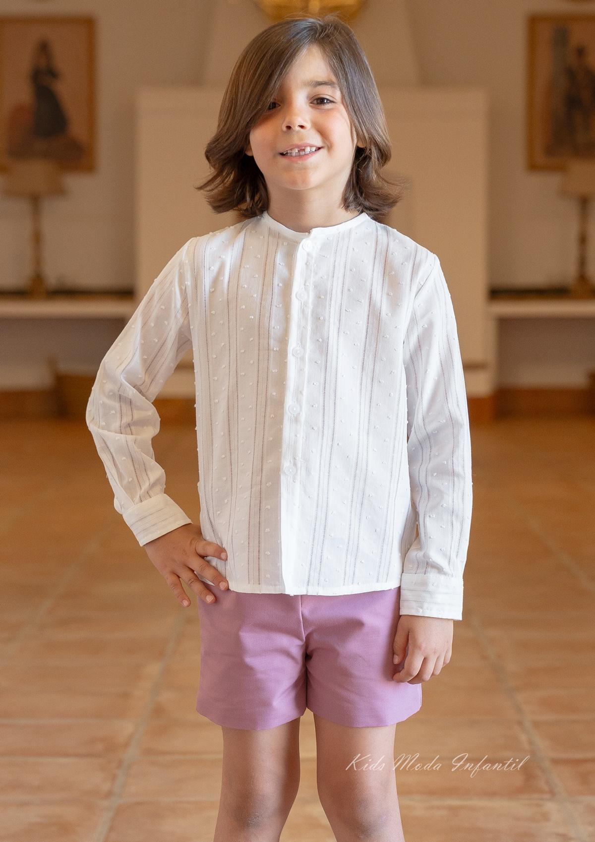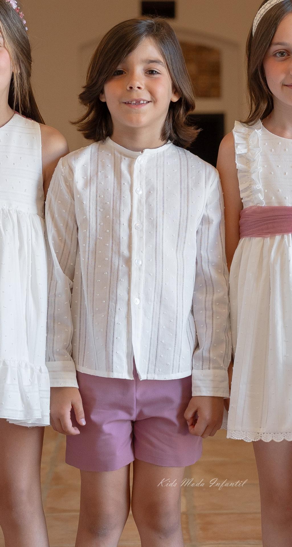 Conjunto de ceremonia para niño Familia 6 con camisa de plumeti calado blanco roto y pantalón de sarga rosa viejo con cintura ajustable. Eva Martínez Artesanía.