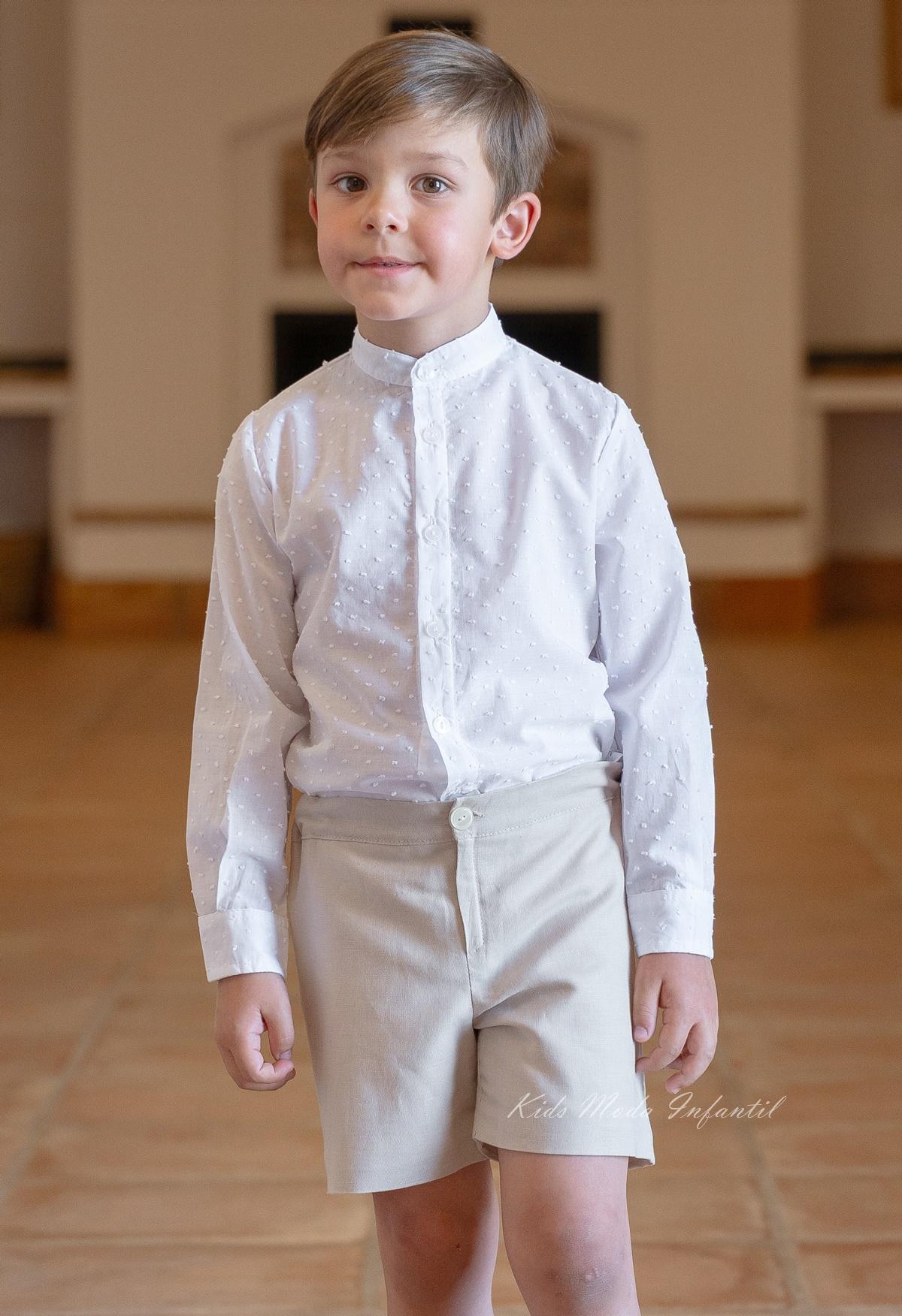 Conjunto ceremonia niño con camisa plumeti blanca y pantalón de lino camel. Diseño de Eva Martínez Artesanía, Colección Mía – Familia 7. Elegante, cómodo y perfecto para arras y eventos especiales.
