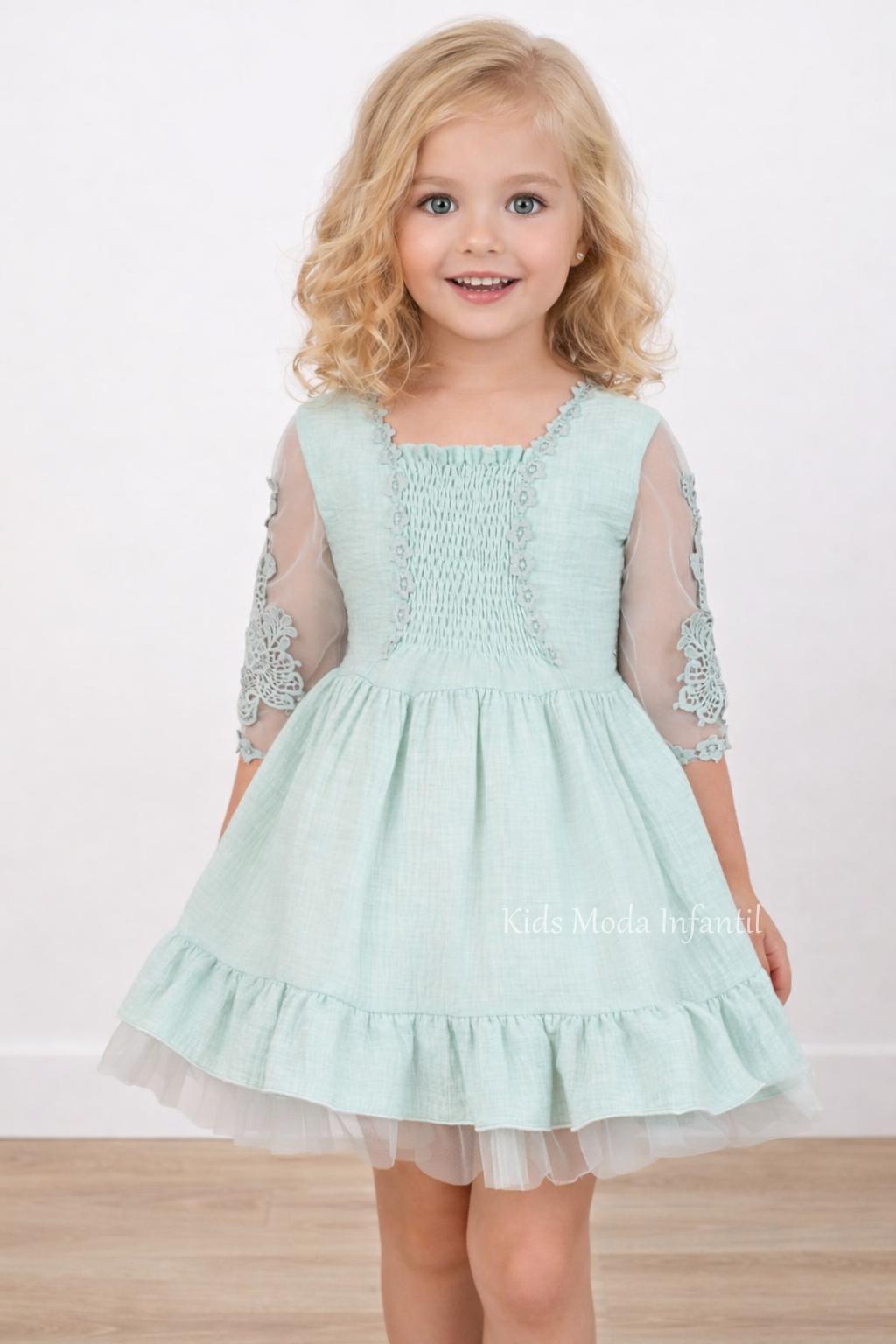 Elegante vestido ceremonia niña verde agua de Nekenia, con mangas de tul bordadas, espalda en V y falda con vuelo. Ideal para arras, bodas y eventos especiales.