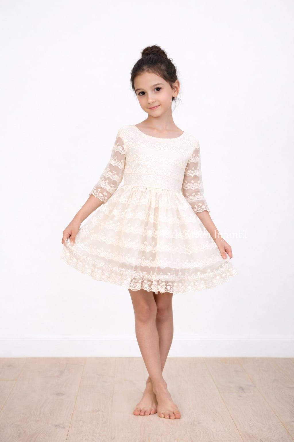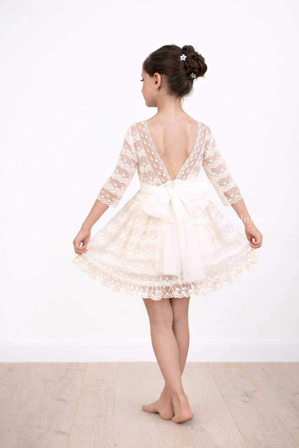 Elegante vestido ceremonia niña crudo en encaje y tul, con espalda en V, manga francesa y falda con vuelo. Perfecto para arras, bodas y eventos especiales.