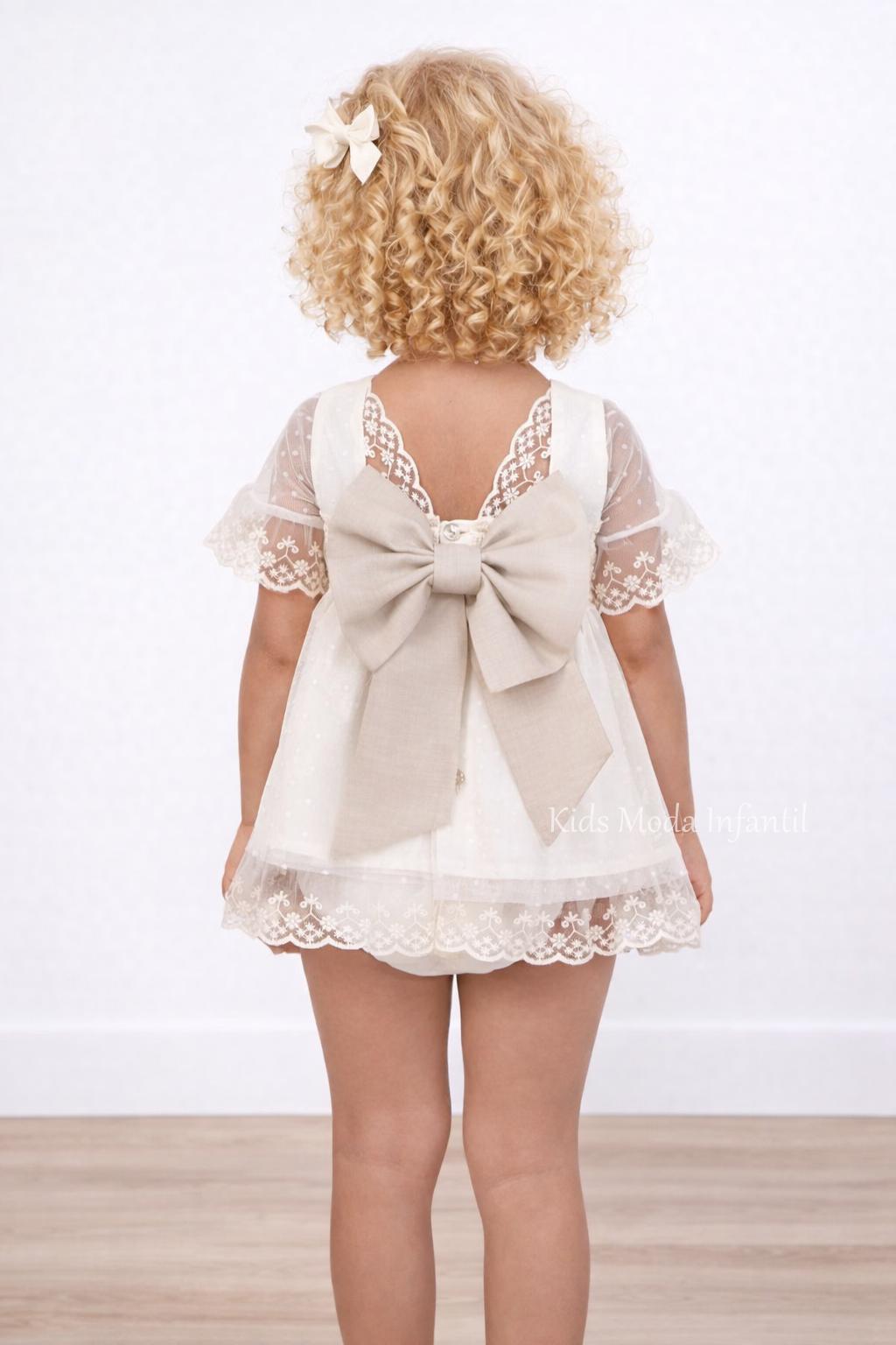 Elegante jesusito ceremonia bebé niña crudo en tul plumeti y encaje, con lazo trasero y braguita a juego. Perfecto para arras, bodas y eventos especiales.