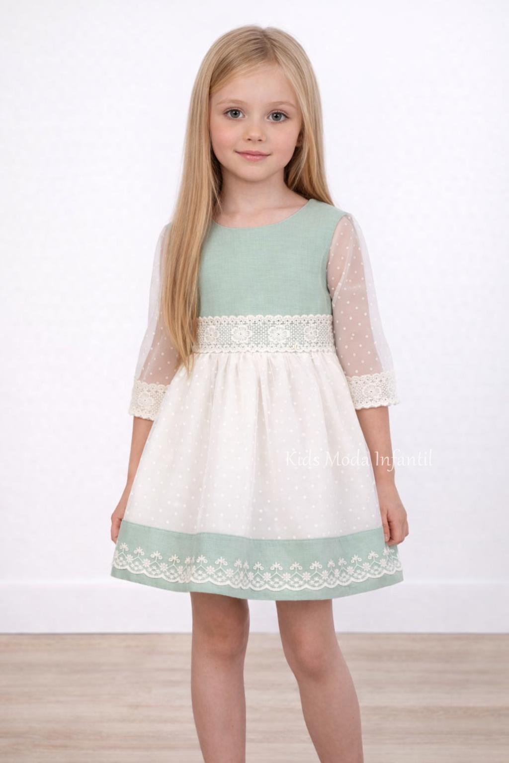 Precioso vestido de ceremonia y arras para niña en color verde agua, confeccionado en delicado tejido de tul plumeti, lino suave y encaje bordado, ideal para bodas, bautizos, comuniones y celebraciones especiales.