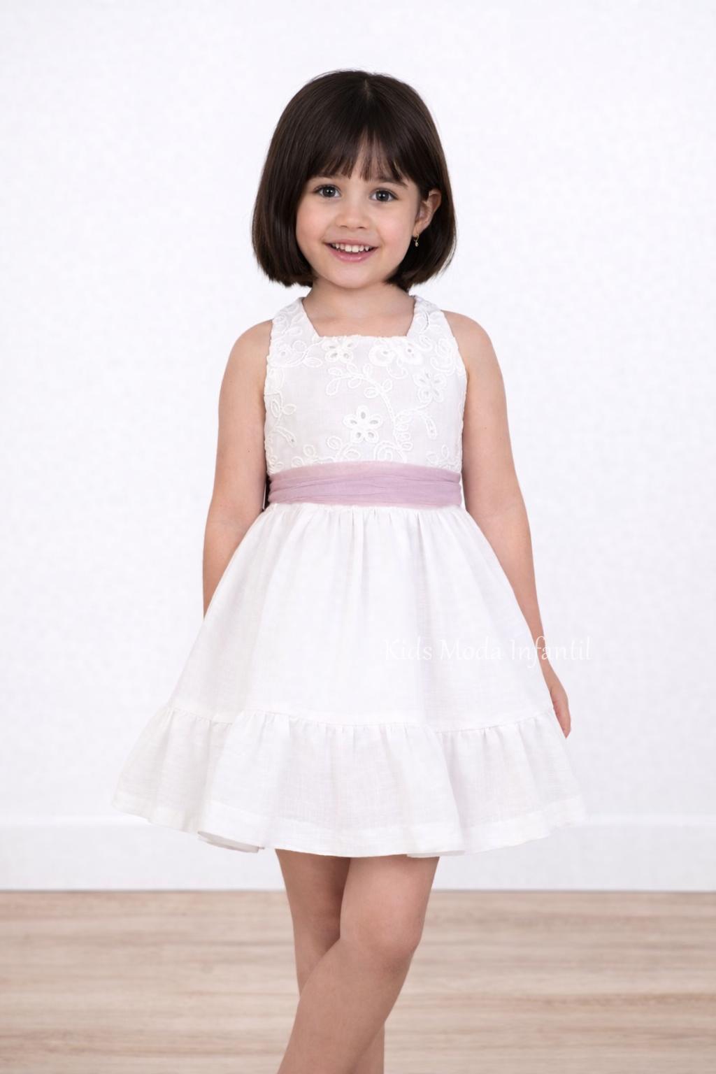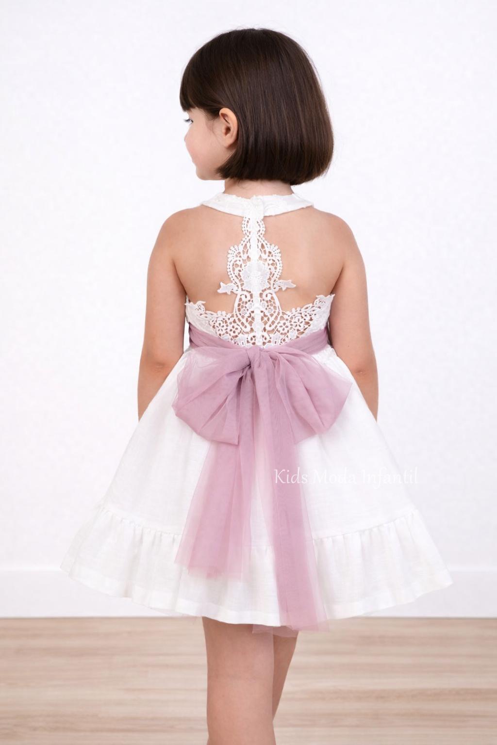 Elegante vestido ceremonia niña blanco con fajín rosa empolvado en lino, tul y encaje, con espalda ornamental y lazo trasero. Ideal para eventos especiales.