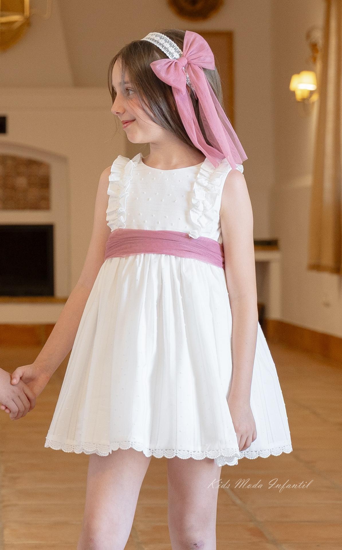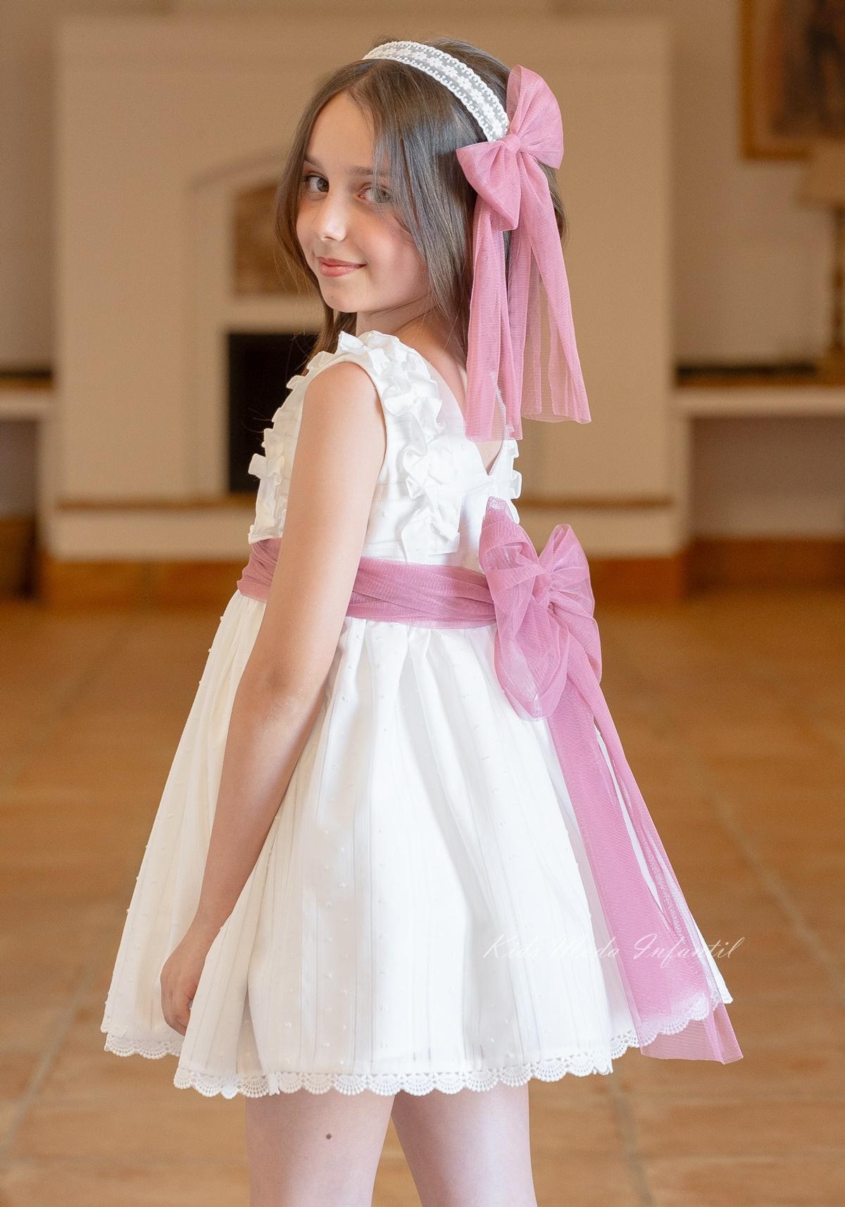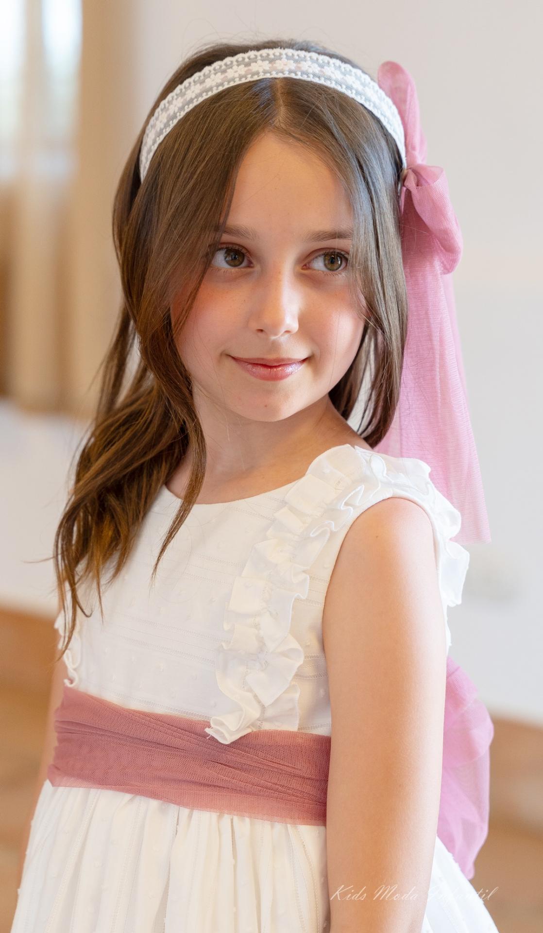 Este exclusivo accesorio artesanal para niña combina una fina banda de puntilla bordada beige, de inspiración clásica y romántica, con un sofisticado lazo de tul en rosa fuerte, que aporta un toque moderno, dulce y lleno de personalidad.