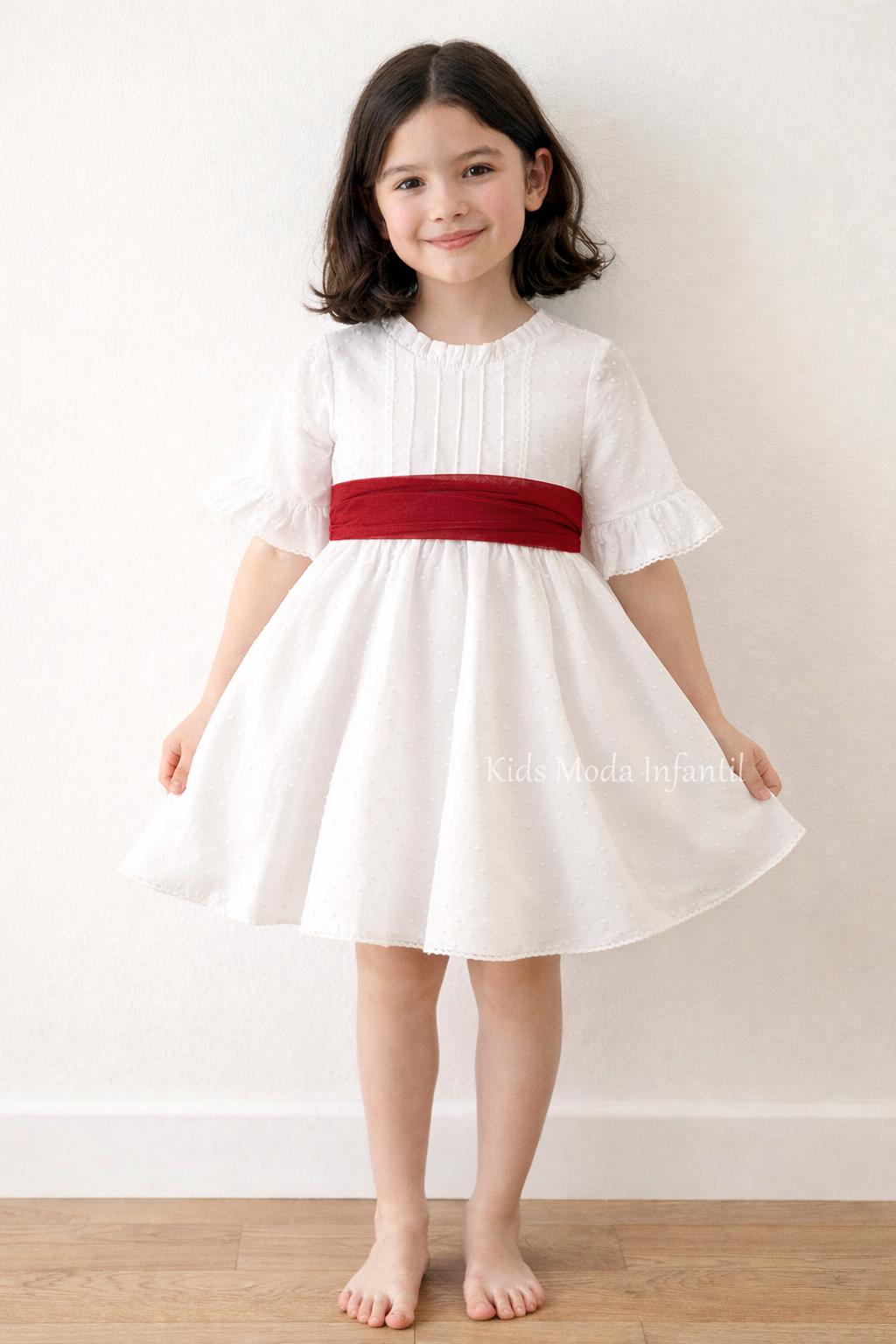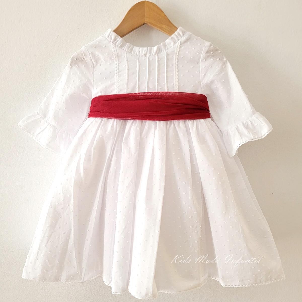 Elegante vestido de ceremonia y arras para niña en plumeti blanco con fajín de tul burdeos, con media manga y acabado sofisticado. Un exclusivo vestido infantil de ceremonia, ideal para bodas, arras, bautizos y celebraciones especiales.