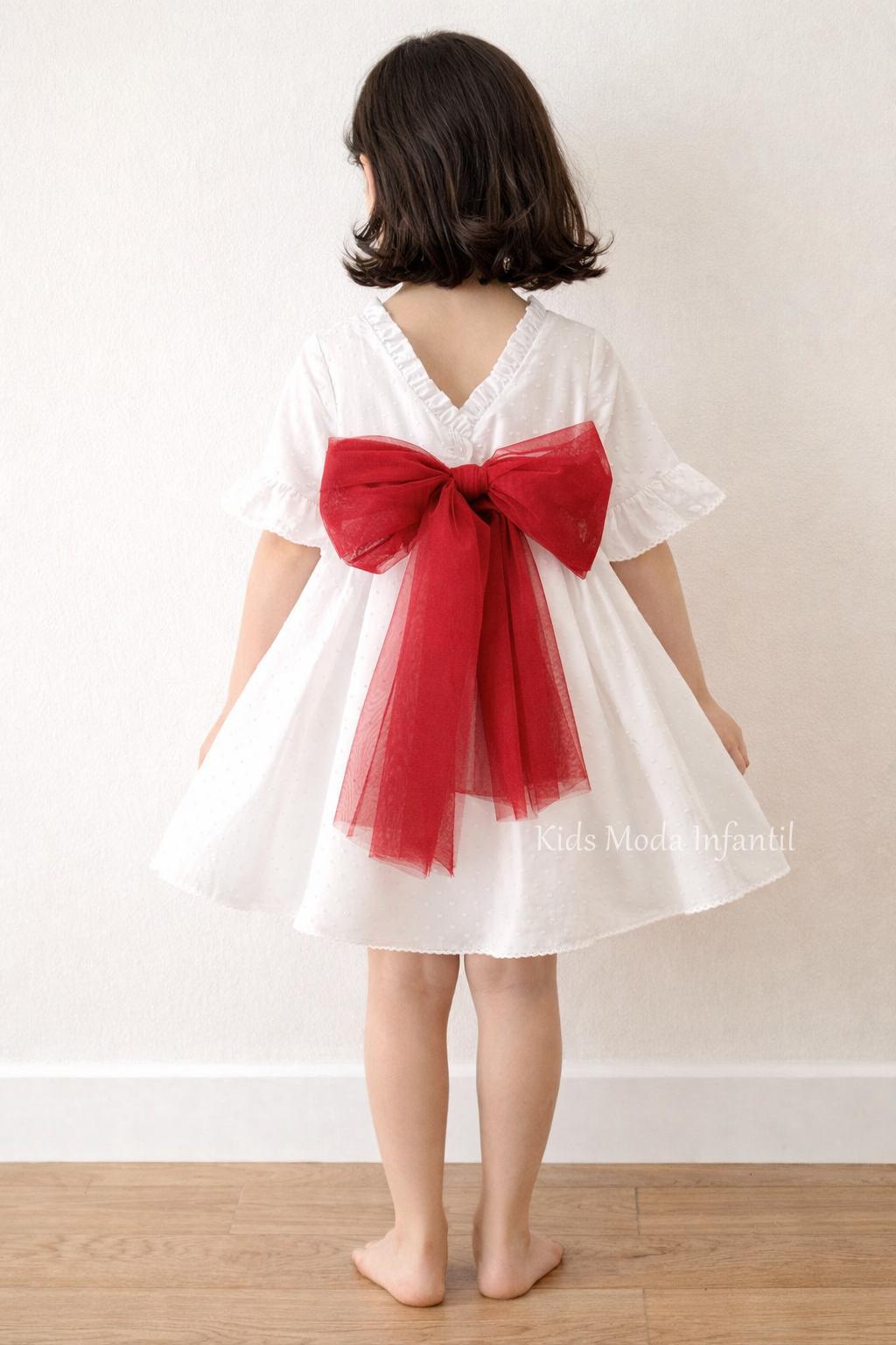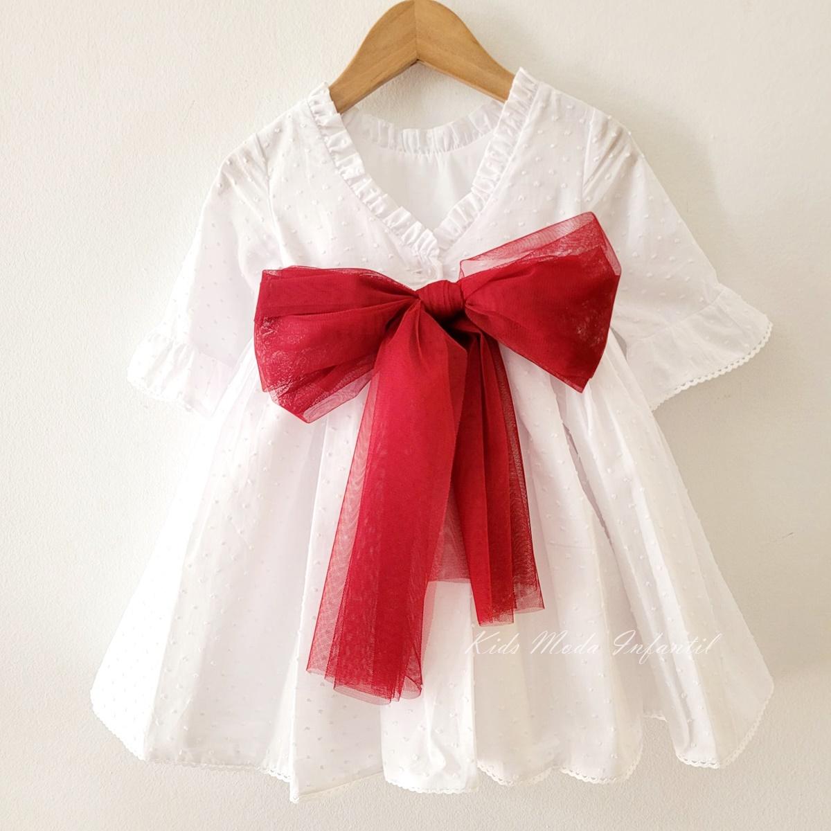Vestido Ceremonia y Arras Niña Plumeti Blanco Tul Burdeos – Familia 7 | Eva Martínez Artesanía