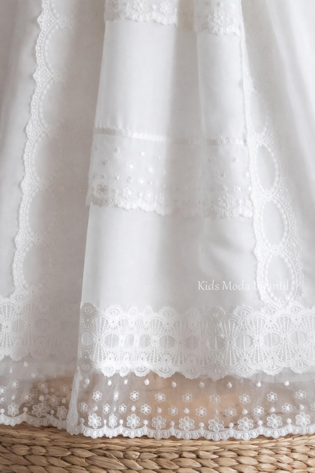 La delicada gasa blanca se realza con una refinada pechera de jaretas y elegantes puntillas bordadas en falda y bajo, logrando un acabado armonioso y sofisticado. Este modelo, conocido también como Baton Bautizo bebe, es ideal para familias que buscan tradición y exclusividad.