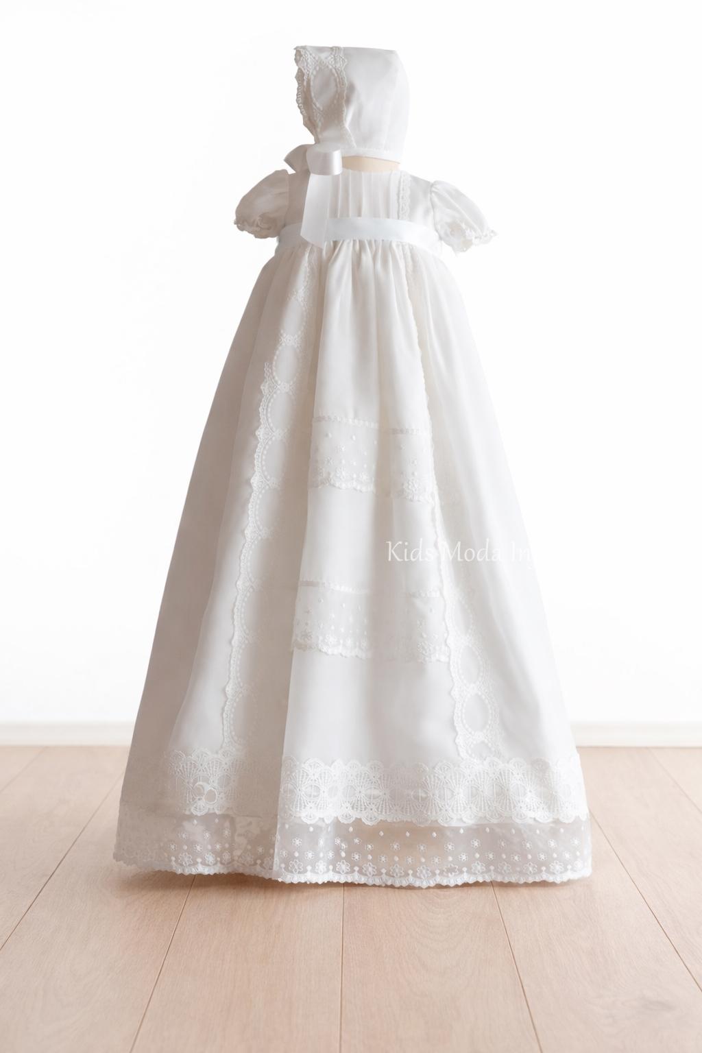 FALDÓN DE BAUTIZO PARA BEBÉ EN GASA BLANCA CON CINTA BLANCA MANGA CORTA – FAMILIA 6