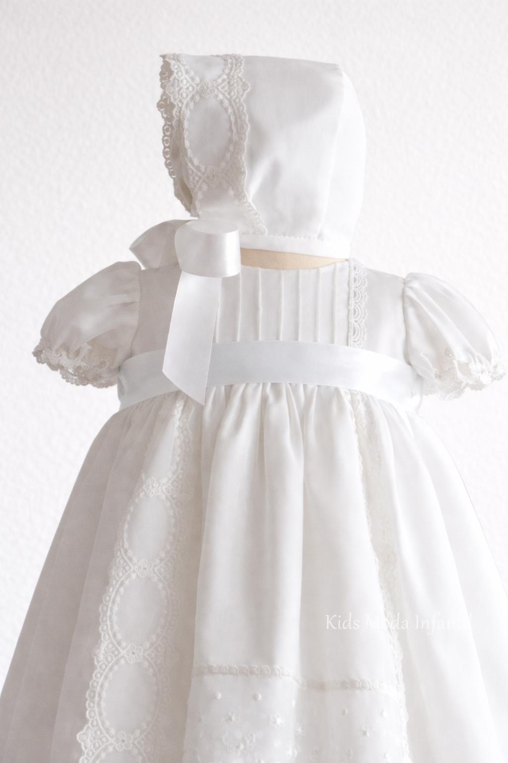 Confeccionado en delicado tejido de gasa blanca, con cuello redondeado, cuerpo de jaretas y puntillas bordadas, luce fajín de raso blanco y cierre trasero con botones para mayor comodidad del bebé.